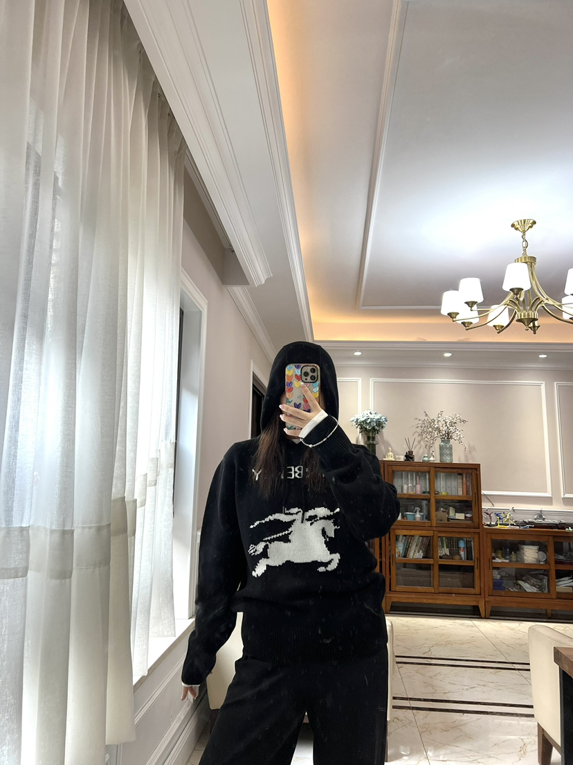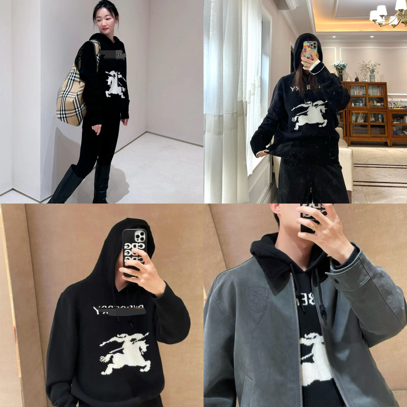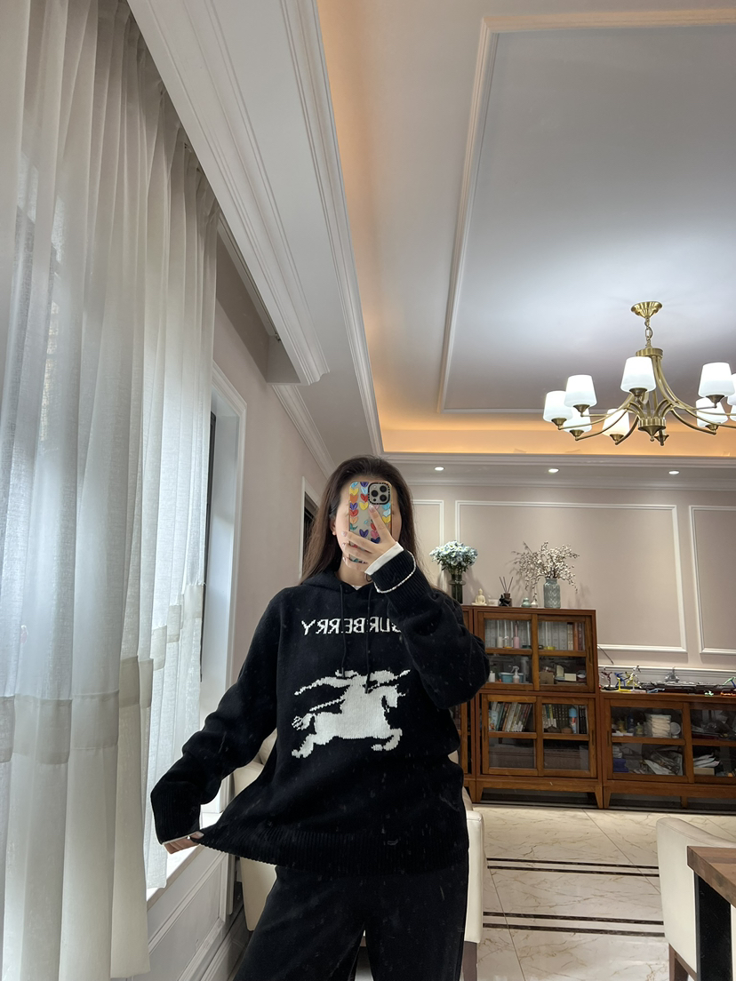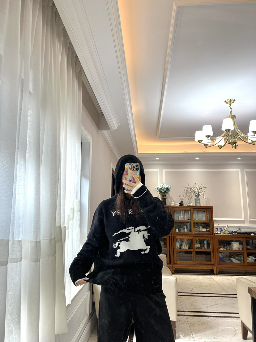 1218-3 独家圆正 BBR黑色羊毛羊绒 徽标字母 骑士战马 情侣款 连帽针织衫