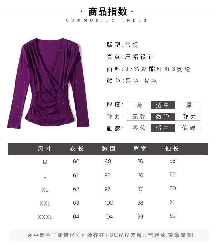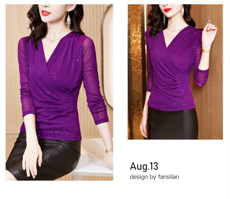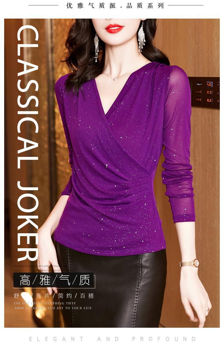 新款交叉V领纯色网纱T恤,亮粉修身显瘦长袖网纱打底衫KQL-2332