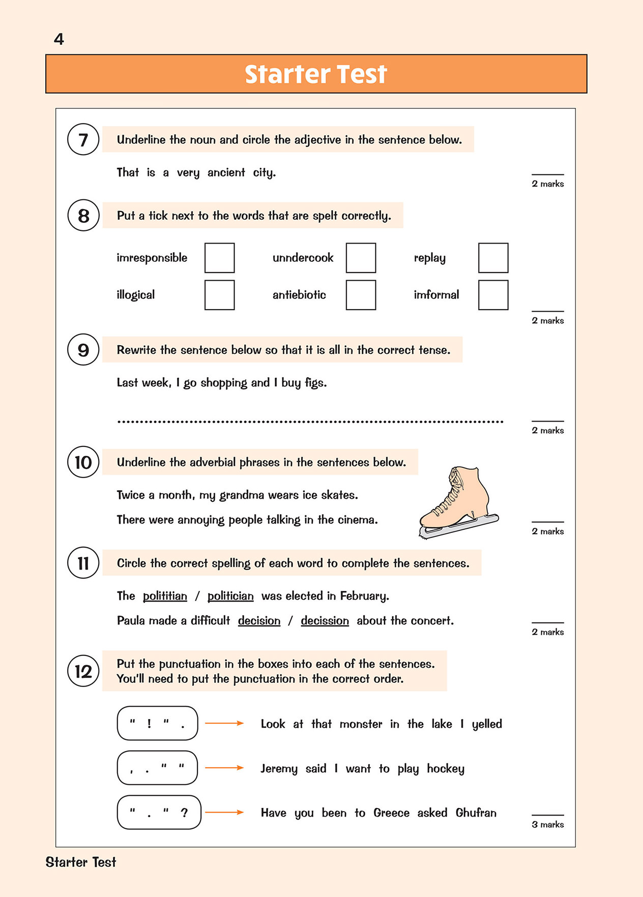 这本出色的目标问题书为四年级学生提供了大量的英语练习! 它包含各种问题,以帮助学生建立整个英语课程的知识框架,包括理解、写作、拼写、标点符号和语法——所有这些都涵盖在一本书里!整本书都有进度测试,以巩固知识和检查学生的学习情况,书的后面附有答案。