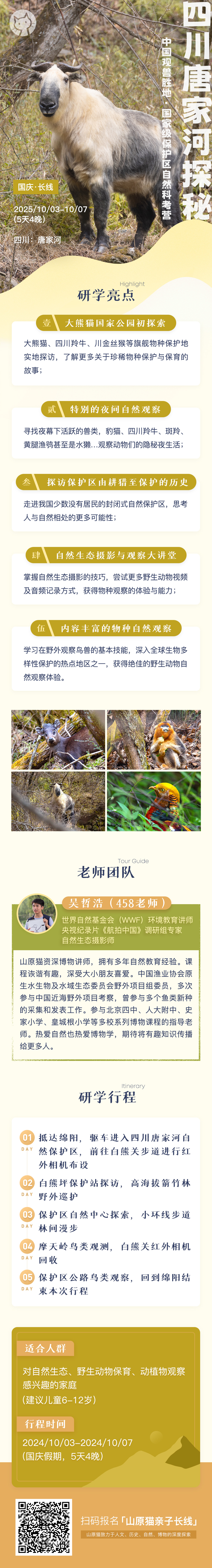 五天的唐家河保护区自然探索之旅,大小朋友行走于大熊猫国家公园,寻找野生动植物的身影;与巡护员同行,倾听珍稀物种保护与保育的故事,思考人与自然和谐共生的方式。