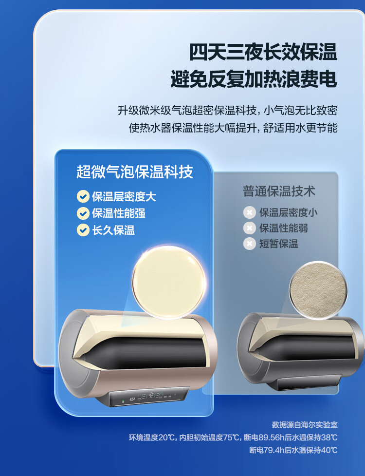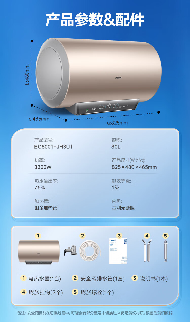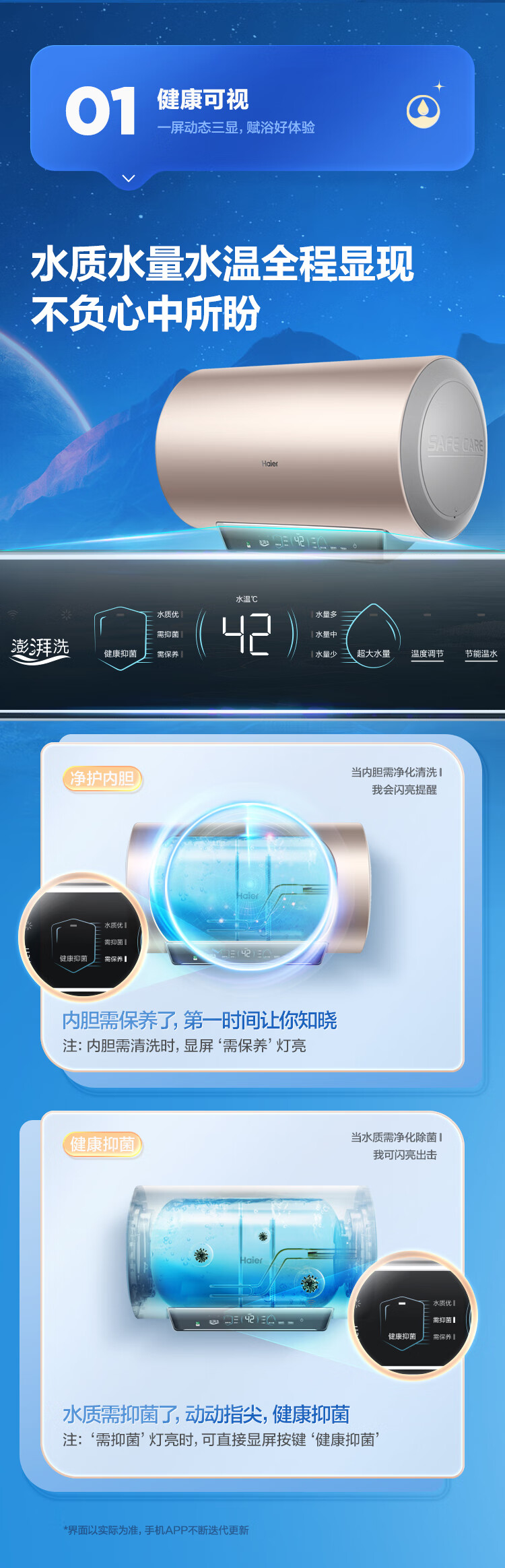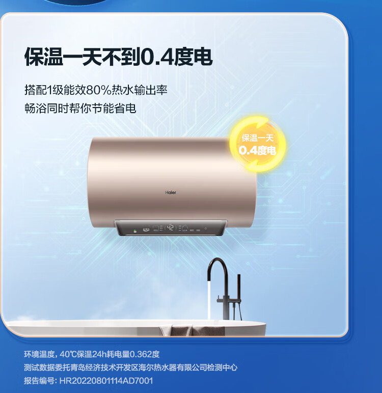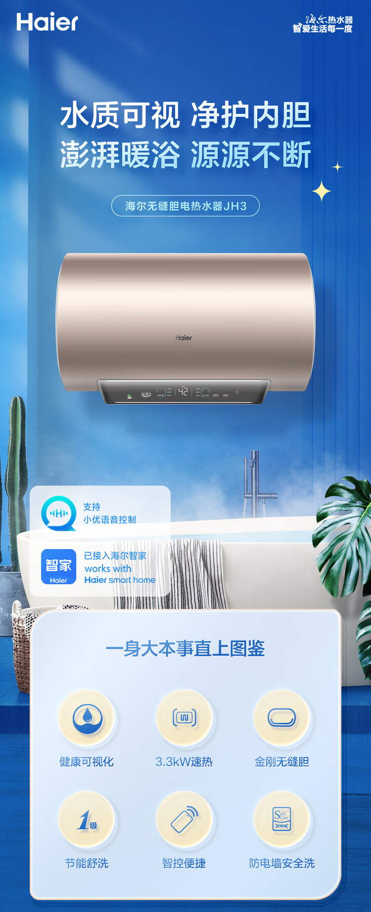 海尔(Haier)80升 电热水器 3300W大功率 速热 增容大水量 金刚无缝胆 水质可视 WiFi智控 一级能效 EC8001-JH3U1