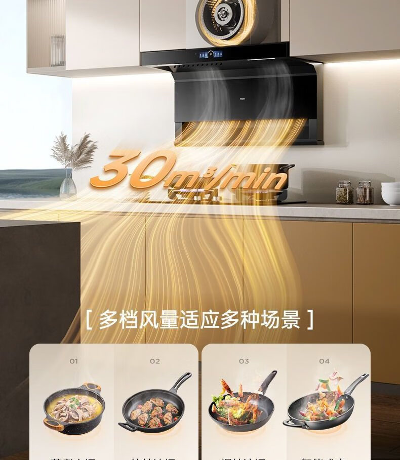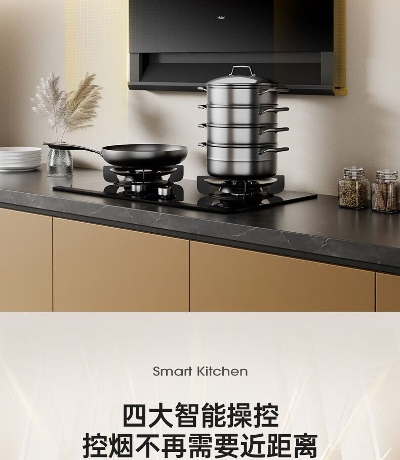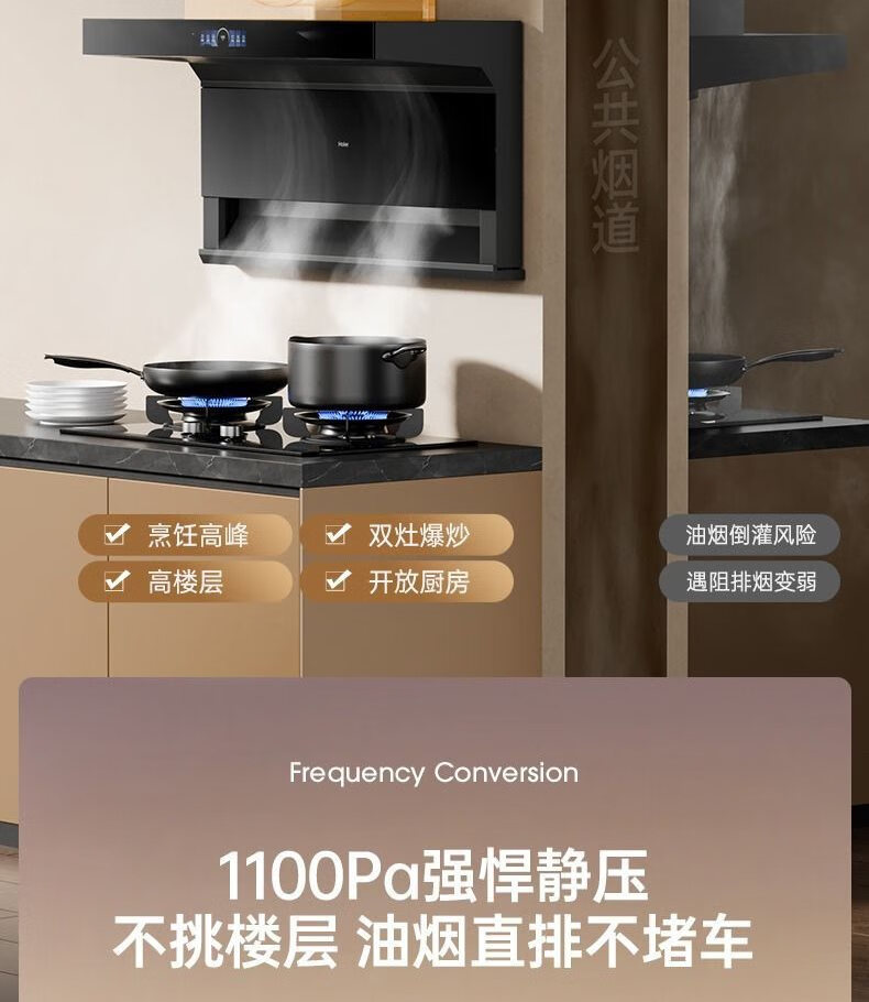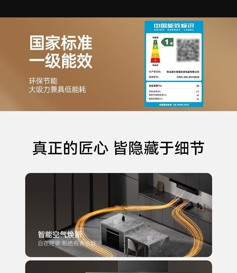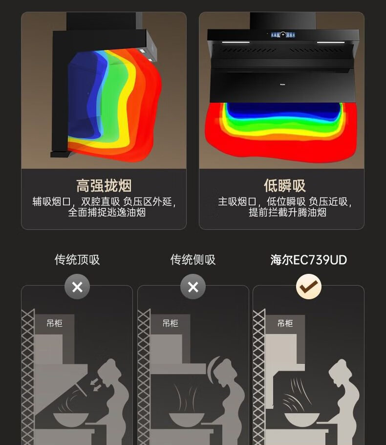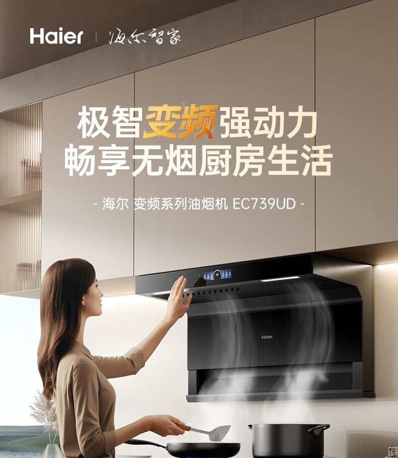 海尔(Haier)变频巡航顶侧三吸抽油烟机 30立方大吸力 烟灶联动 1100Pa静压热熔自清洁家用油烟机EC739UD
