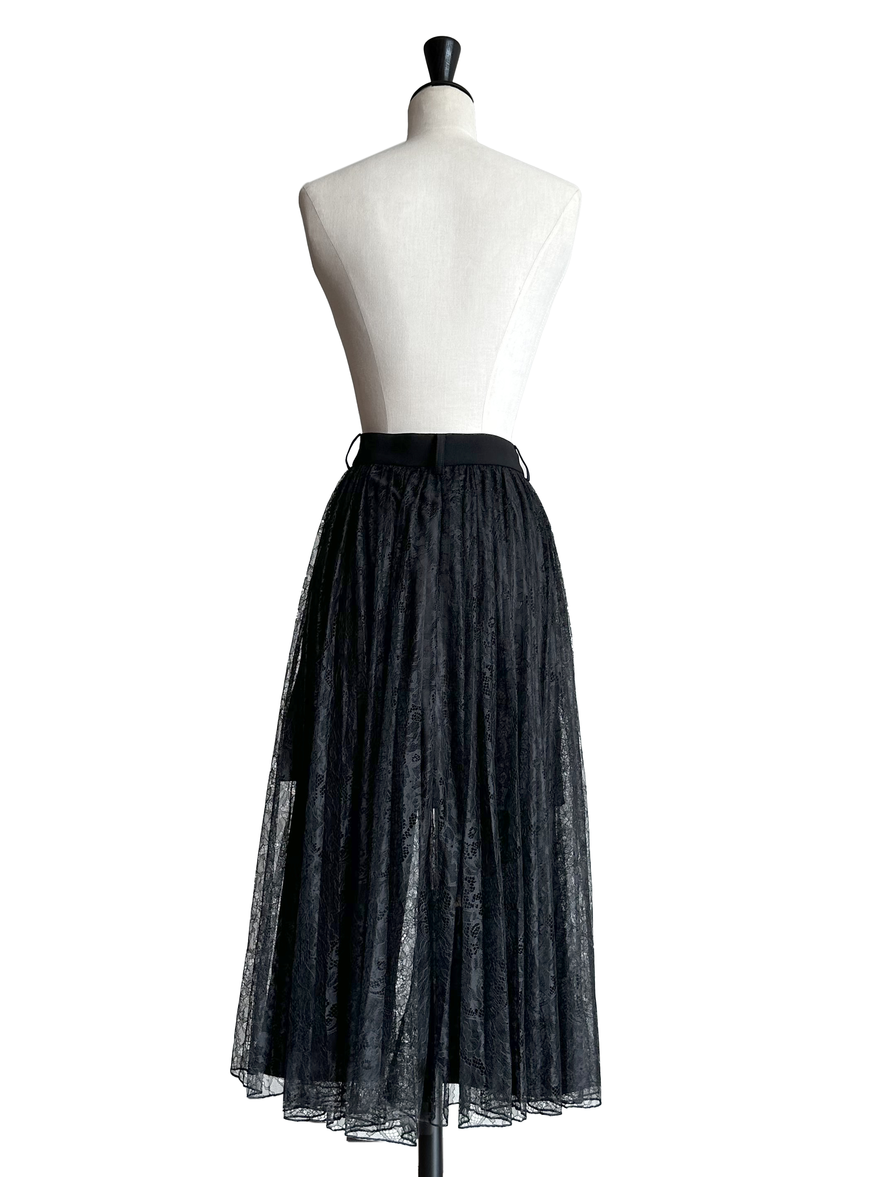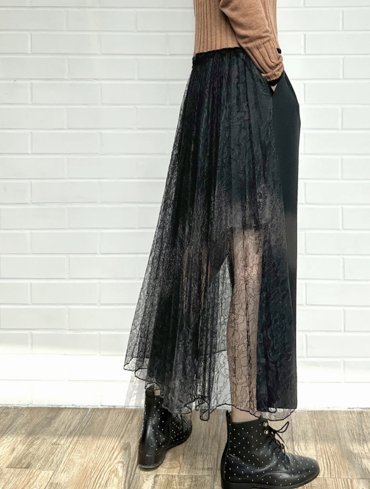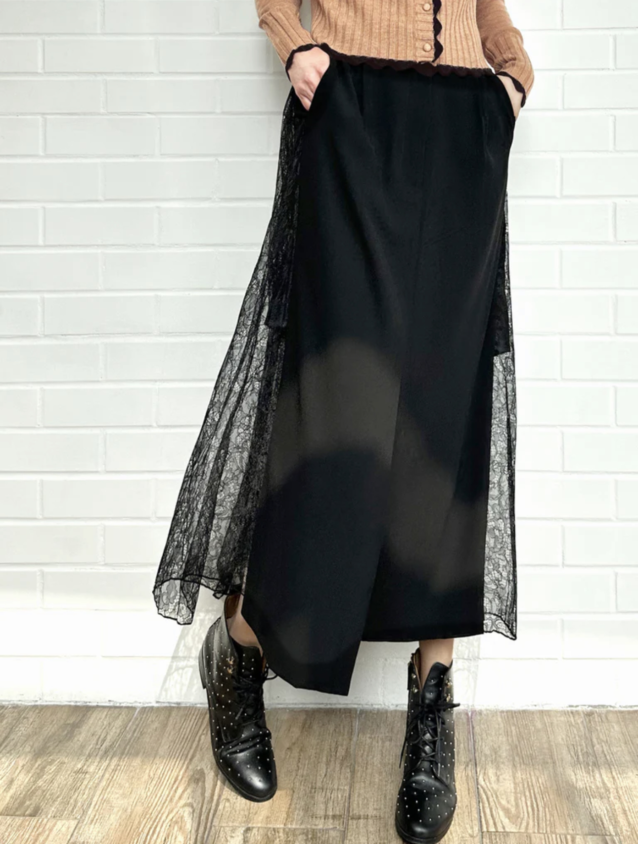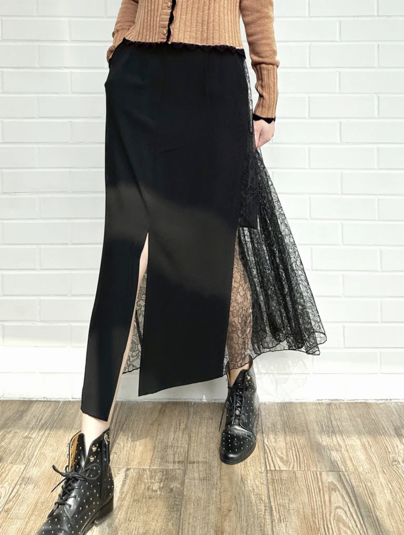 TYNVIE 拼接蕾丝裙摆铅笔裙-黑色