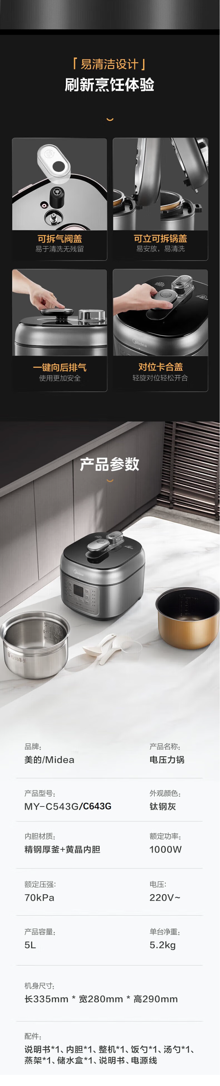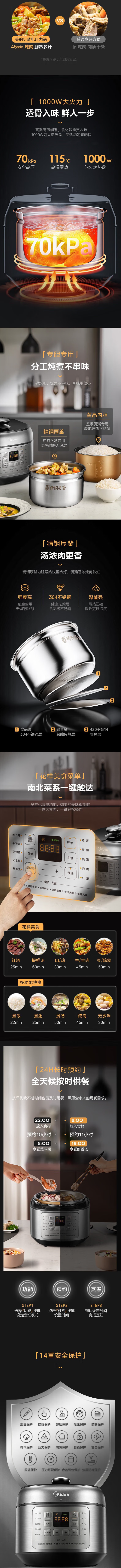 美的(510562)(Midea)6L少盐提鲜压力锅电压力锅高压力锅0涂层不锈钢不粘内胆智能调压一锅双胆 MY-C643G