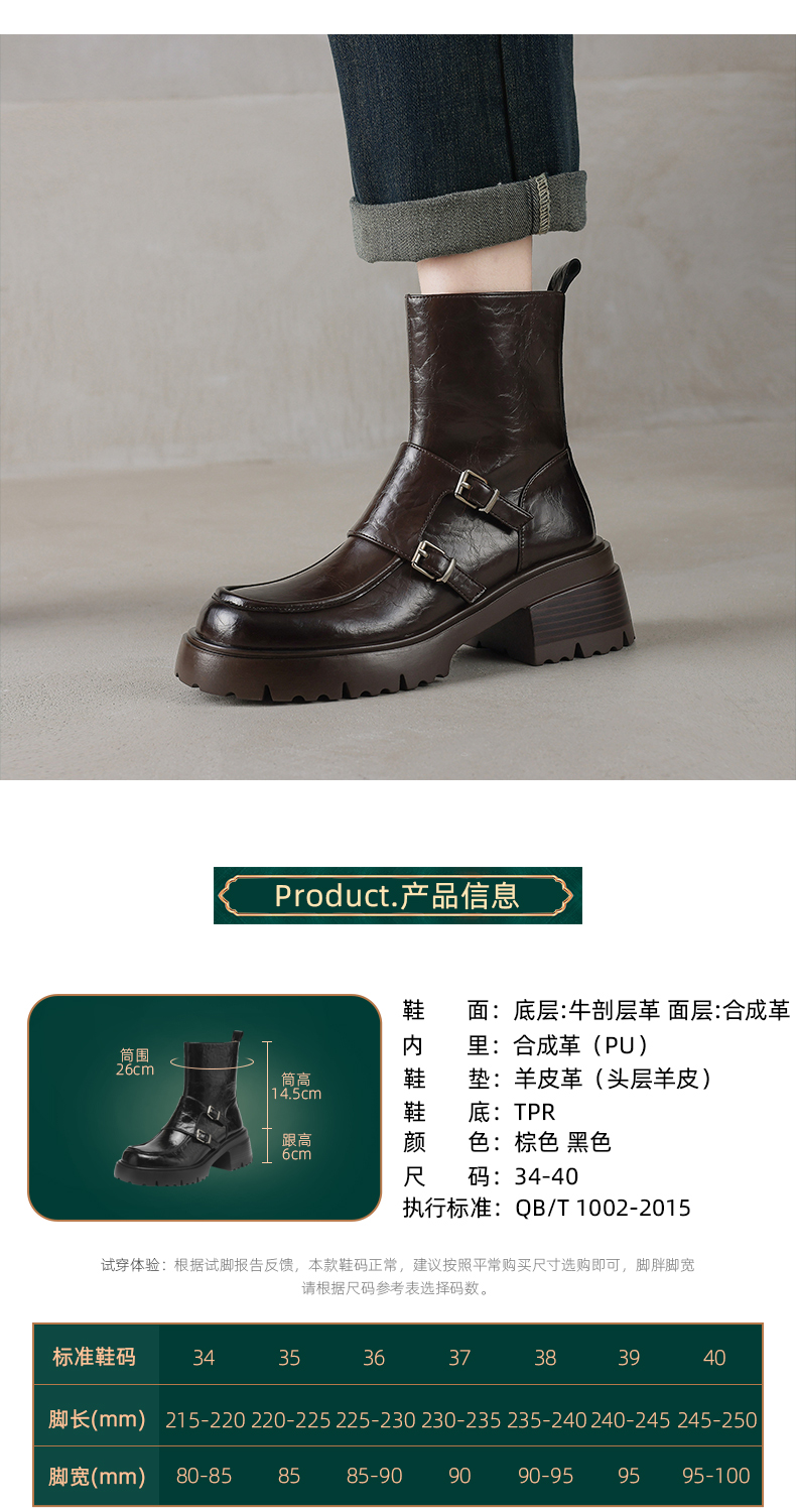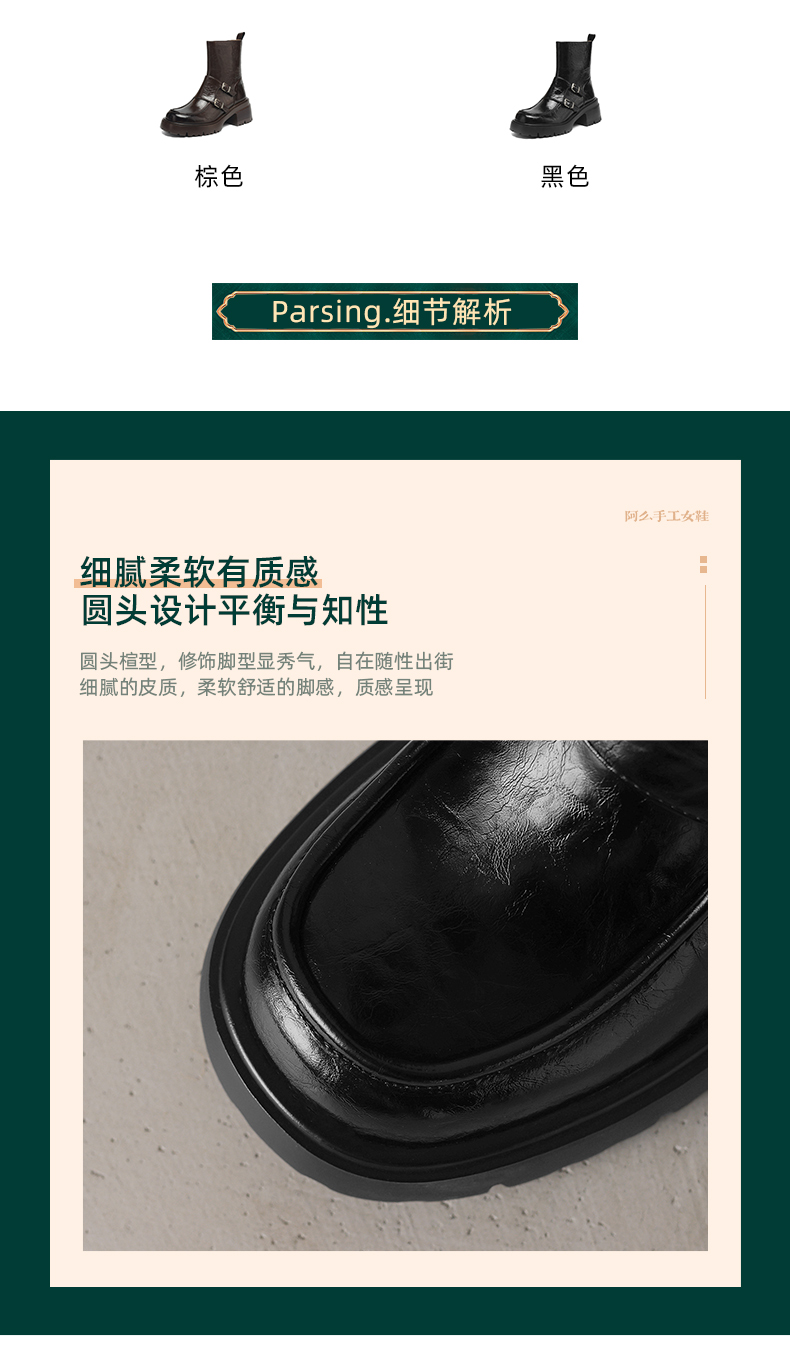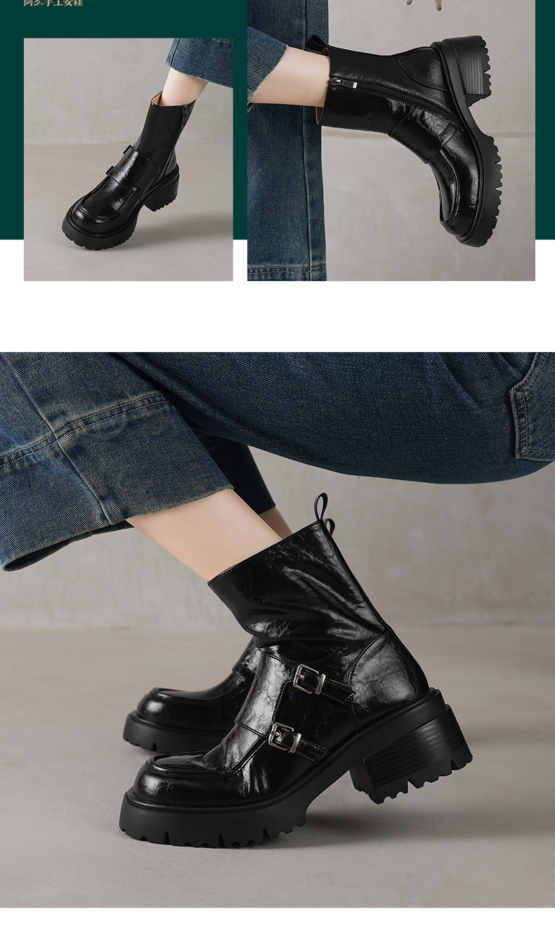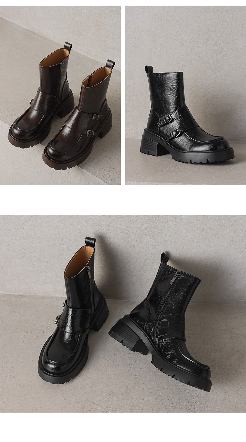 阿么手工女鞋真皮厚底英伦皮带扣短靴冬季新品侧拉链小众靴子6CM