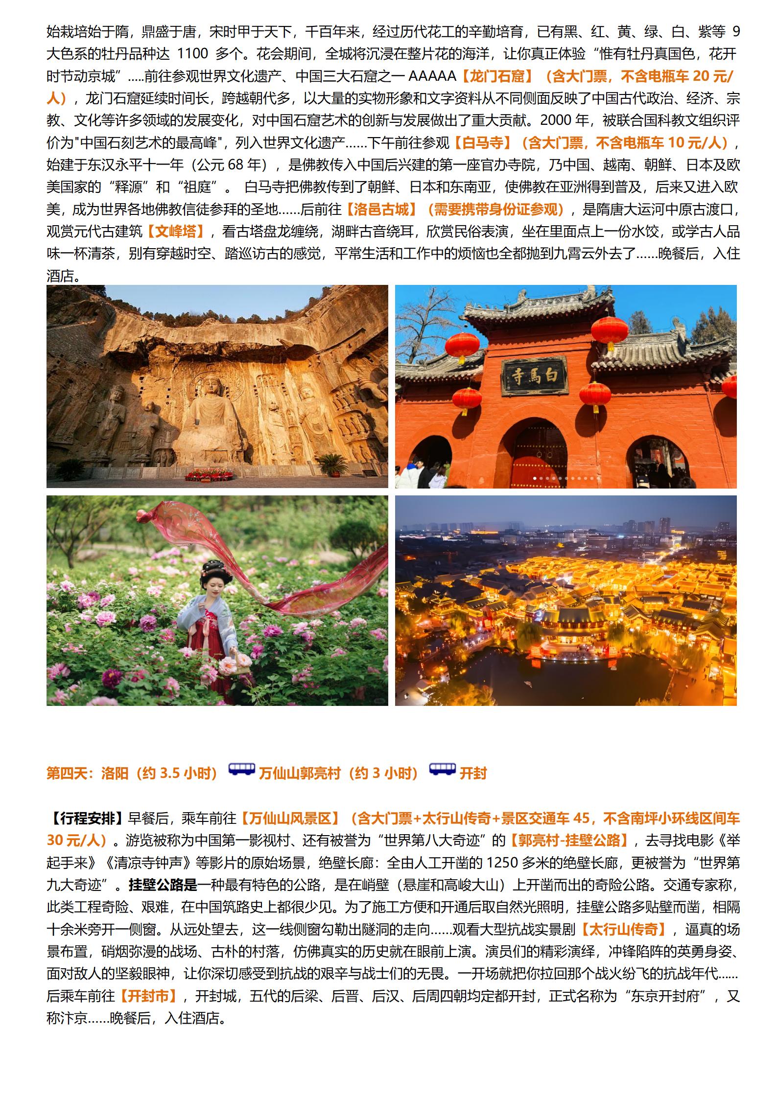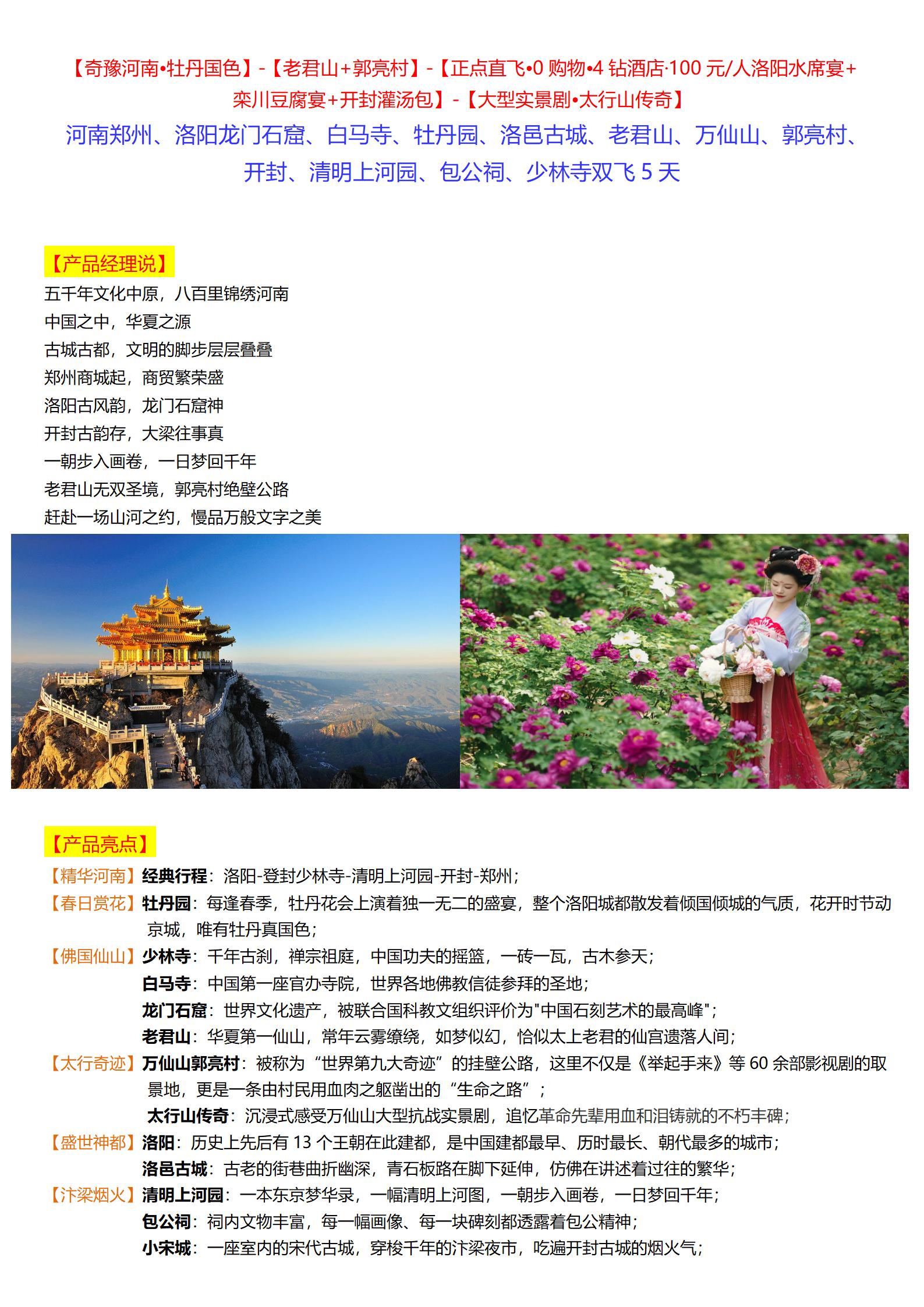 【踏青赏花】<河南郑州、洛阳龙门石窟、白马寺、牡丹园、洛邑古城、老君山、万仙山、郭亮村、开封、清明上河园、包公祠、少林寺双飞5天>