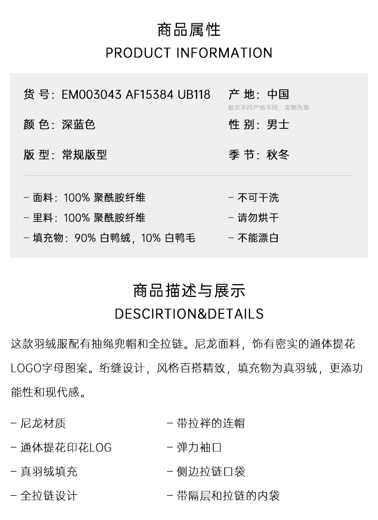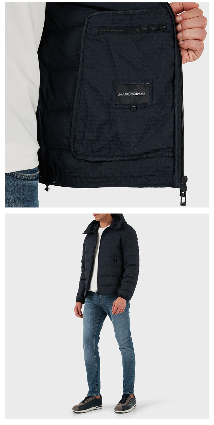 EMPORIO ARMANI 阿玛尼 男士字母徽标提花带帽绗缝尼龙羽绒服 深蓝色 EM003043 AF15384 UB118