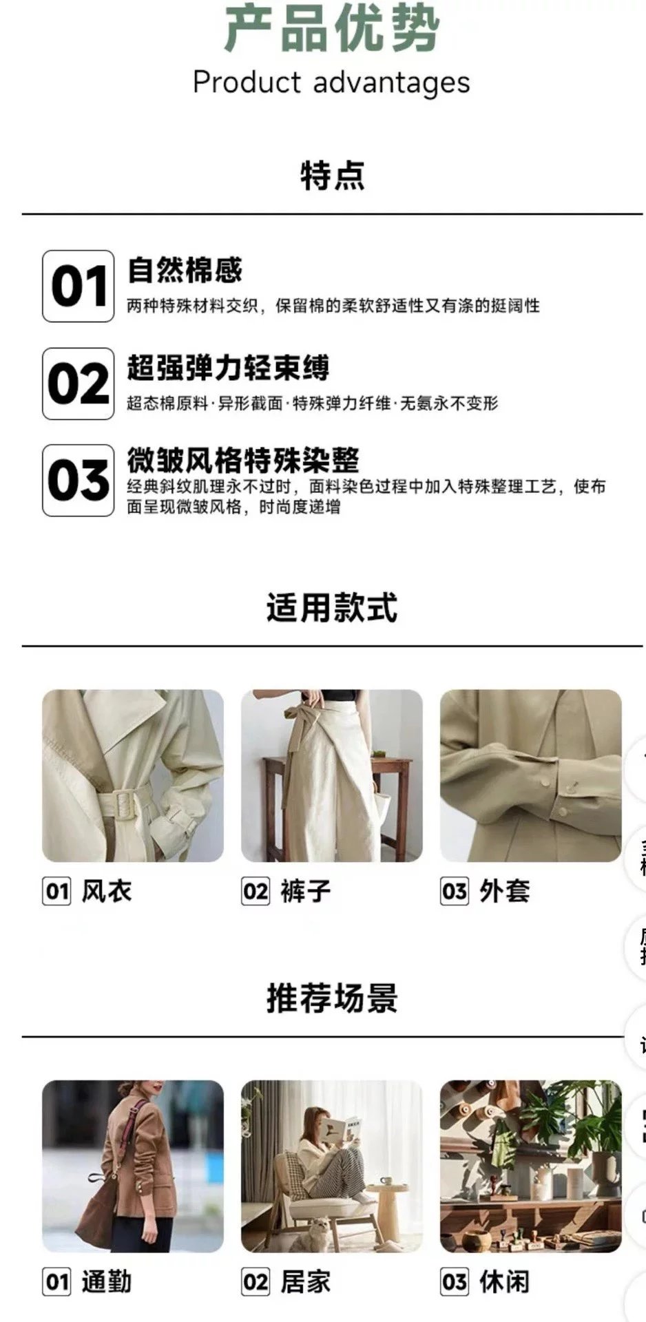 研发背景:棉类面料易缩易皱且粘毛 该面料在此基础上进行改善 保留棉感的同时经过特殊整理工艺使其有微皱的外观 面料优点:原料采用琎口原料,du特的异形截面弹力纤维 提供chao强棉感的同时又有很好的弹力和回复性能 不变形,抗皱性好,不鼓包,易打理; 此特殊纱线搭配方式保留棉的柔软舒适性又有涤的挺阔性 2.经过特殊后整理工艺使面料外观微皱,仿若时间雕刻的痕迹 3.采用软水染色,颜色靓丽,无异味 外观:经典斜纹肌理搭配微皱风格 荃哑光外观赋予面料zui天燃的视觉感受 触感:自然棉感,弹力纤维和te殊工艺加持