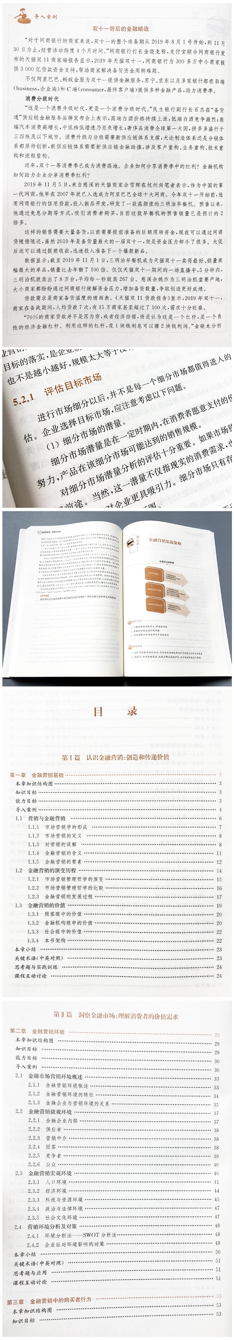 金融营销教材的理论体系是市场营销学框架与金融行业特点的结合。本教材基于互联网金融、金融大数据背景探讨金融与营销学科的融合。本书既可作为高等院校管理专业、金融专业的教材,也适合作为金融机构的培训教材。随着互联网金融和大数据的发展,金融营销学变得越来越重要。本书以我国金融业现状为背景,阐述了金融营销的基本概念、方法和原则,系统介绍了金融营销领域的诸多问题,包括金融营销战略、金融品牌营销、金融服务营销、金融大数据营销、金融营销客户行为分析、金融营销产品策略、金融营销定价策略、金融营销渠道策略以及金融营销促销策略。除了突出这些理论特色以外,该书根据近年来金融行业的发展变化,还引用了大量的金融实例和素材来诠释营销学在金融领域的运用;为反映互联网时代金融的变化,增加了针对金融大数据、互联网+创新等方面的案例;为适应高校培养应用型人才的需要,增加了一些实训项目的内容。