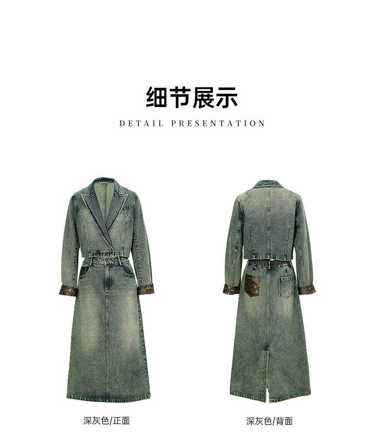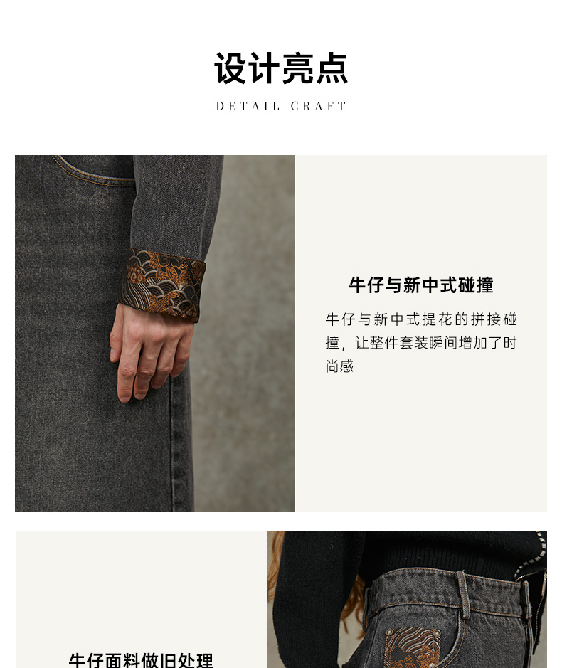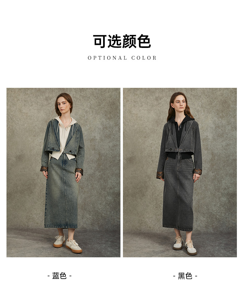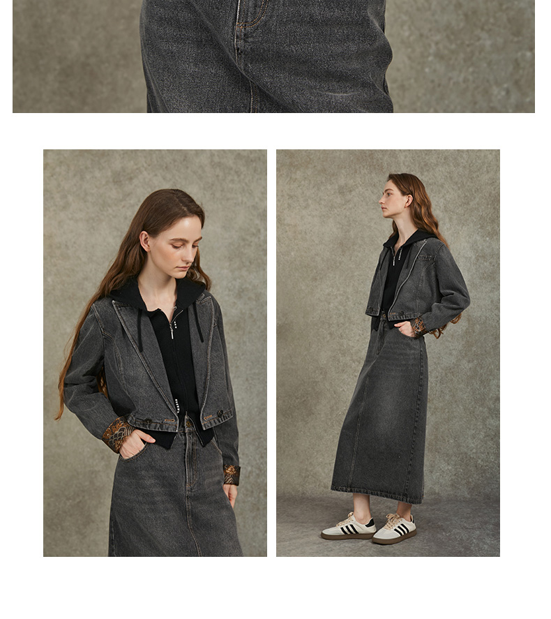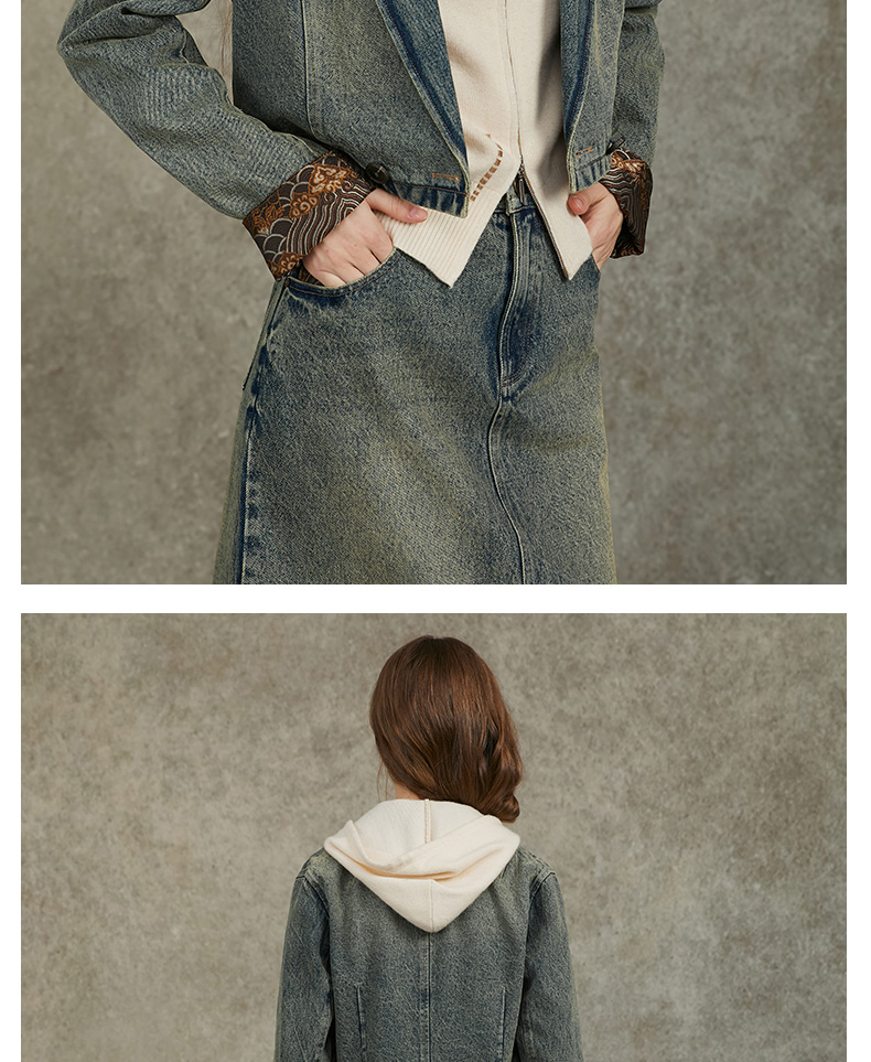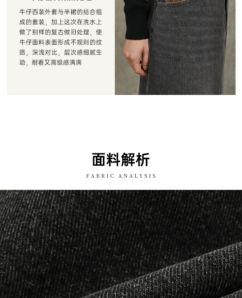 Famecoco范可儿复古牛仔套装V领短外套A字裙两件套FAC6EA003