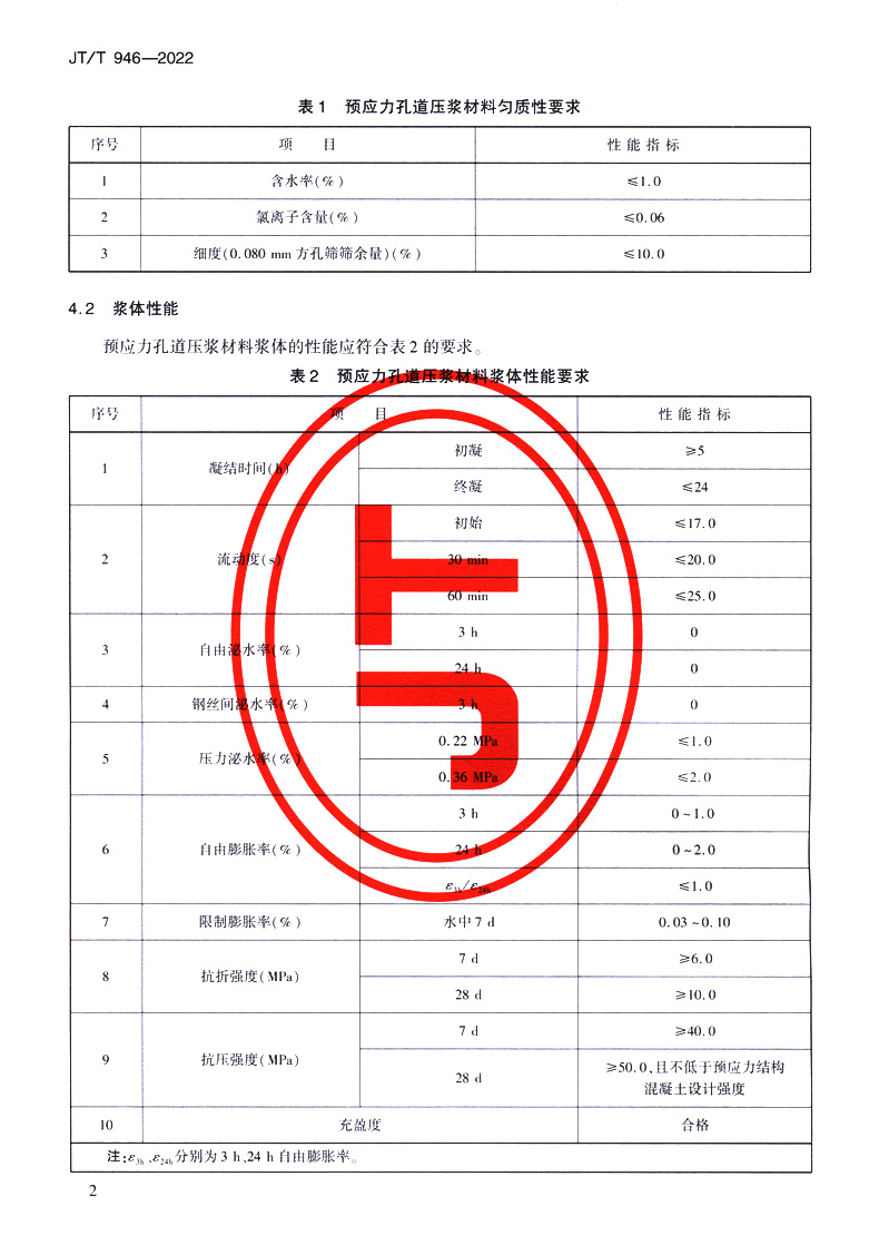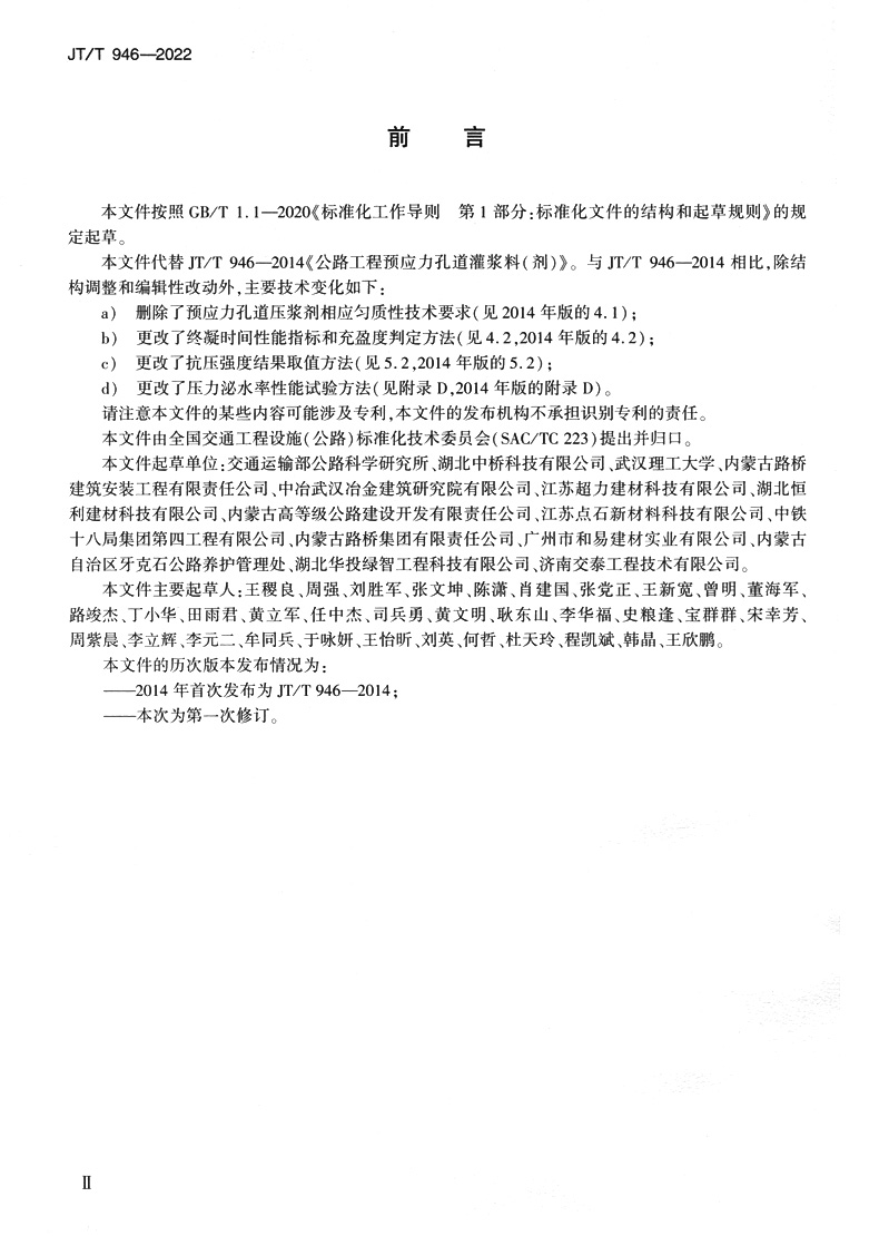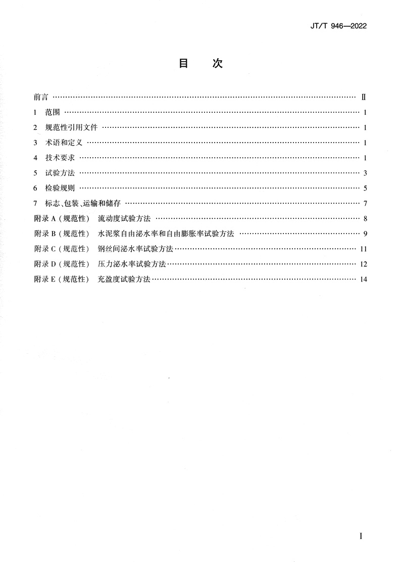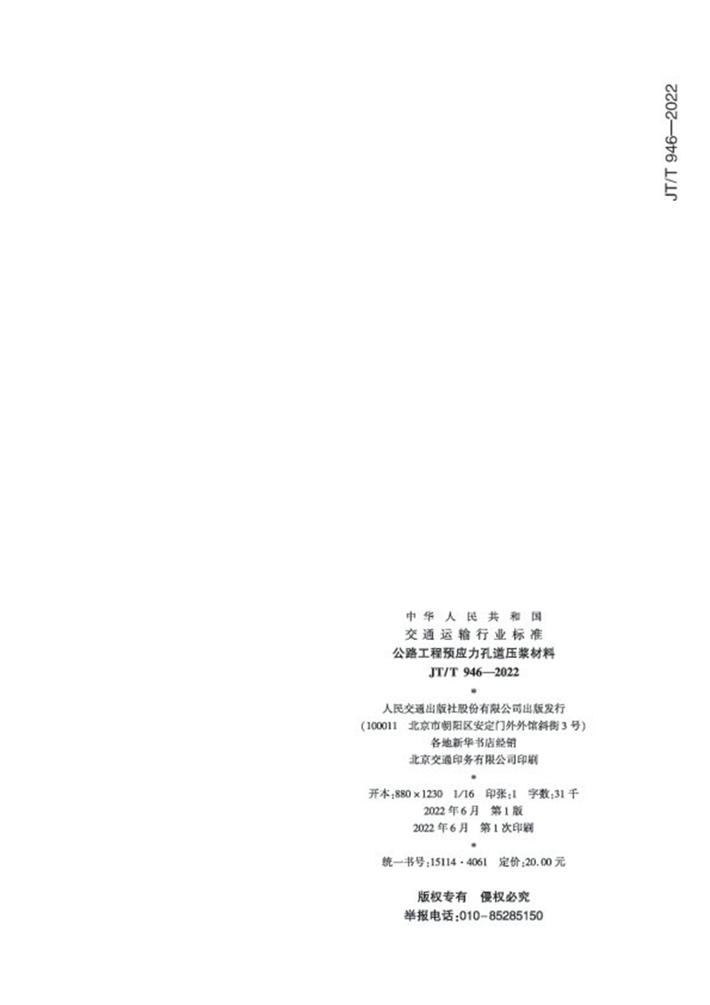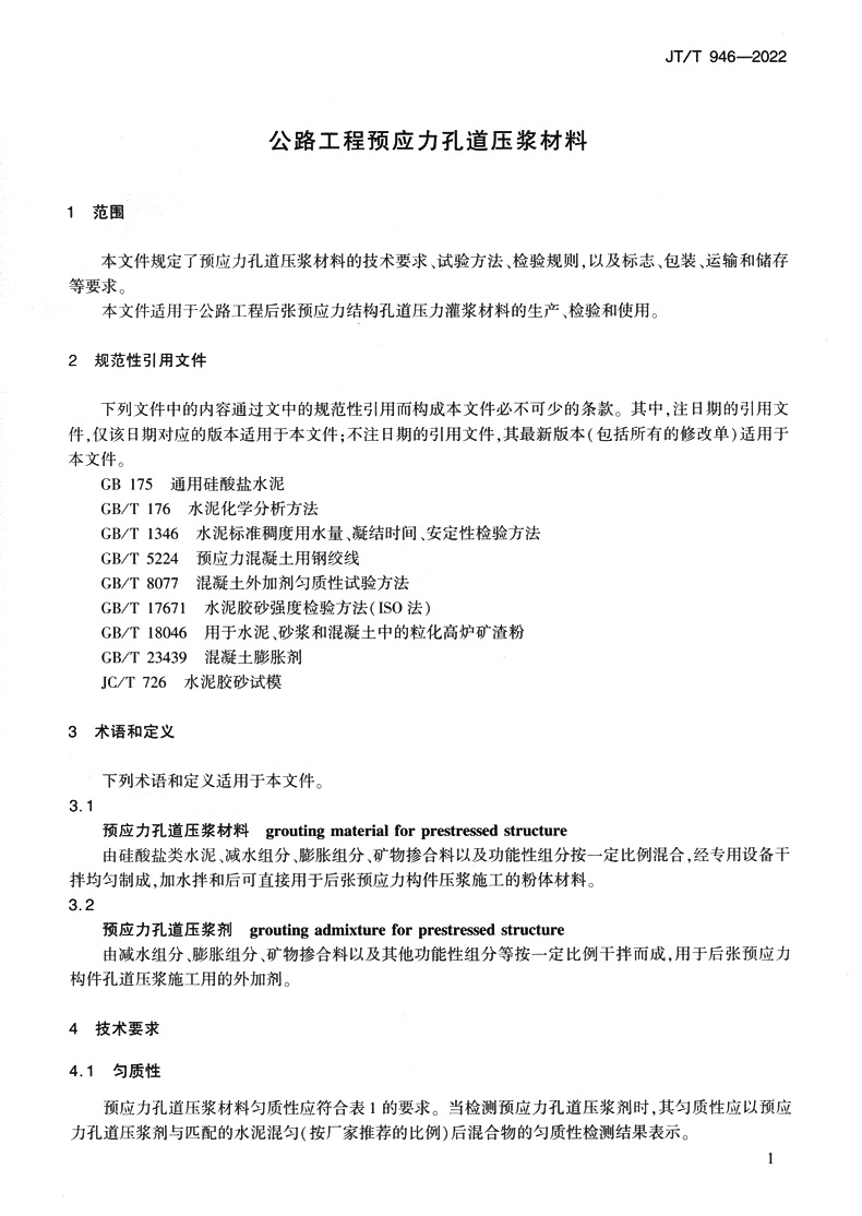 书名:公路工程预应力孔道压浆材料(JT/T 946—2022)