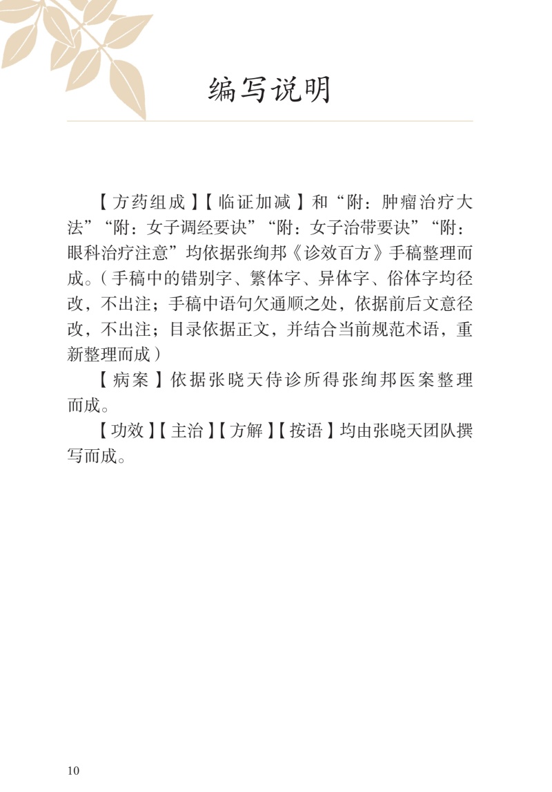 全书共100方,每方均对应西医病名,内容囊括内、外、妇、儿、五官等各科常见病症。正文首列张绚邦原方,处方精当,用药严谨,随症增减,变化丰富,每方药在八九味间,多者亦不过十余味,药量精微,每药重则二三十克,而轻者亦有一两克;次列运用本方的临证验案,每则验案均有按语评析。全书内容丰富,文字精炼,理法方药俱备,是一部不可多得的效方手册,适合广大院校师生、中医师、中西医结合医师参考阅读,对于提高临证水平大有裨益。