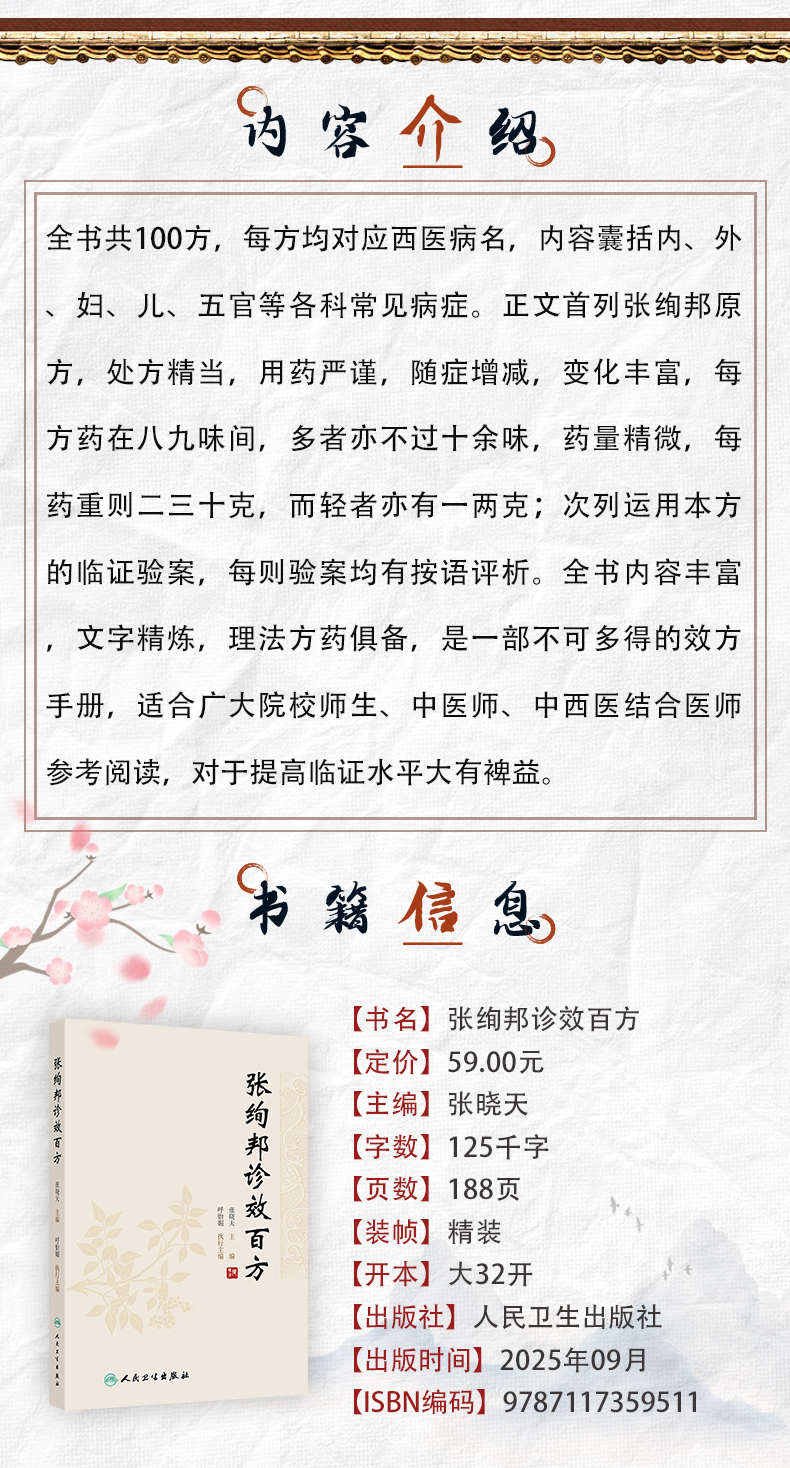 张绚邦诊效百方 张晓天 全书共100方 每方均对应西医病名 内容囊括内 外 妇 儿 五官等各科常见病症 9787117359511人民卫生出版社