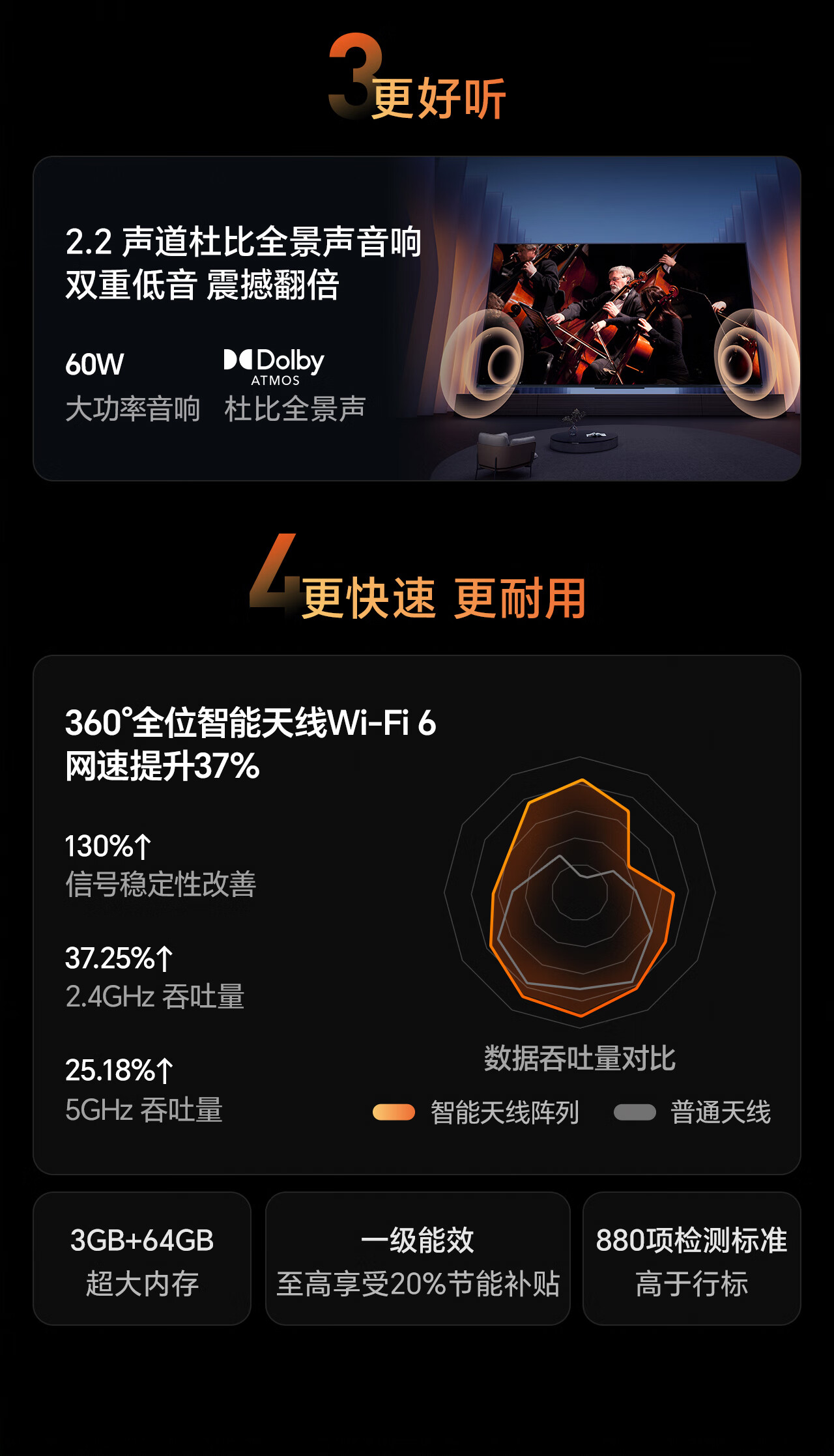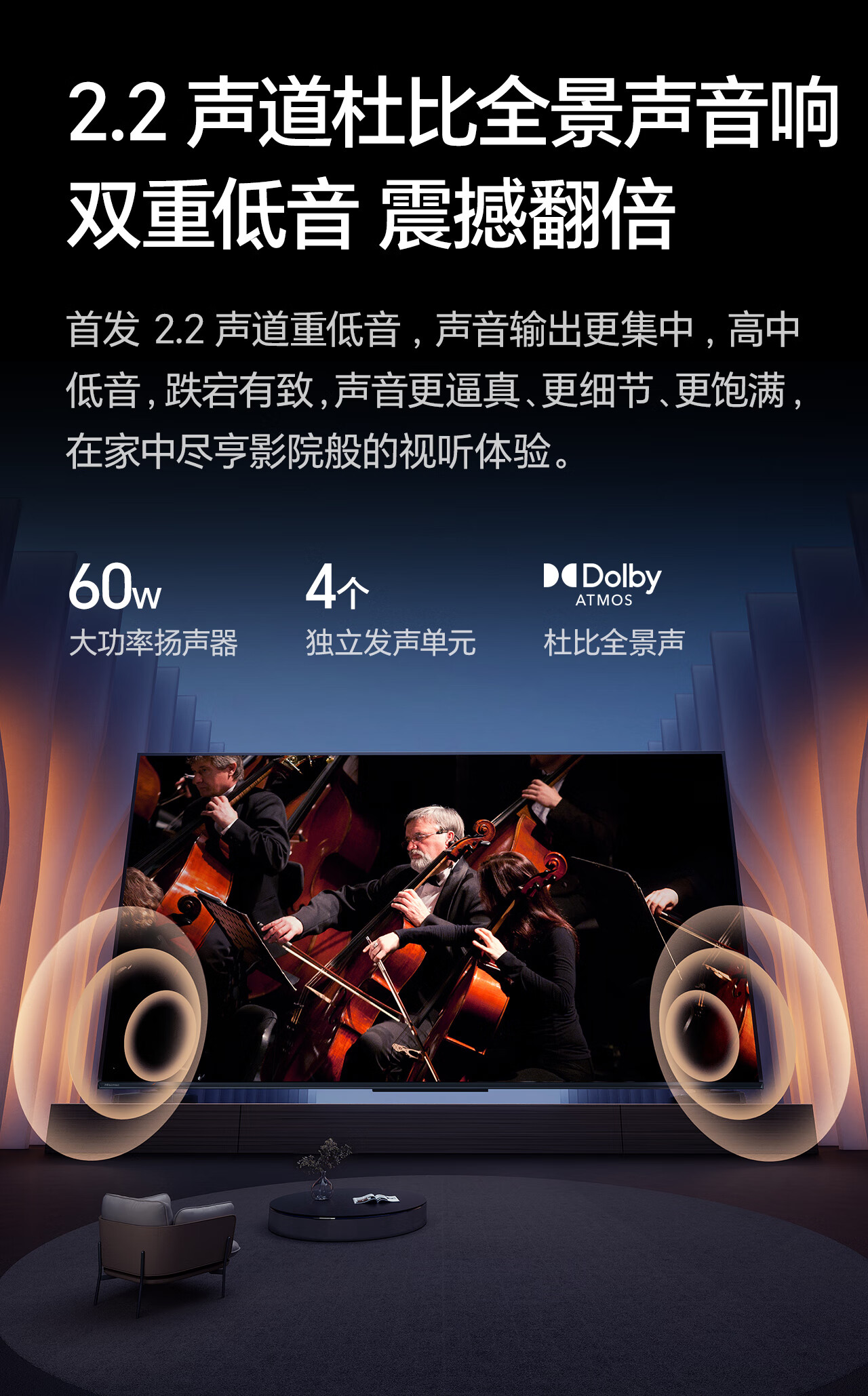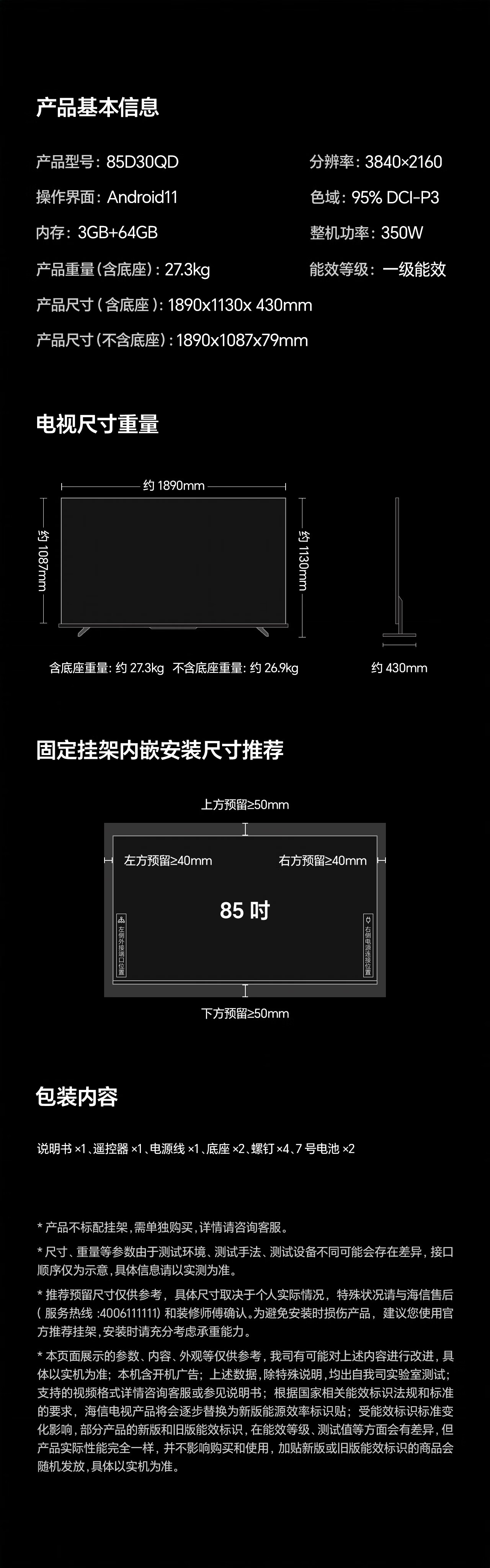 海信电视D30QD 85英寸 144Hz高刷 电影级广色域 2.2声道杜比全景声 360°智能天线Wi-Fi6 3+64GB