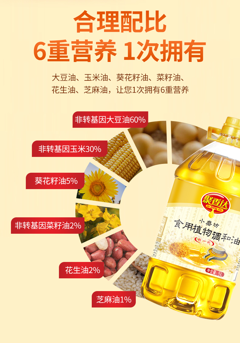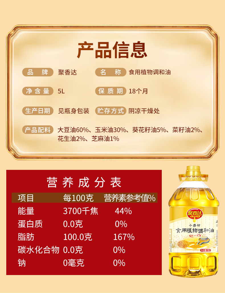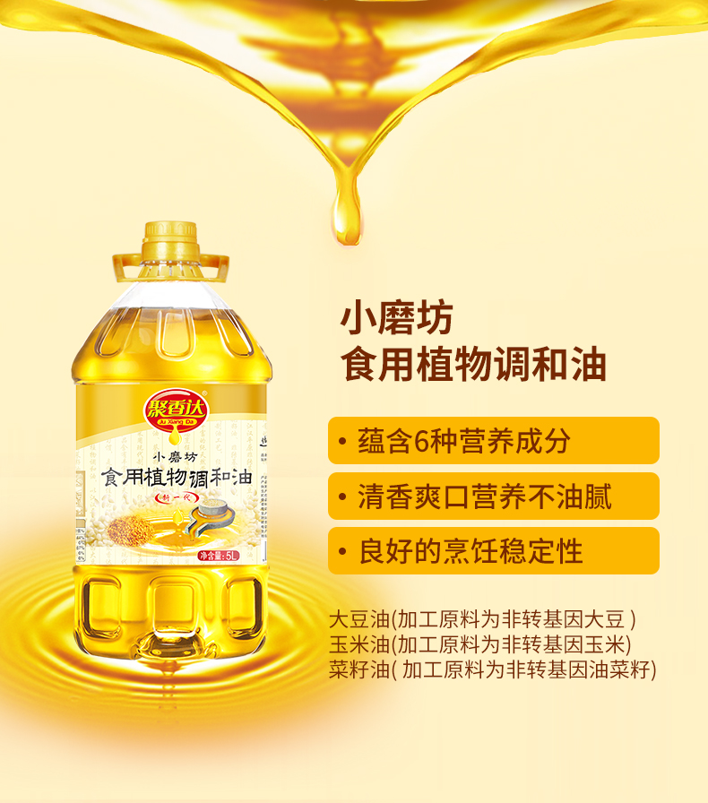 【严选】荆楚好粮油 非转基因 湖北襄阳元大 聚香达食用油物理压榨小磨坊食用植物调和油5L/桶(厂家直发)