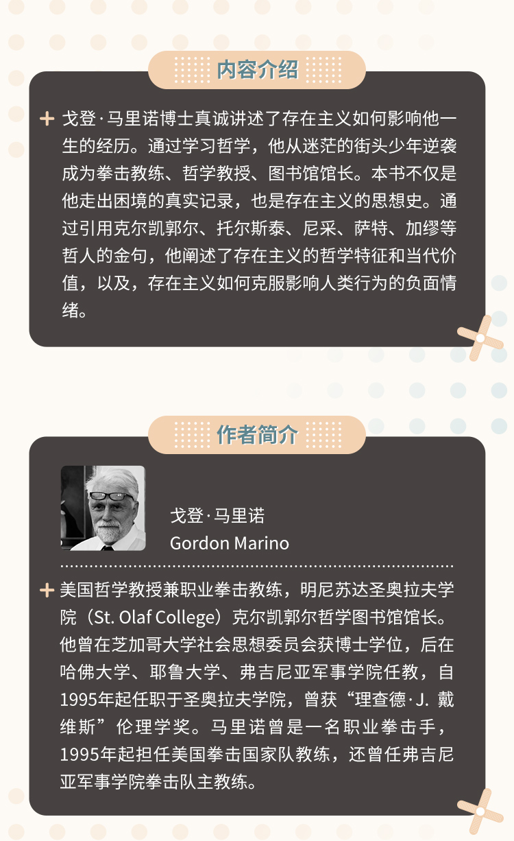 戈登·马里诺博士真诚讲述了存在主义如何影响他一生的经历。通过学习哲学,他从迷茫的街头少年逆袭成为拳击教练、哲学教授、图书馆馆长。本书不仅是他走出困境的真实记录,也是存在主义的思想史。通过引用克尔凯郭尔、托尔斯泰、尼采、萨特、加缪等哲人的金句,他阐述了存在主义的哲学特征和当代价值,以及存在主义如何克服影响人类行为的负面情绪。
