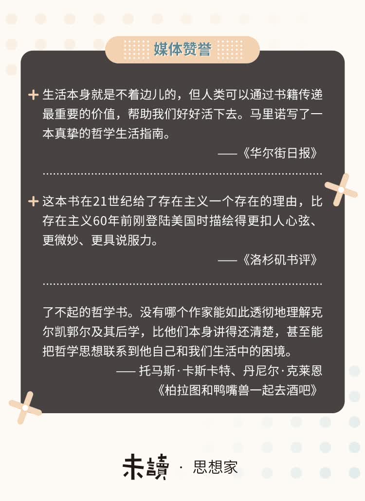 3.了不起的哲学书。没有哪个作家能如此透彻地理解克尔凯郭尔及其后学,比他们本身讲得还清楚,甚至能把哲学思想联系到他自己和我们生活中的困境。