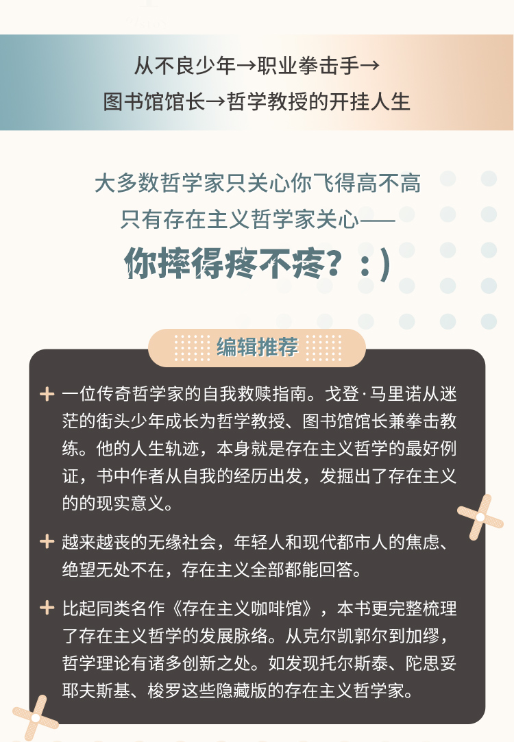 1.一位传奇哲学家的自我救赎指南。戈登·马里诺从迷茫的街头少年成长为哲学教授、图书馆馆长兼拳击教练。他的人生轨迹,本身就是存在主义哲学的zuihao例证,书中作者从自我的经历出发,发掘出了存在主义的的现实意义。越来越丧的无缘社会,年轻人和现代都市人的焦虑、绝望无处不在。存在主义全部都能回答。