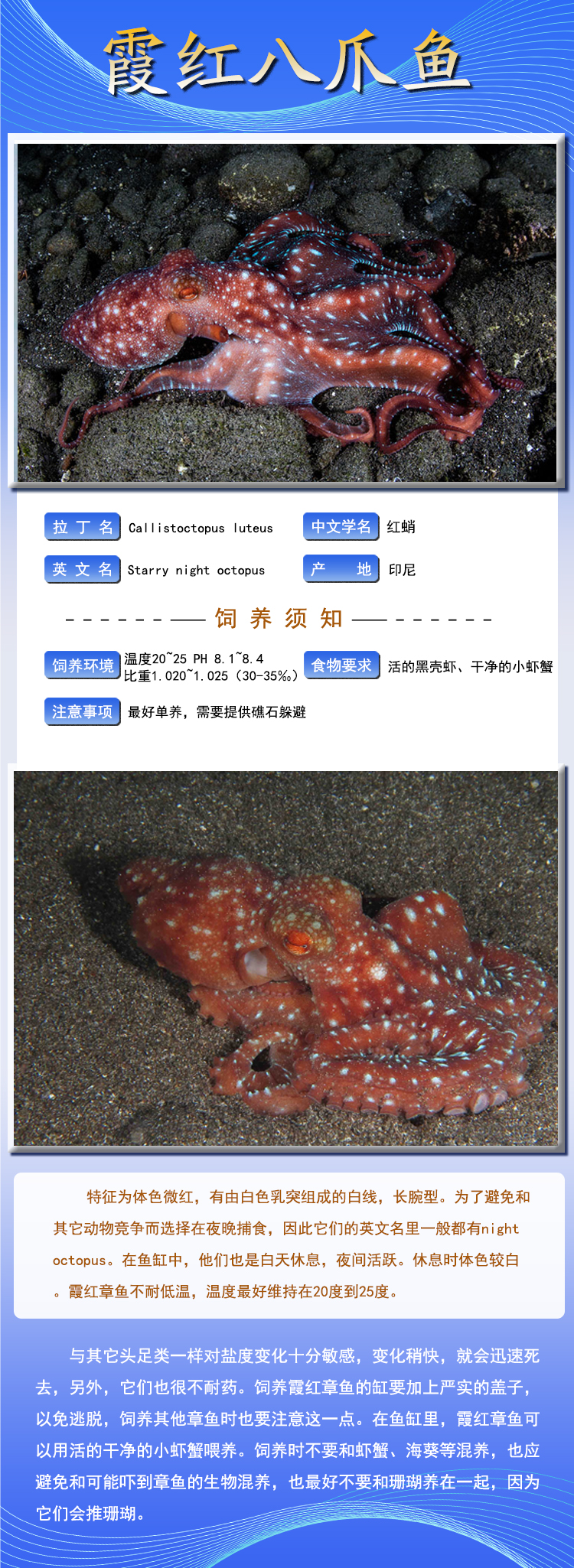 与其它头足类一样对盐度变化十分敏感,变化稍快,就会迅速死去,另外,它们也很不耐药。饲养霞红章鱼的缸要加上严实的盖子,以免逃脱,饲养其他章鱼时也要注意这一点。在鱼缸里,霞红章鱼可以用活的干净的小虾蟹喂养。饲养时不要和虾蟹、海葵等混养,也应避免和可能吓到章鱼的生物混养,也最好不要和珊瑚养在一起,因为它们会推珊瑚。