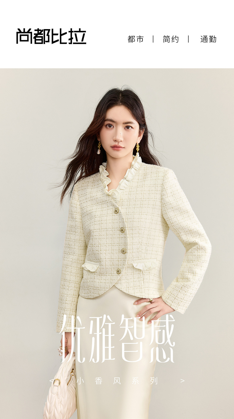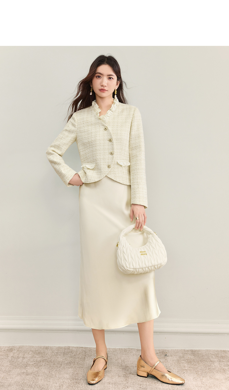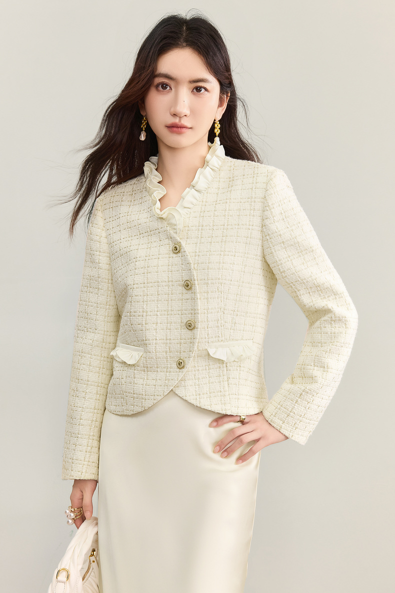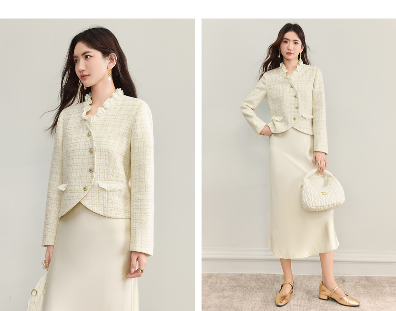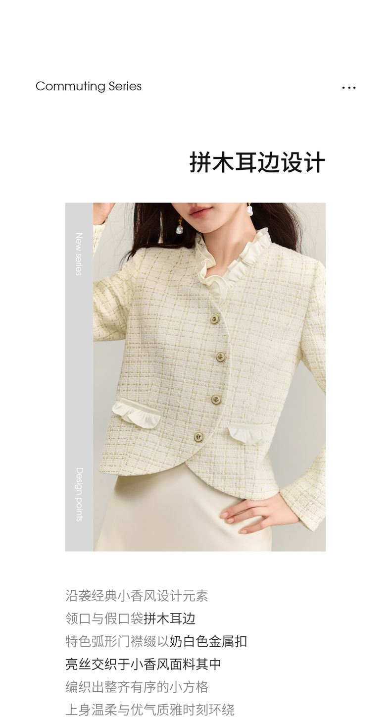 【内购】【拼木耳边】通勤V领弧形门襟金属扣长袖短款亮丝小香风厚外套-Q53WA3435