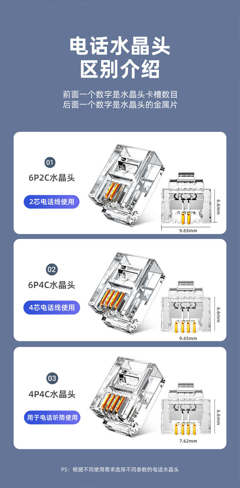 | 听筒专用水晶头【4P4C镀金款】100个/袋 | JHR-4P4C |
