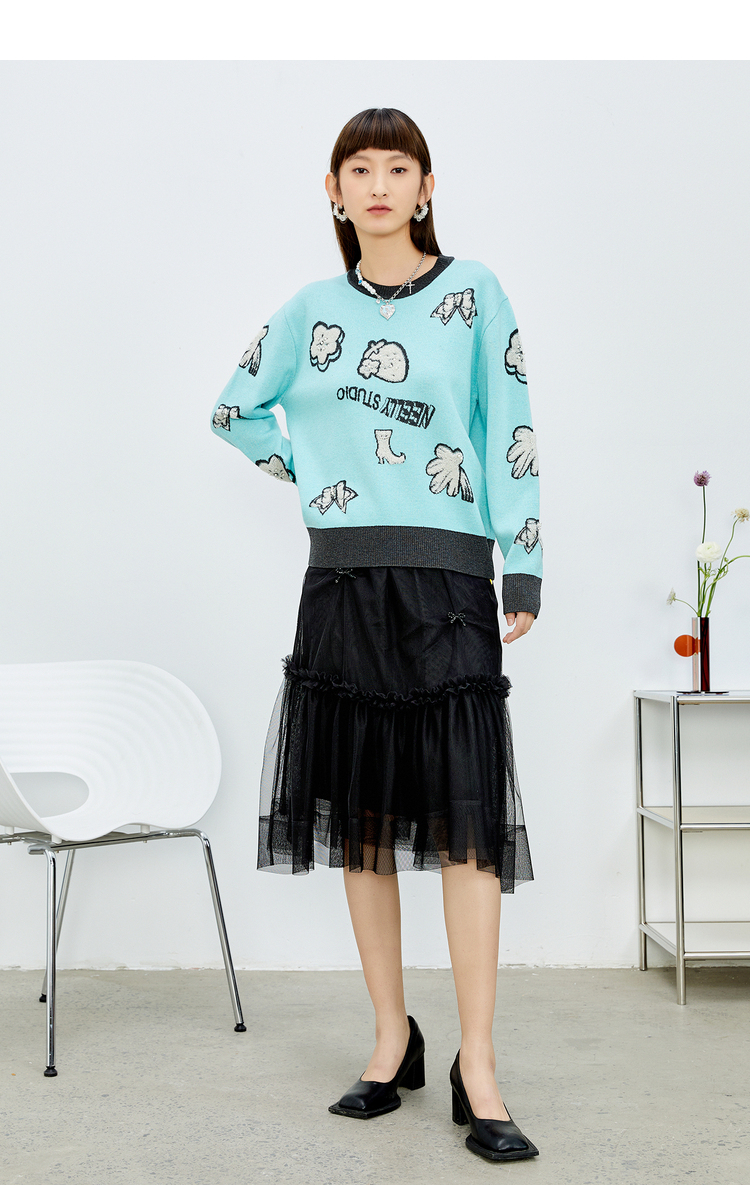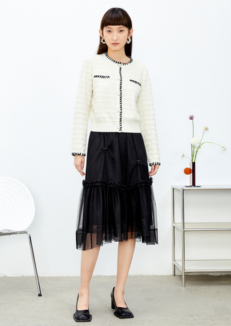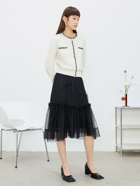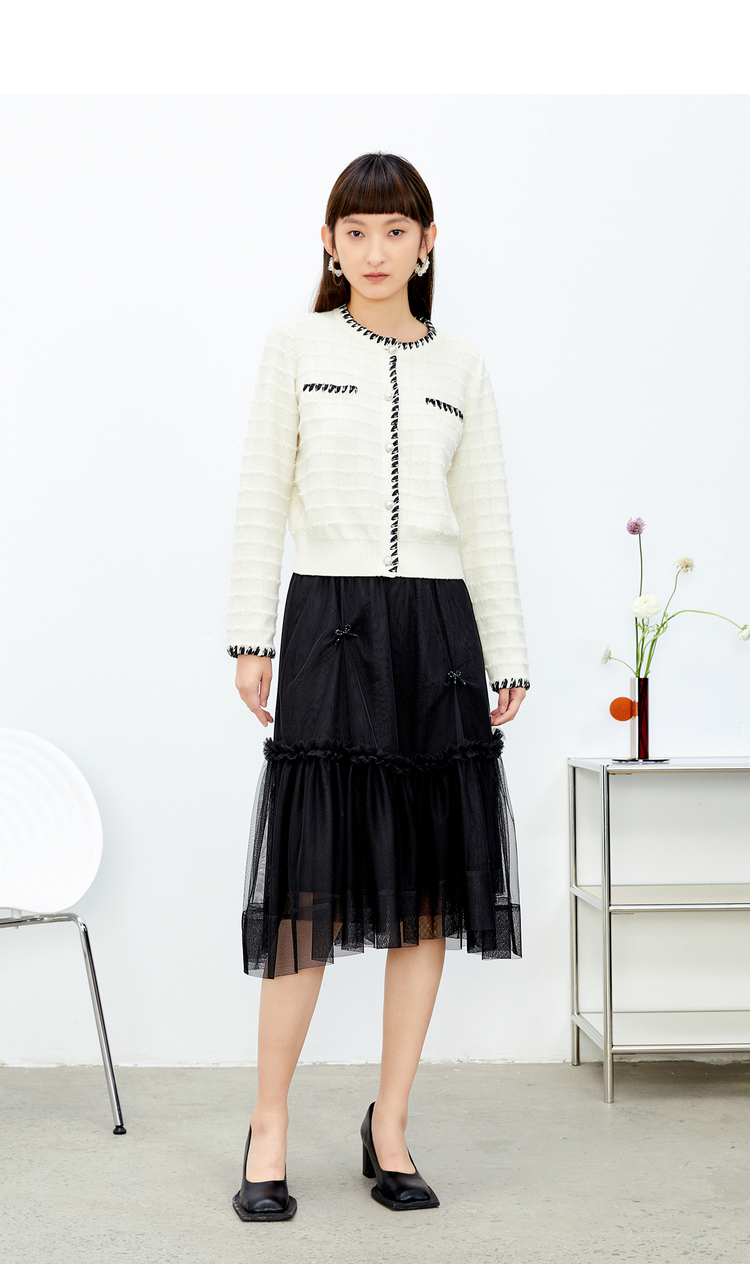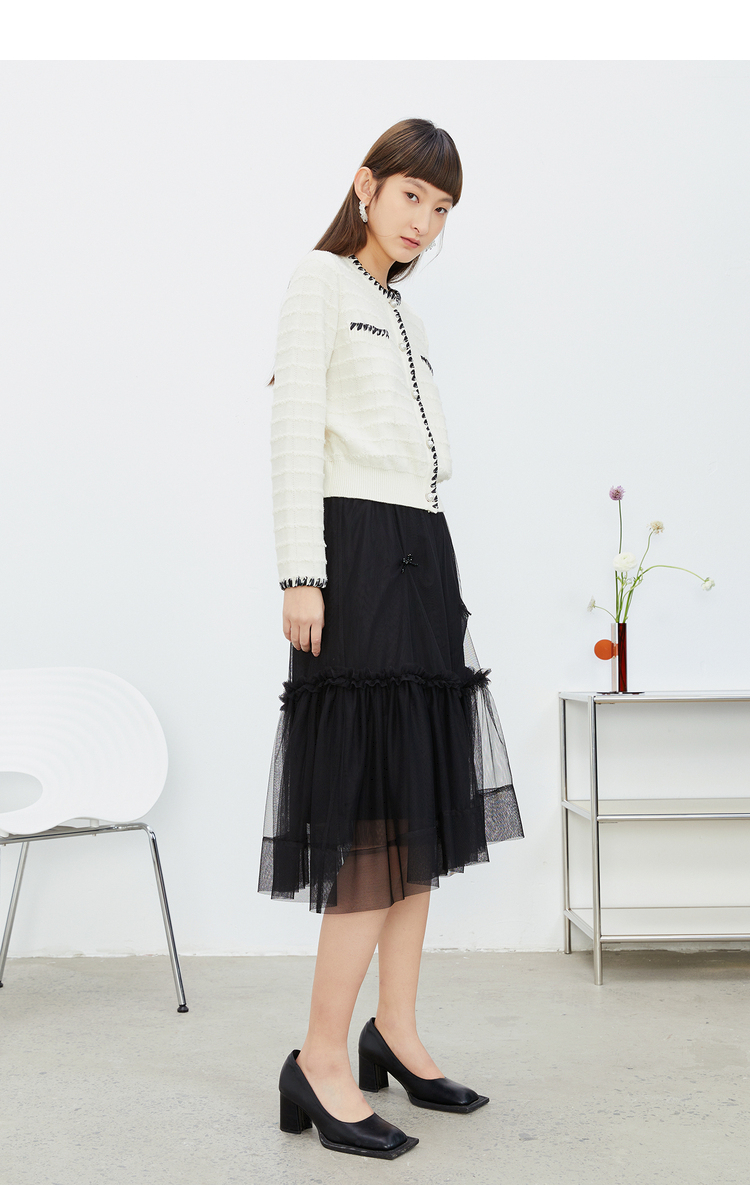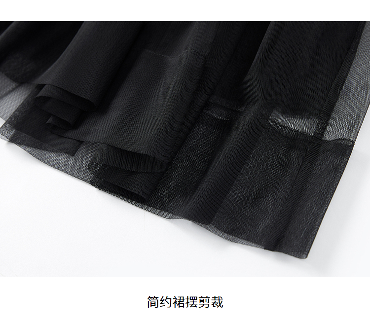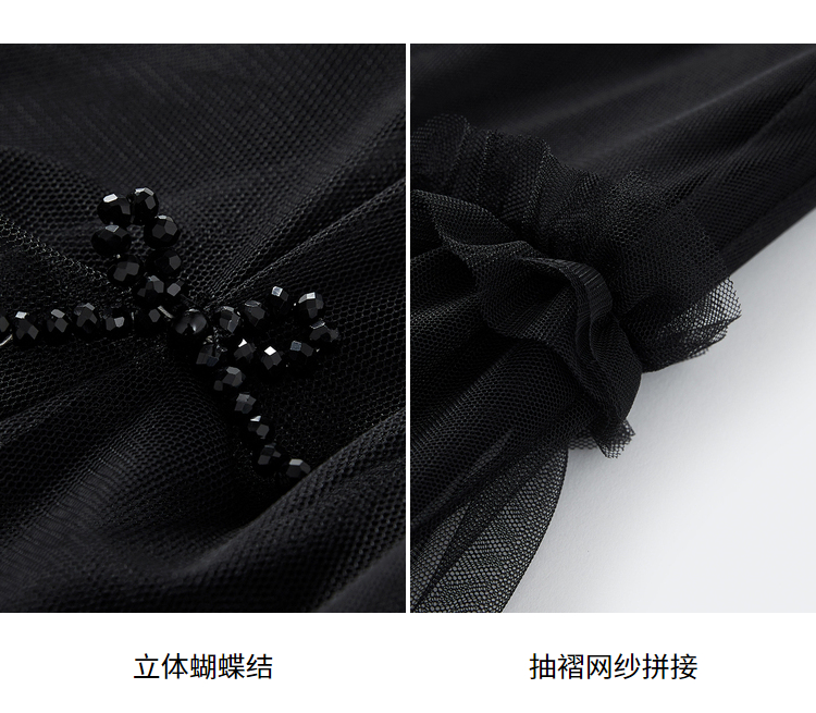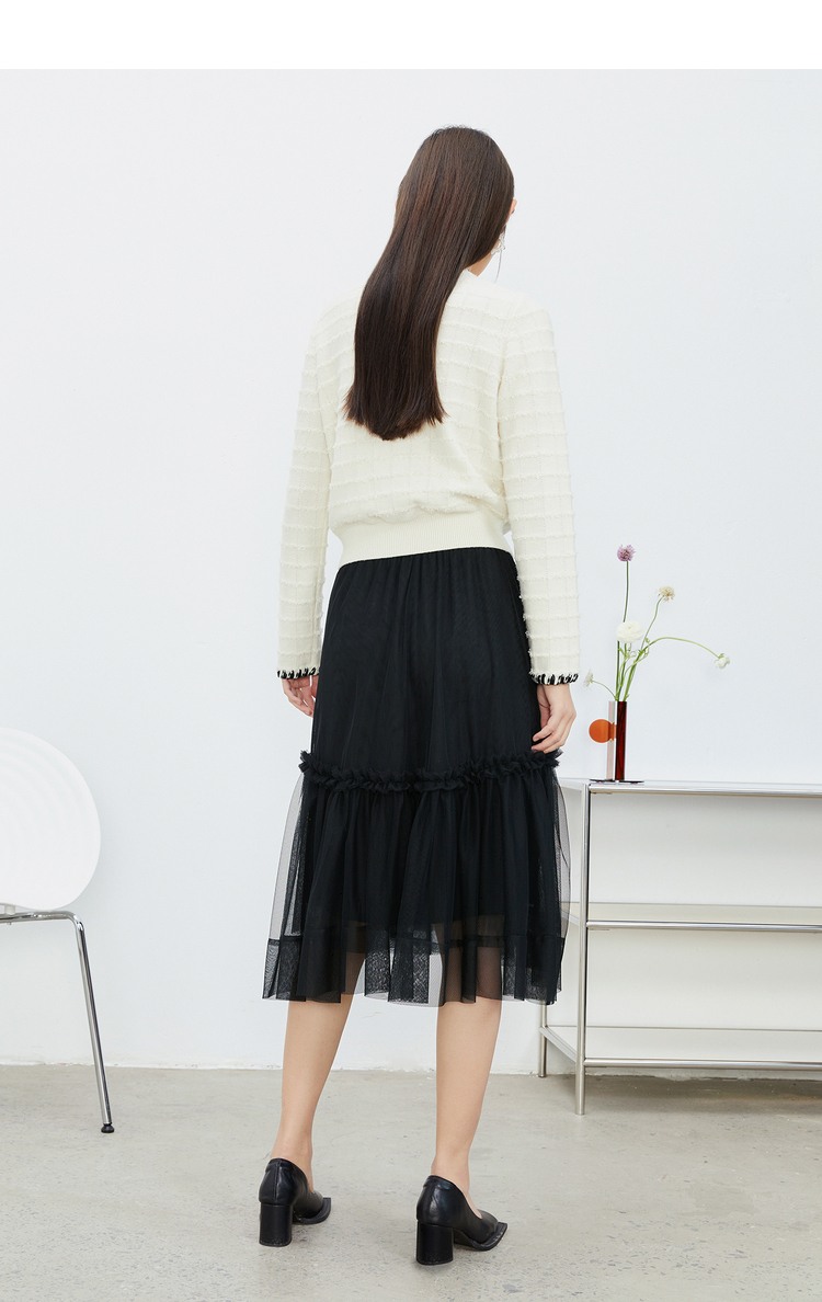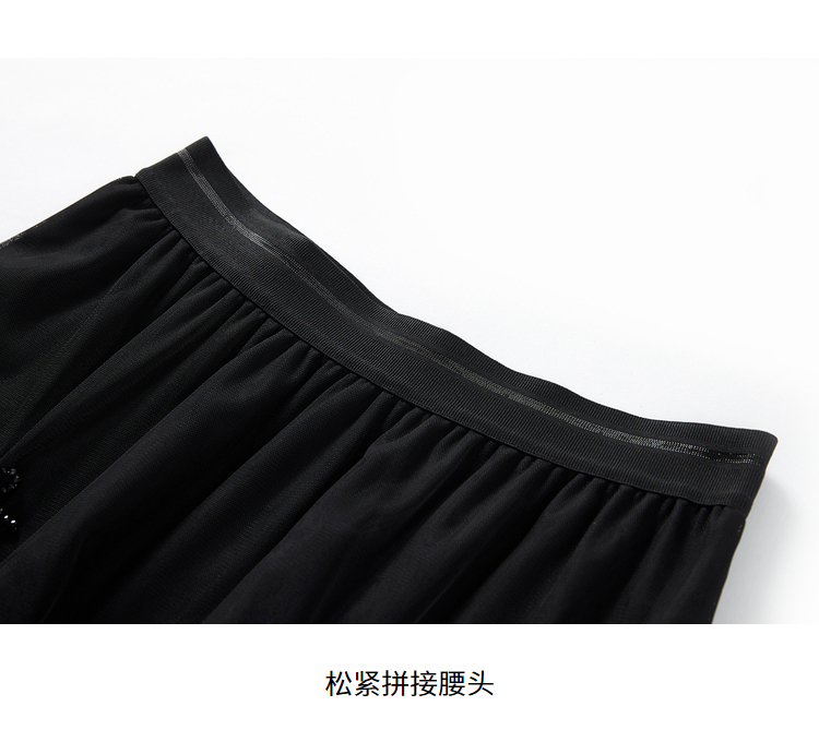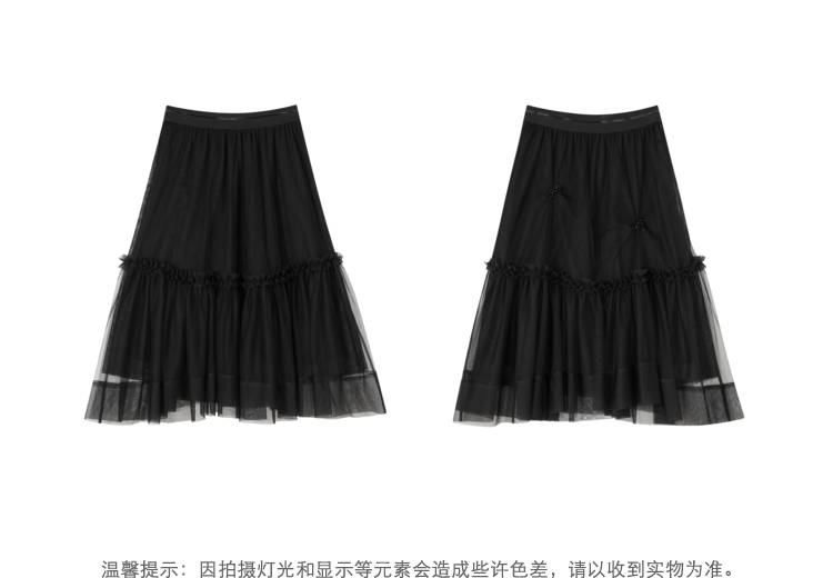 NEELLY纳俪松紧腰纱裙女半身春季抽褶网纱立体蝴蝶结中长裙A字裙N22081E01175