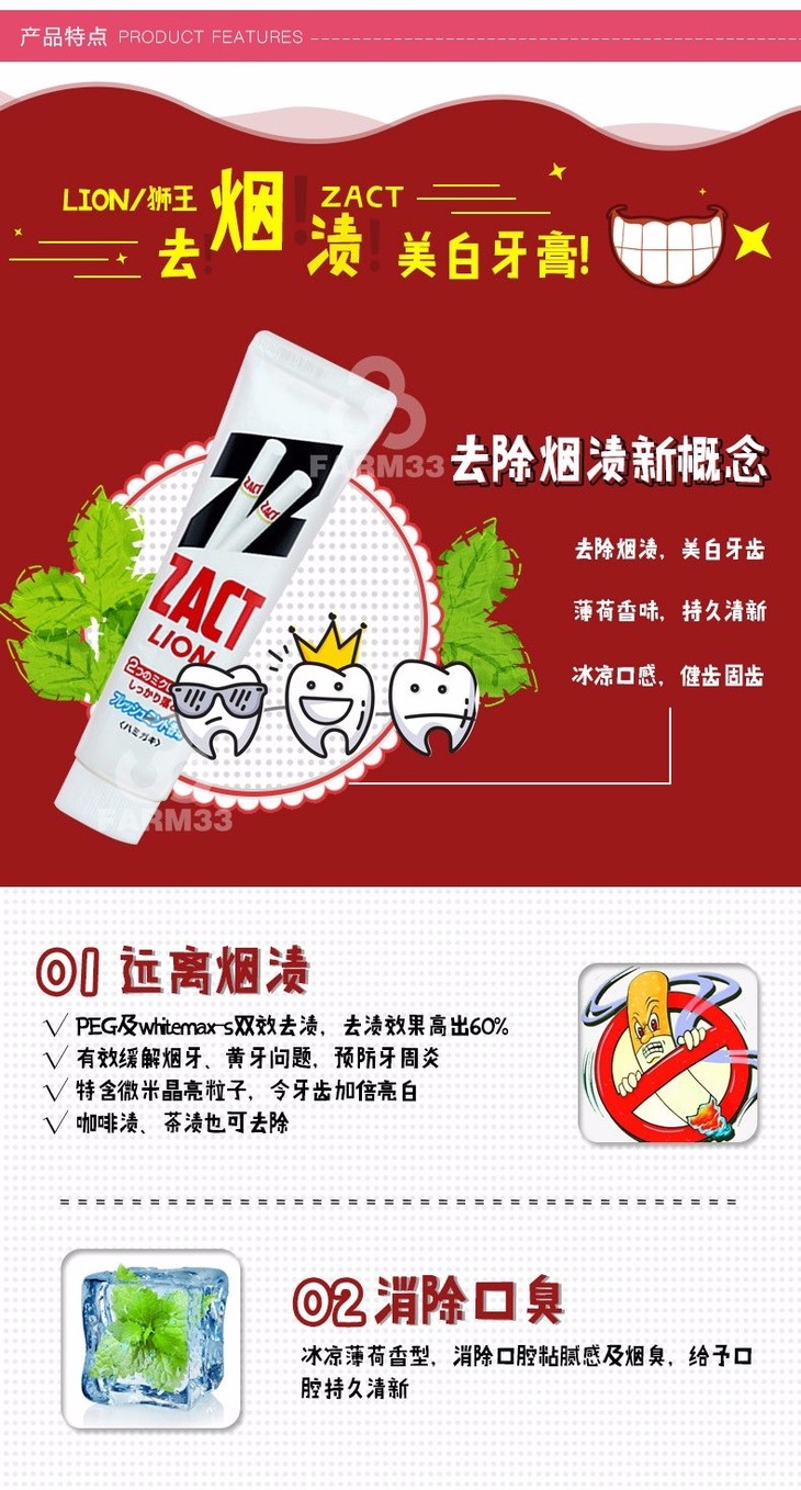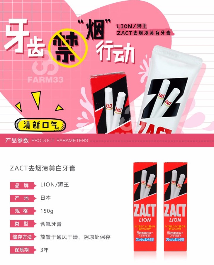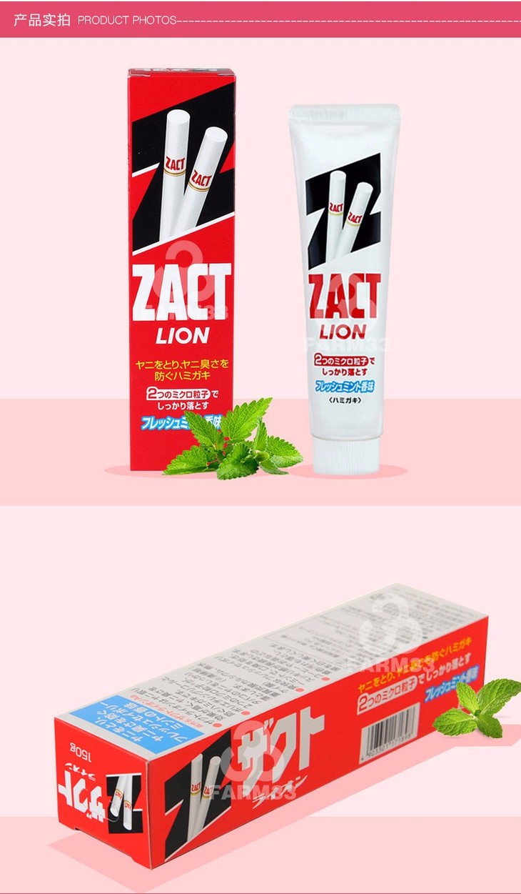 【保税仓】日本狮王ZACT牙膏 去烟渍牙渍 透白牙齿 除口臭 薄荷150g