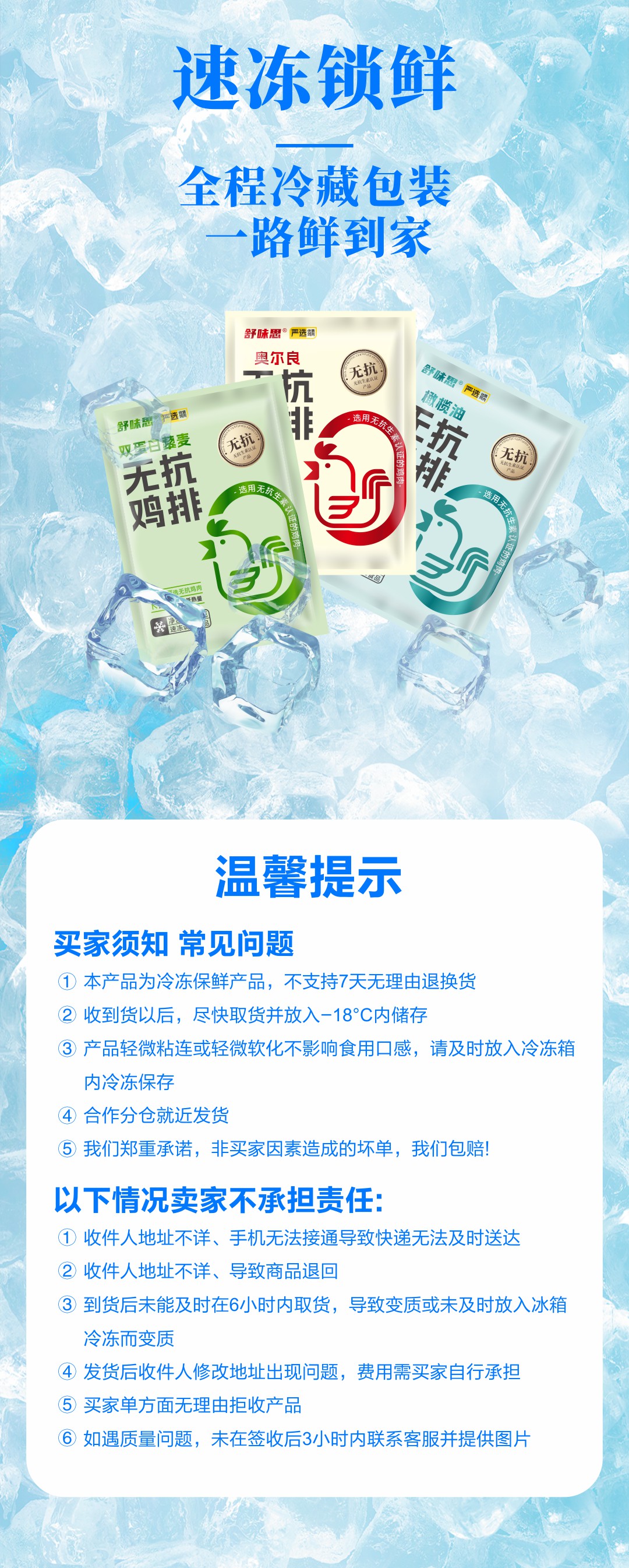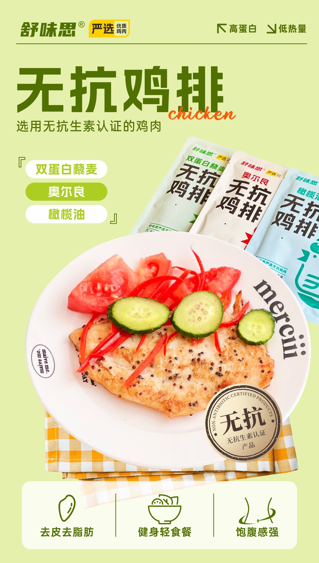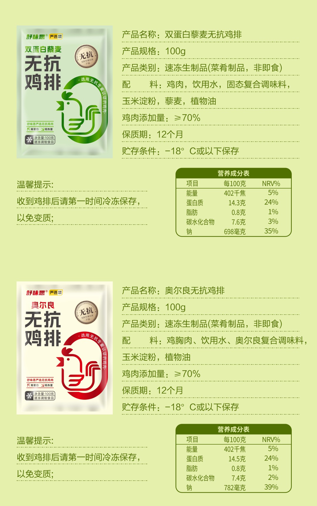 【品名/规格】舒味思无抗鸡排(奥尔良无抗鸡排、橄榄油无抗鸡排、双蛋白藜麦无抗鸡排)