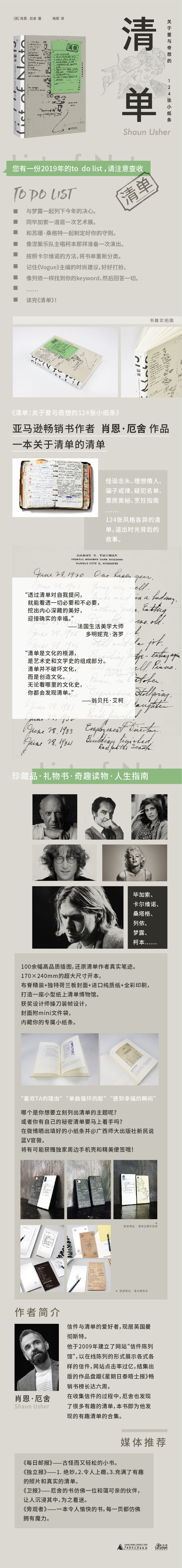 肖恩·厄舍(Shaun Usher),信件与清单的爱好者,现居英国曼彻斯特。他于2009年建立了网站“信件陈列馆”,以在线陈列的形式展示各式各样的信件,网站点击率过亿,结集出版的作品《见信如晤》盘踞《星期日泰晤士报》畅销书榜长达六周,售出多国版权。在收集信件的过程中,厄舍也发现了很多有趣的清单,本书即为他发现的有趣清单的合集。