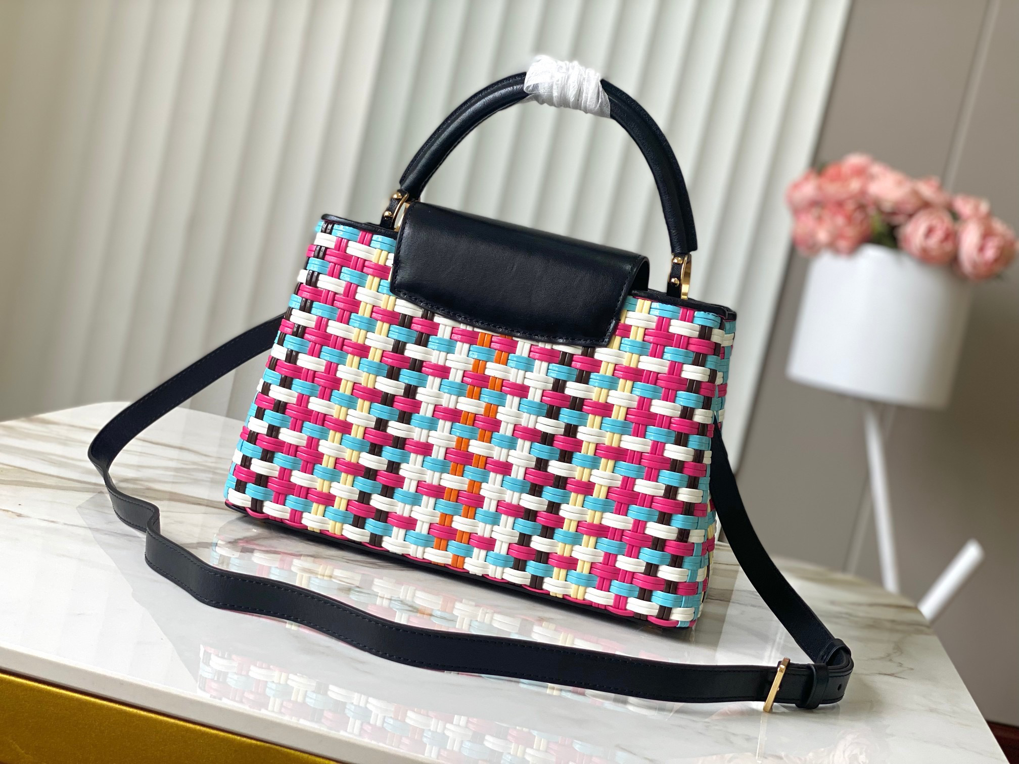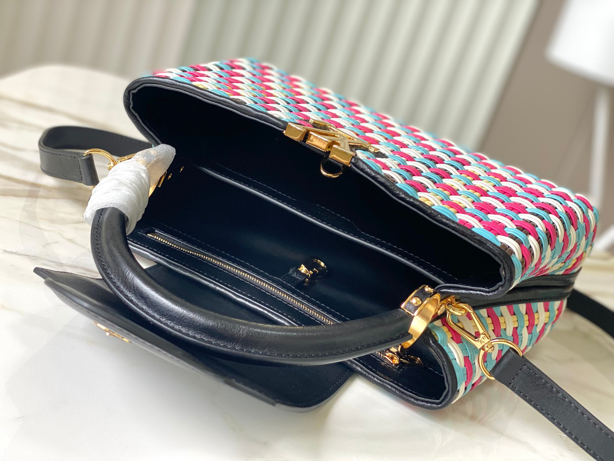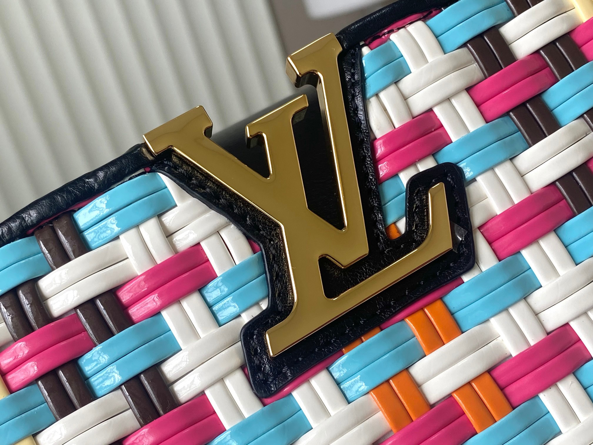 秋冬特惠💰1900 渠道级LV 新品 te级LV 全套包装 M22270/M48865五彩编织〰此款色彩绚丽的Capucines中号手袋由热压涂层细条带梭织而成 呈现富有光泽的编织构造 皮革饰边和金属件与彩色织带相得益彰 塑造精致时尚外观 Size: 31.5 * 20 * 11 cm
