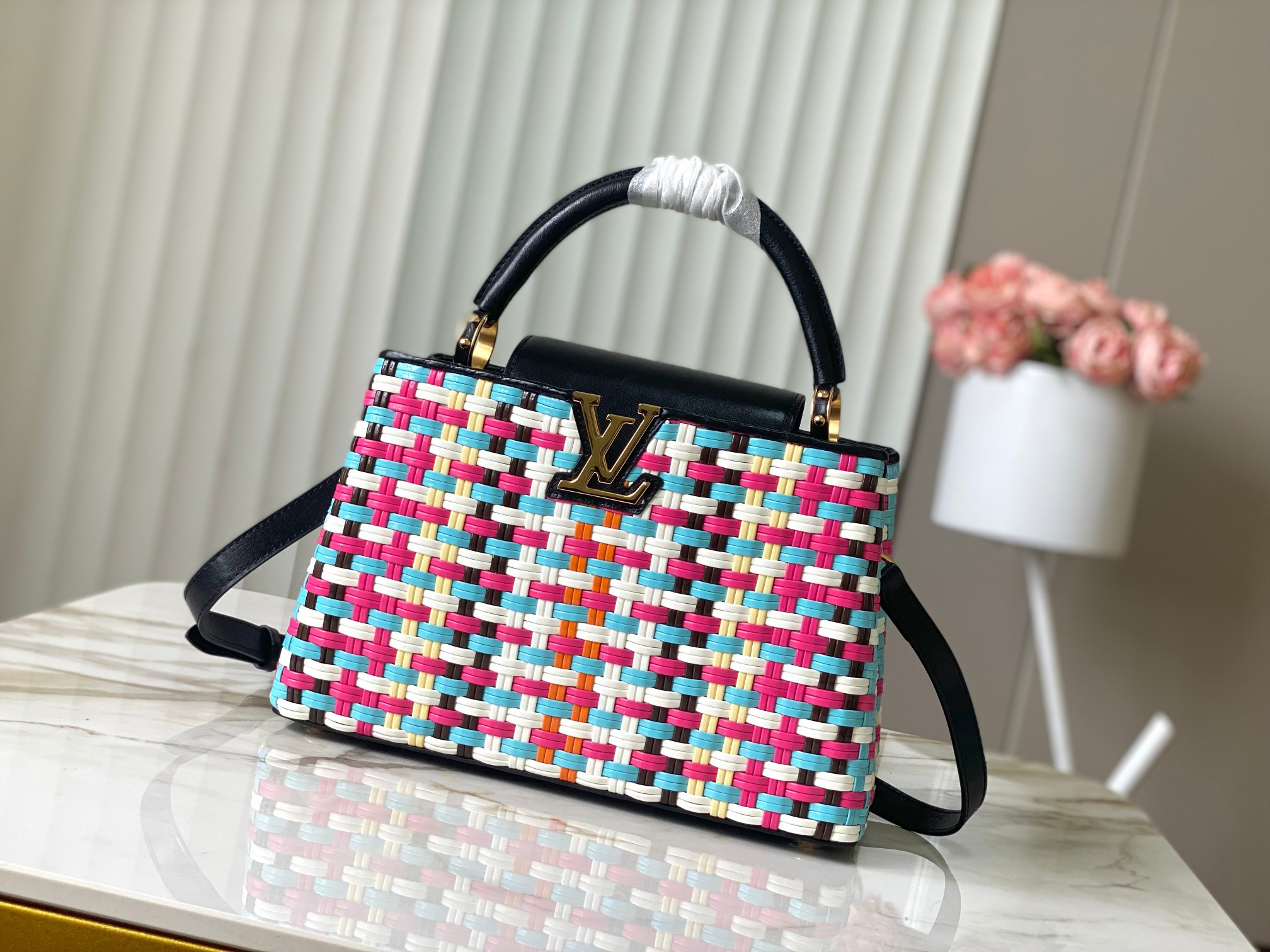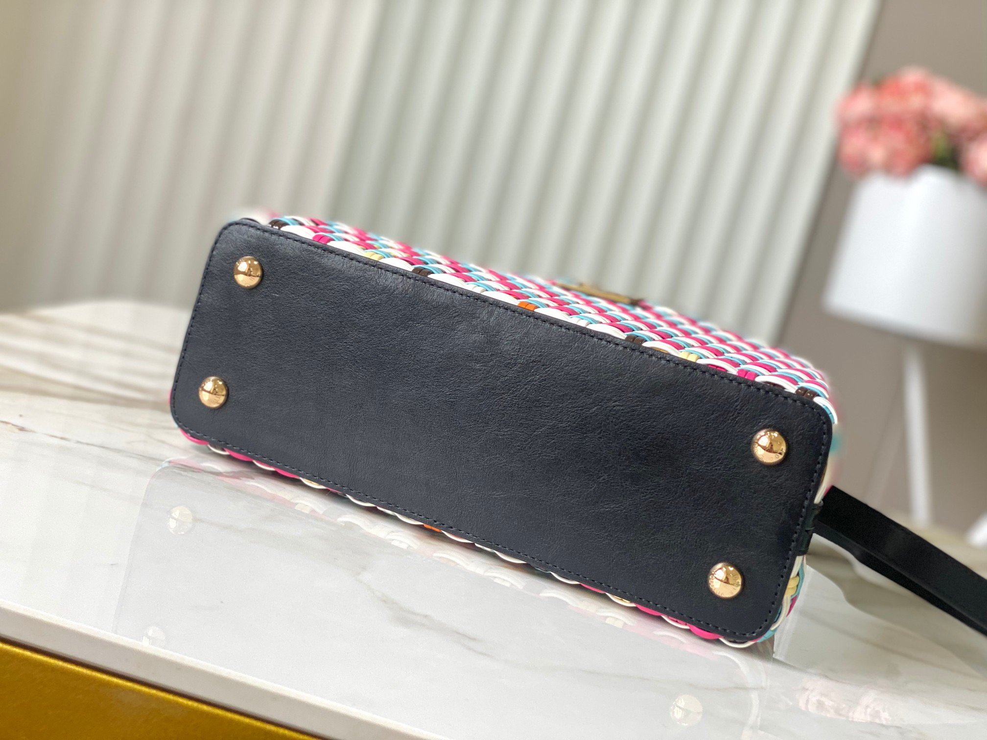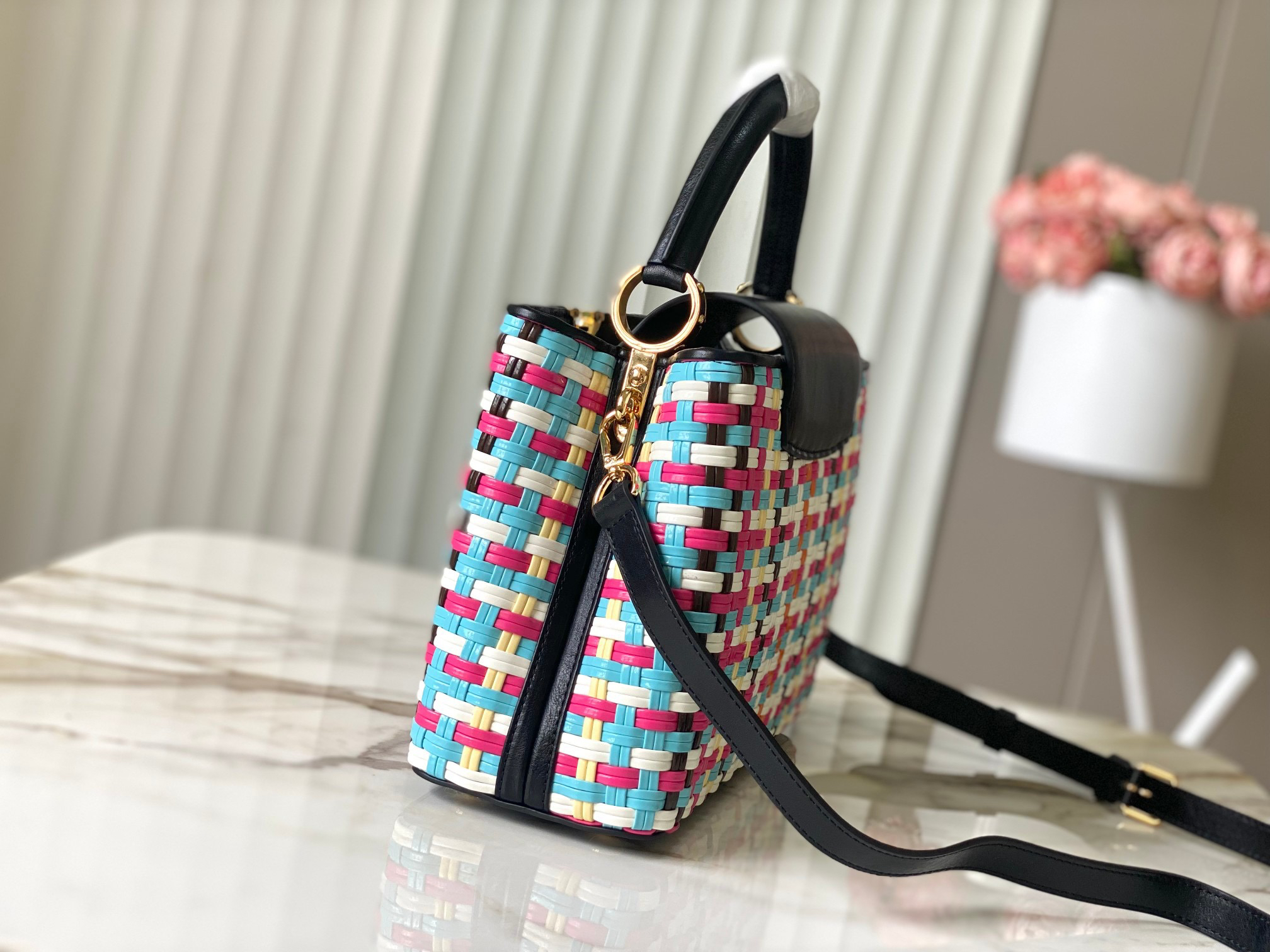 秋冬特惠💰1900 渠道级LV 新品 te级LV 全套包装 M22270/M48865五彩编织〰此款色彩绚丽的Capucines中号手袋由热压涂层细条带梭织而成 呈现富有光泽的编织构造 皮革饰边和金属件与彩色织带相得益彰 塑造精致时尚外观 Size: 31.5 * 20 * 11 cm