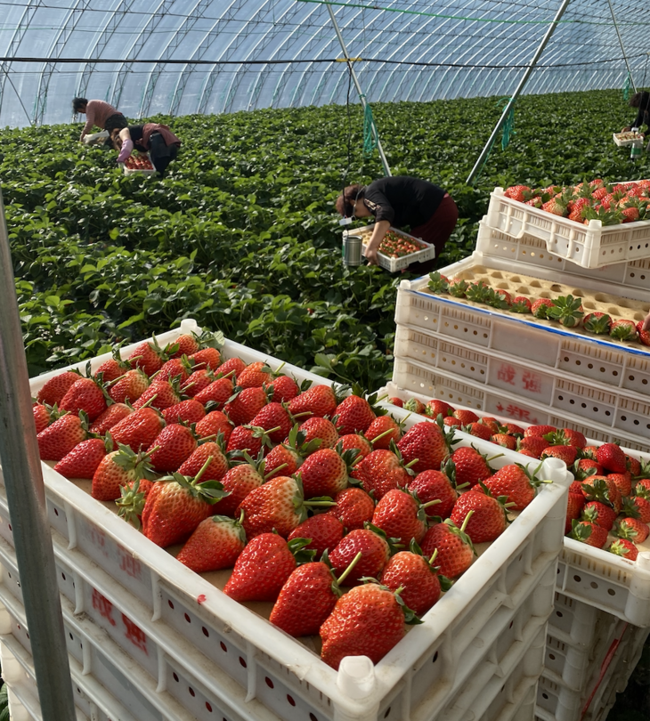 冬天种植草莓自有说法。大棚种植产生了较大的昼夜温差,生长周期较长,糖分和风味物质积累更多,果子自然味道浓郁香甜。不打膨大剂果子也能自然生长。丹东因为特殊的地理位置,成为了冬季草莓的优质产地。