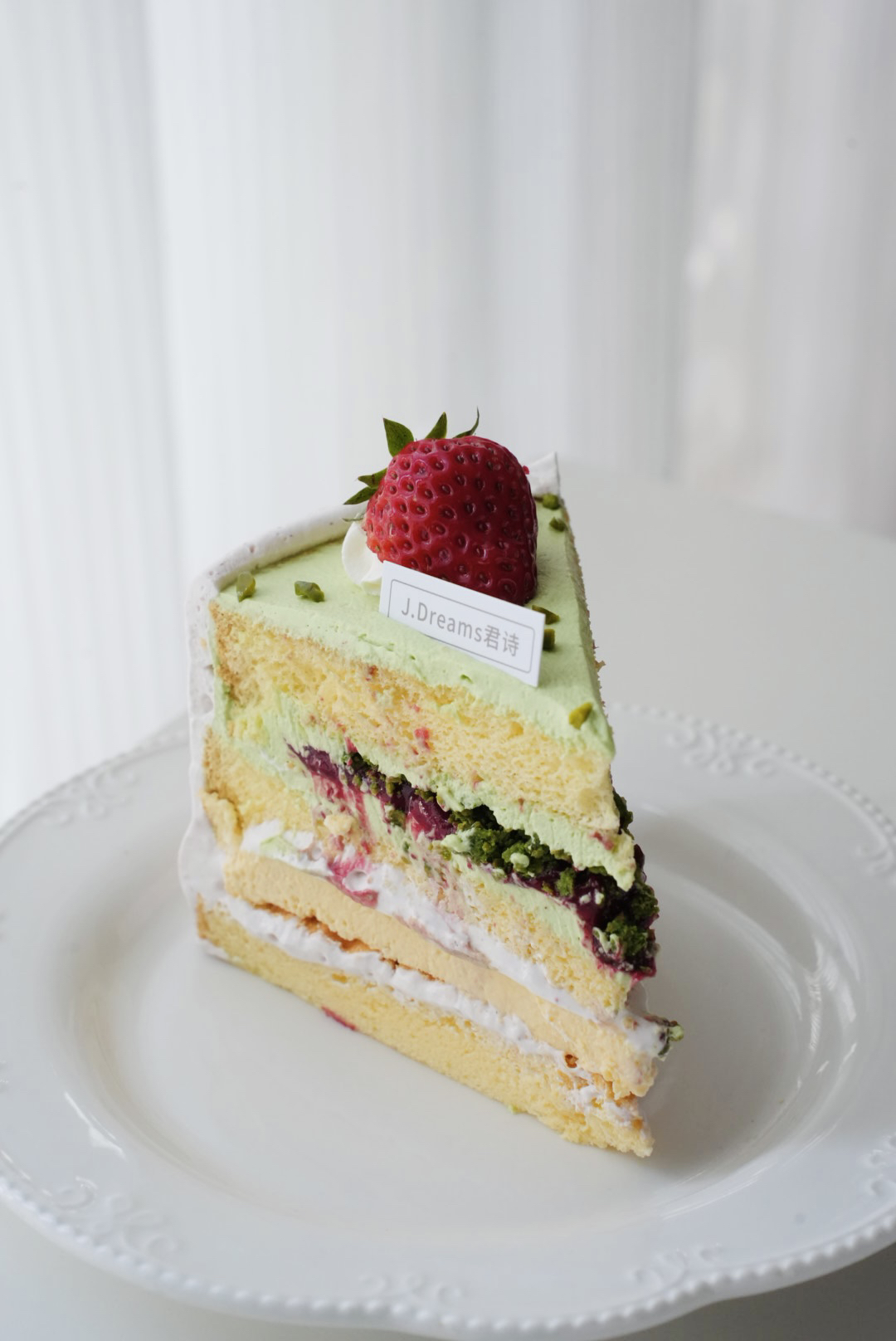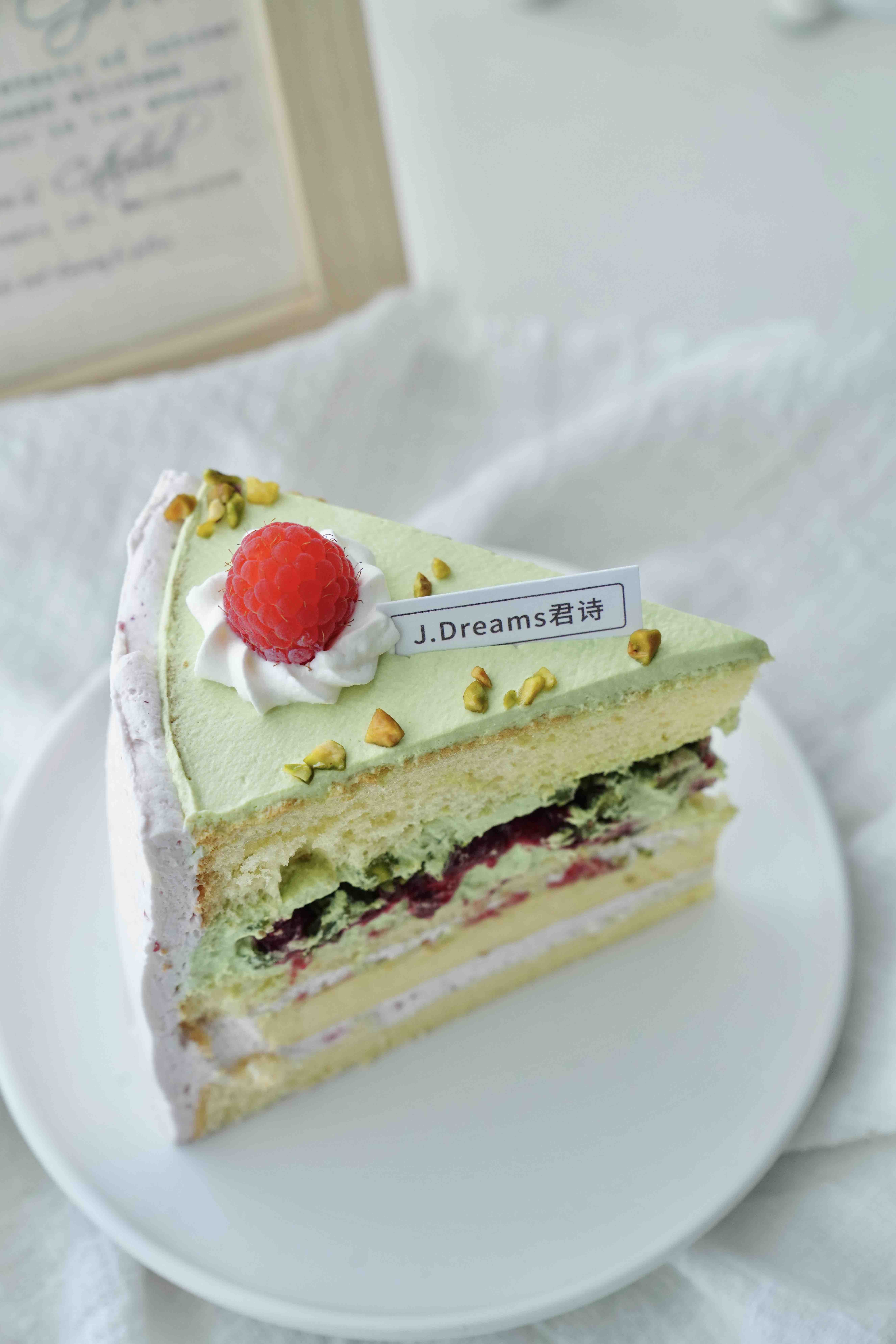 客人说:开心果树莓蛋糕在她心里排第一!轻甜口的开心果奶油坚果香味突出,有酸甜树莓果酱调和,软嫩嫩的烤布雷奶香轻盈,口感层次丰富不会腻口,一口一口不想停下来。