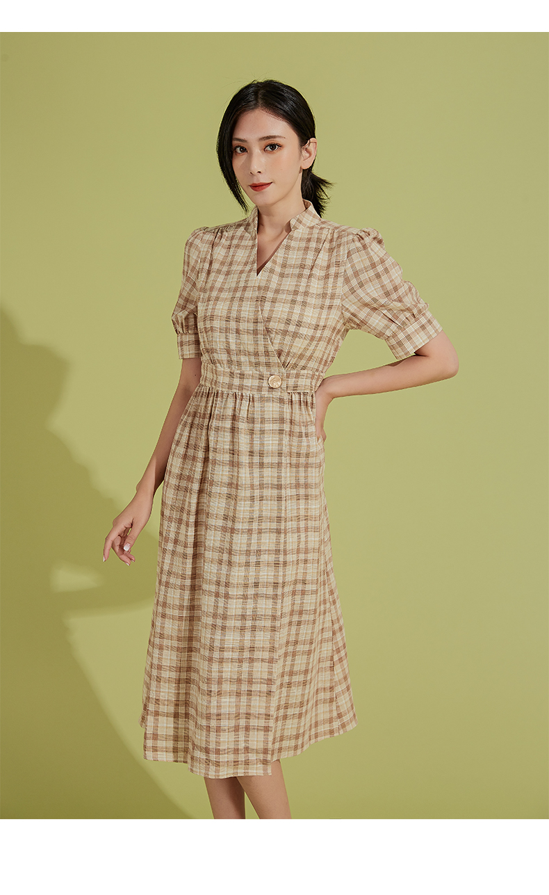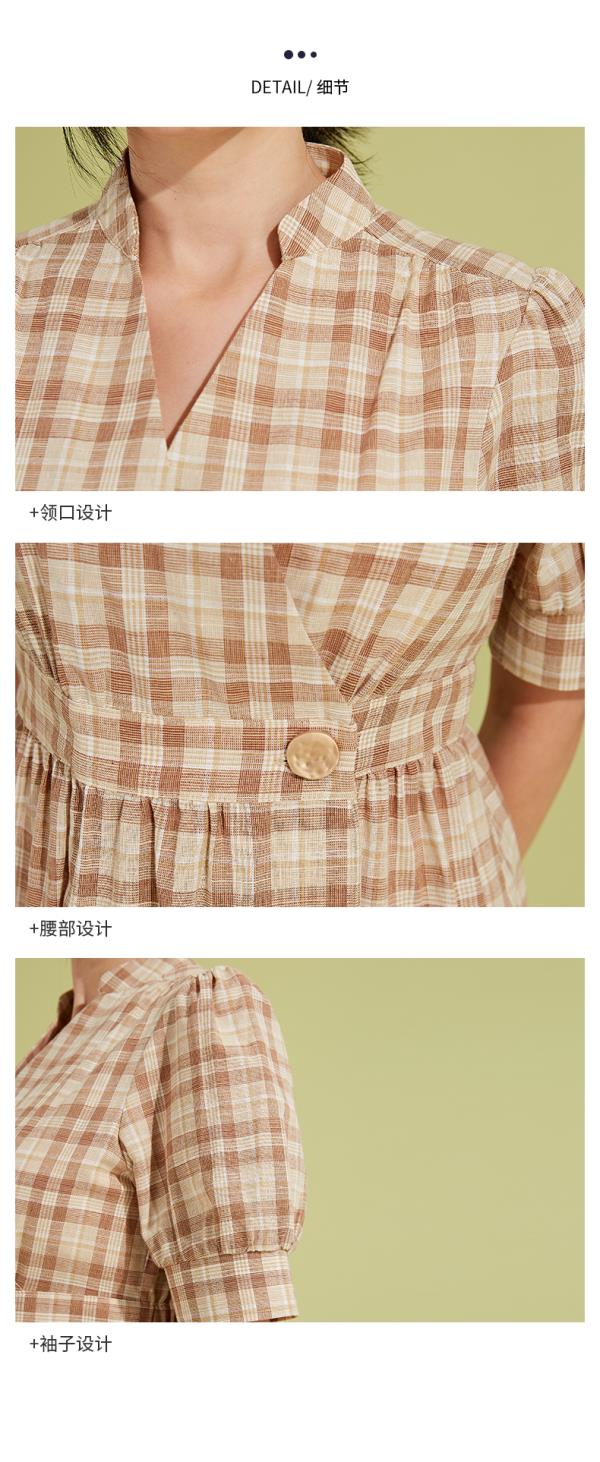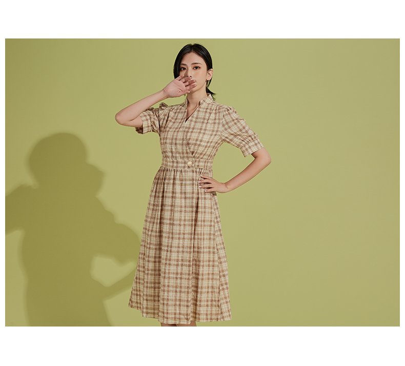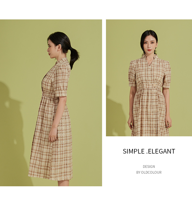 oldcolour秋季V领短袖显瘦格子中长款连衣裙全棉复古田园风裙子BM31101008