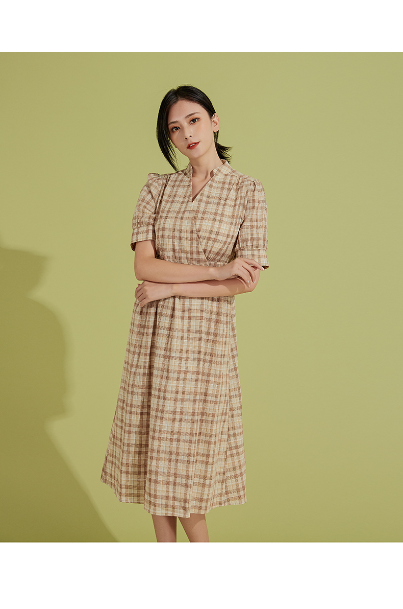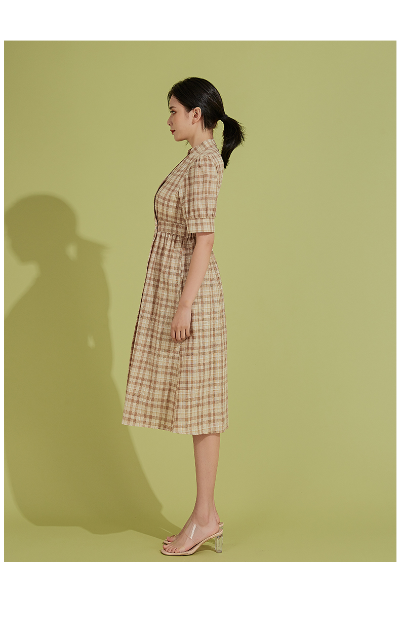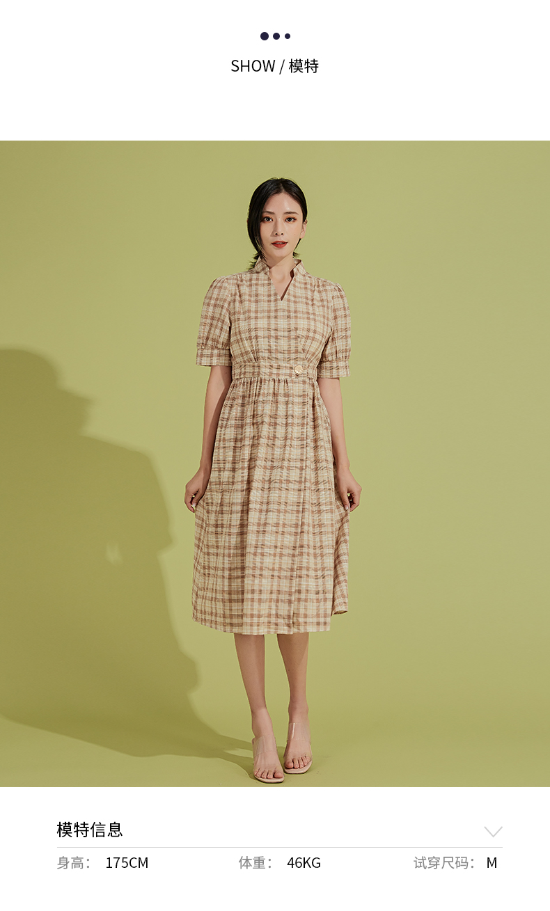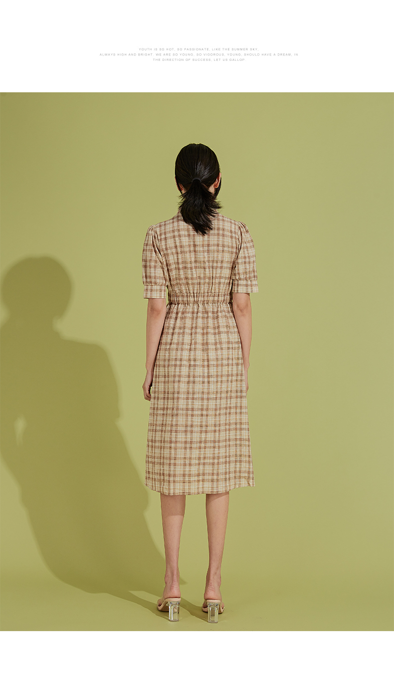 oldcolour秋季V领短袖显瘦格子中长款连衣裙全棉复古田园风裙子BM31101008