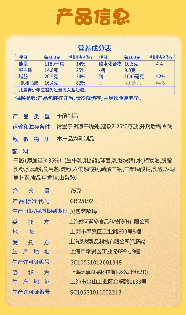 奶酪就选 妙可蓝多。 “妙可蓝多”系上海妙可蓝多食品科技股份有限公司(股票代码:600882)主品牌。妙可蓝多专注奶酪产品,传播奶酪知识和奶酪文化,致力于打造中国市场奶酪第一品牌。