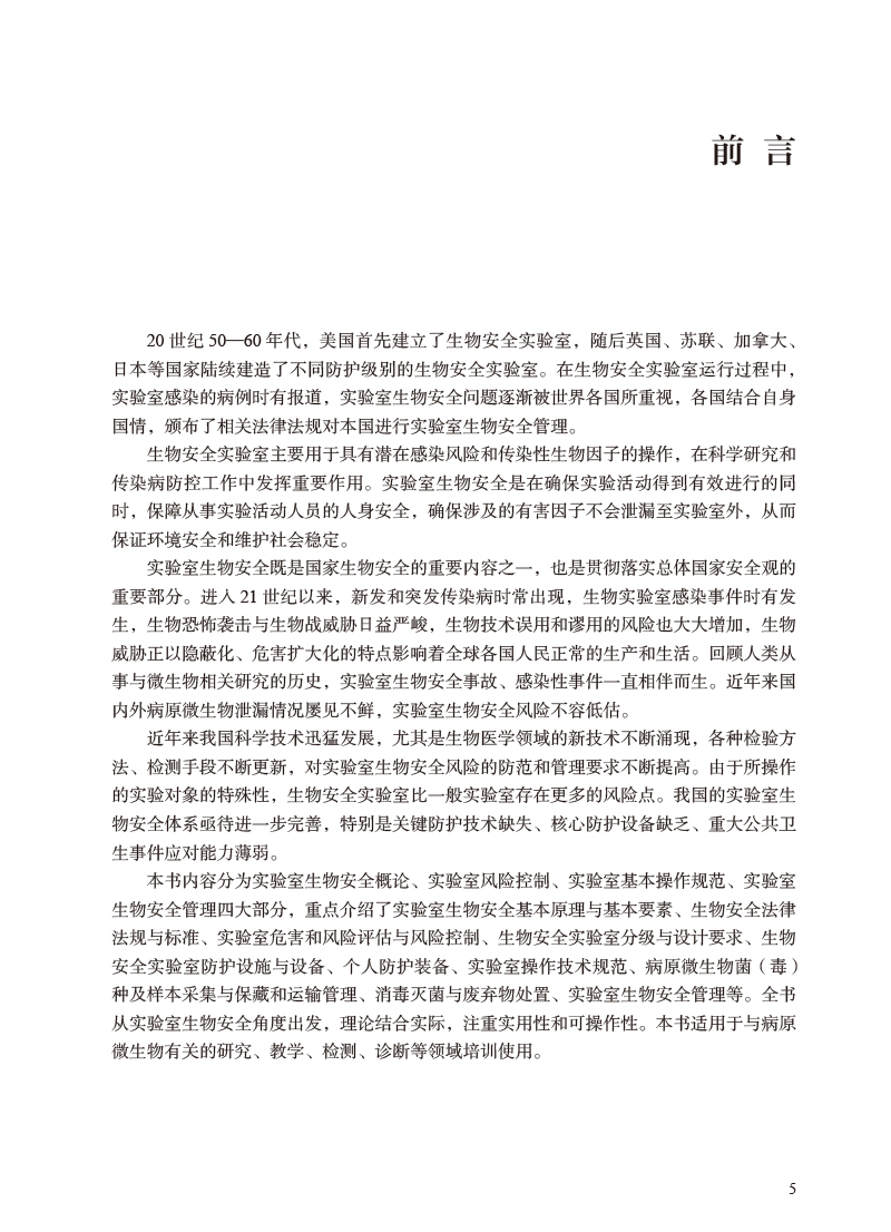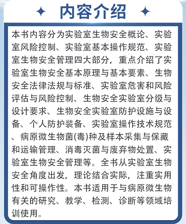 从国家生物安全战略和需求出发,围绕实验室生物安全特点和定位,重点内容包括实验室生物安全基本理论与实践原理,病原微生物风险评估,实验室生物安全管理体系构建,生物安全实验室设施设备建设与运行等,同时将近些年我国生物安全**理论和研究成果作为全书的亮点呈现给读者,满足当前国家生物安全工作需要。**肺炎**发生以来,党中央国务院高度重视生物安全工作,已将生物安全作为国家安全的组成部分,纳入总体国家安全观。病原微生物实验室生物安全是国家生物安全的重要组成部分。此书出版,在即将颁布出台生物安全法的国家安全战略背景下,适应我国生物安全国家战略需求,具有重要现实和发展意义,不仅满足国家战略需求,同时也将满足从业人员不断增长的对**知识和技能培训所需。在即将颁布的生物安全法二审稿中,将实验室生物安全作为一章,提出了明确要求。因此,出版相关教材,开展针对性教育和培训,将提高医学相关学科学生的基本知识和技能,同时也将提高相关从业人员的意识和能力,切实做好实验室生物安全,确保国家安全。党中央国务院高度重视生物安全工作,已将生物安全作为国家安全的组成部分,纳入总体国家安全观。病原微生物实验室生物安全是国家生物安全的重要组成部分。