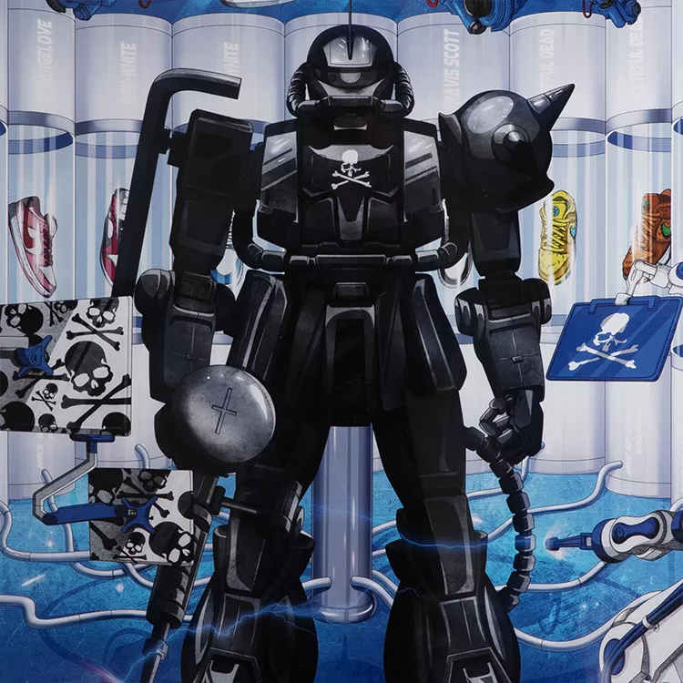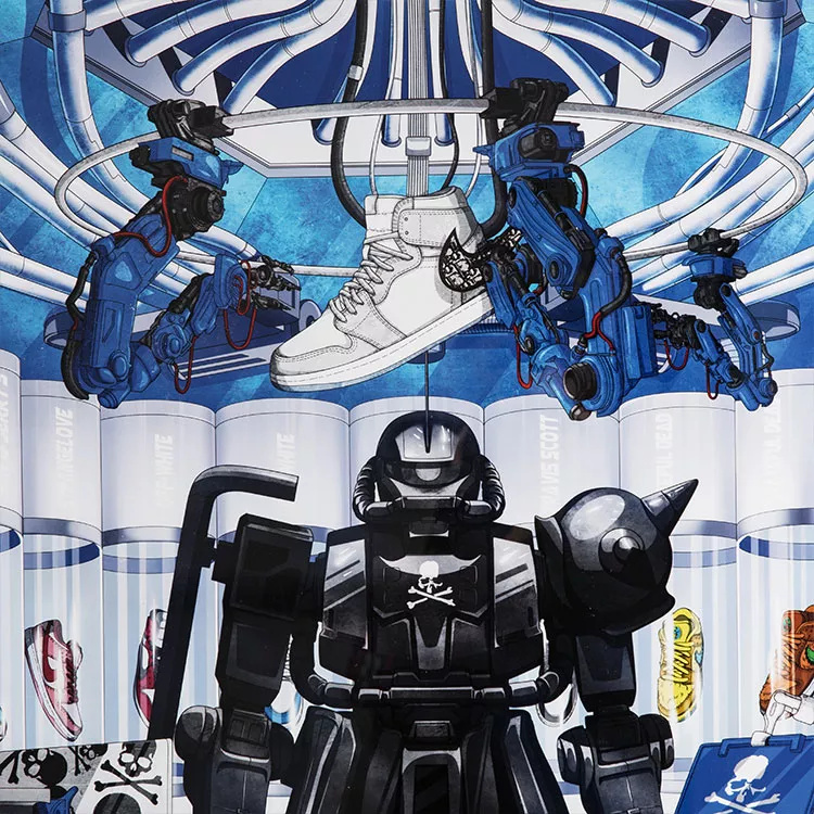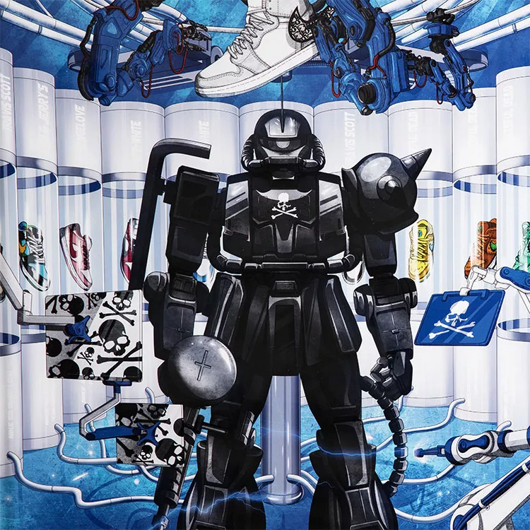 画作以动画片《机动战士高达》里的机动战士高达、扎古为创作原型。高达是联邦研制的定量的机动战士,是专门给英雄级别的人物使用的;而扎古只是高达系列中的机体,供普通士兵使用,因其风格粗暴神威,所以历代高达迷都有一句“小朋友才开高达,真男人都开扎古”的说法。扎古头顶上的DIORx AJ1球鞋正在研究中,背后也罗列着一双双球鞋,简直是弄潮儿向往的地方!