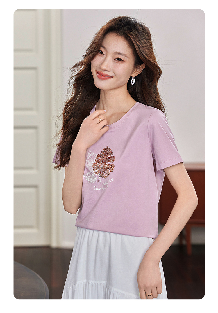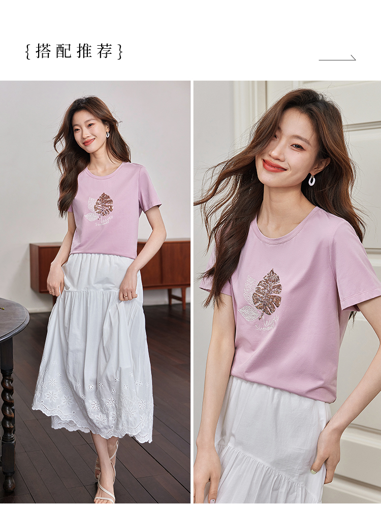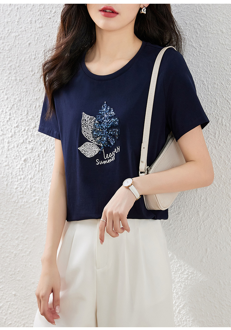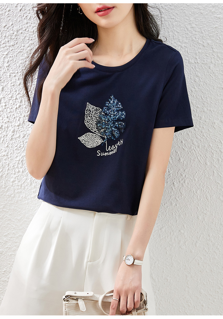 【专属特价】熙世界珠片叶子刺绣短袖T恤女短袖宽松显瘦圆领体恤衫2022夏新款