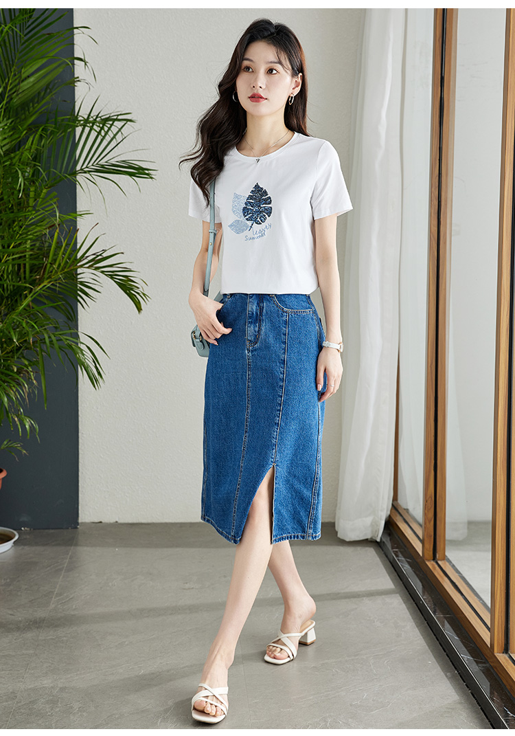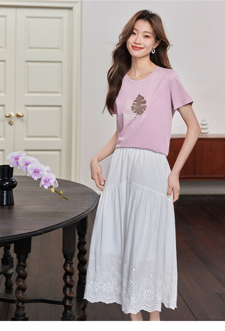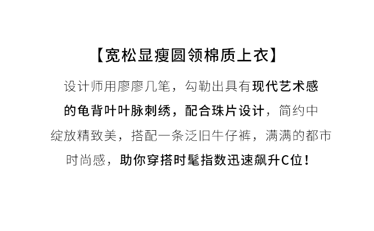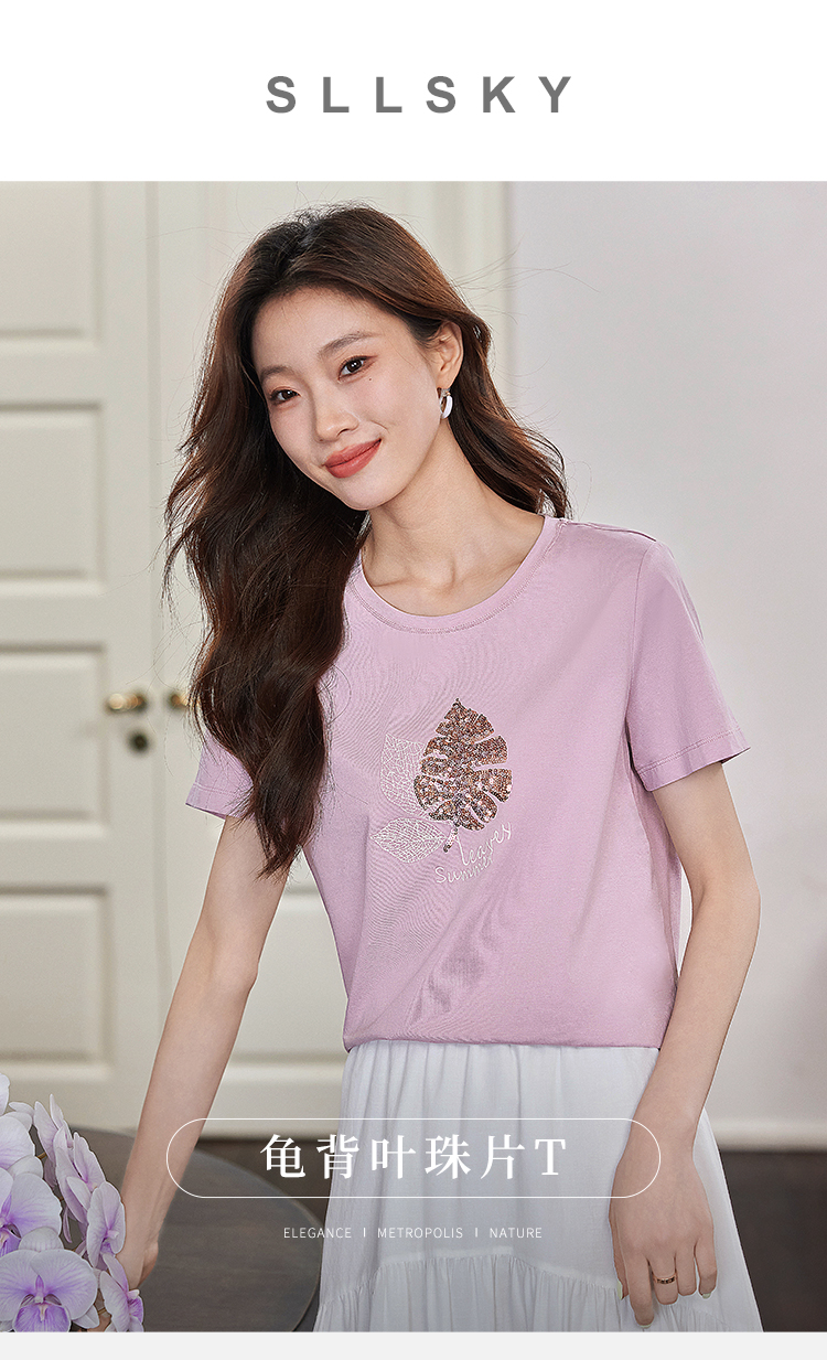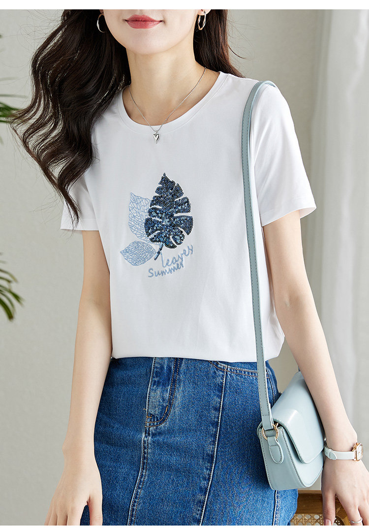 【专属特价】熙世界珠片叶子刺绣短袖T恤女短袖宽松显瘦圆领体恤衫2022夏新款