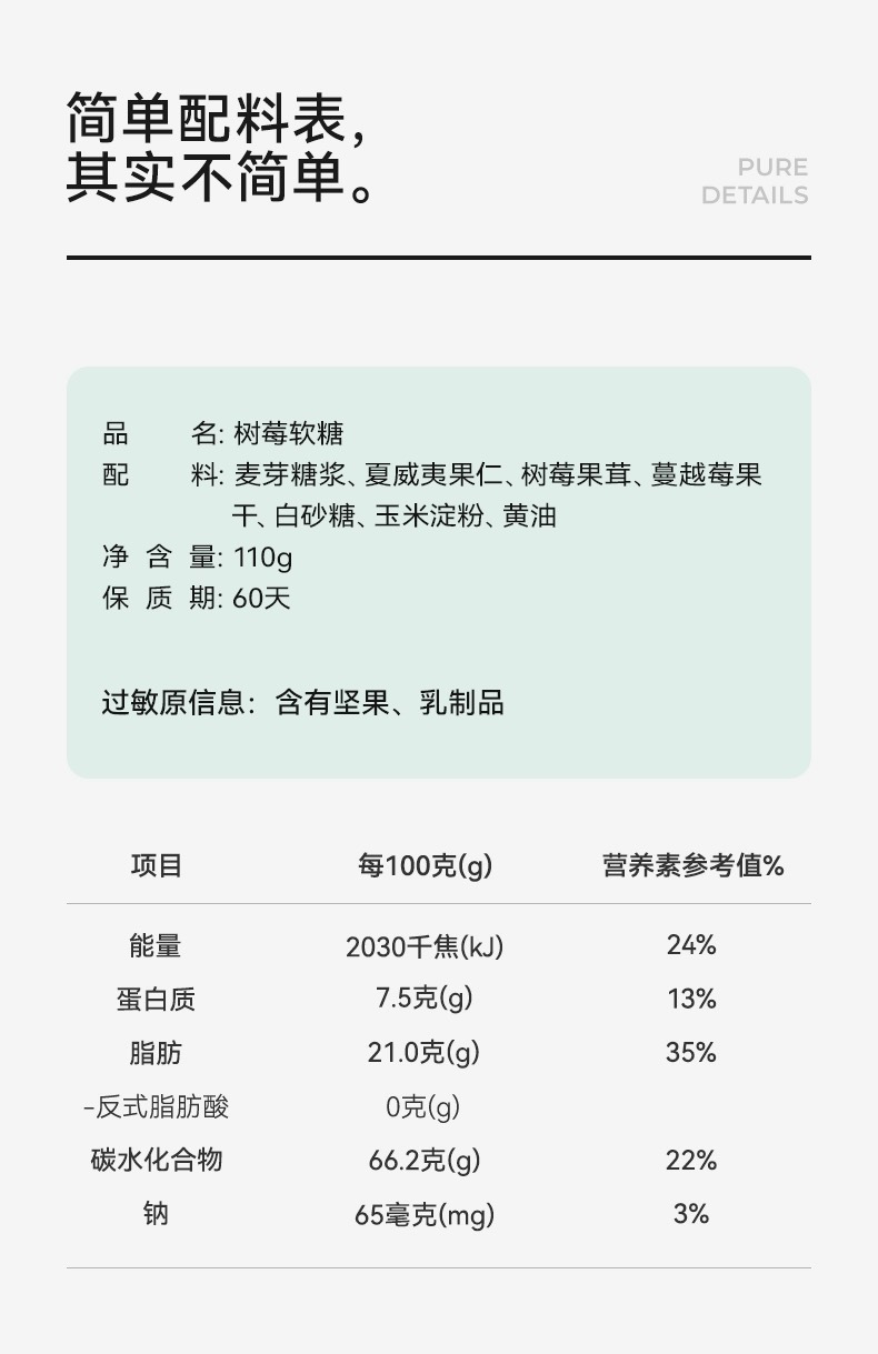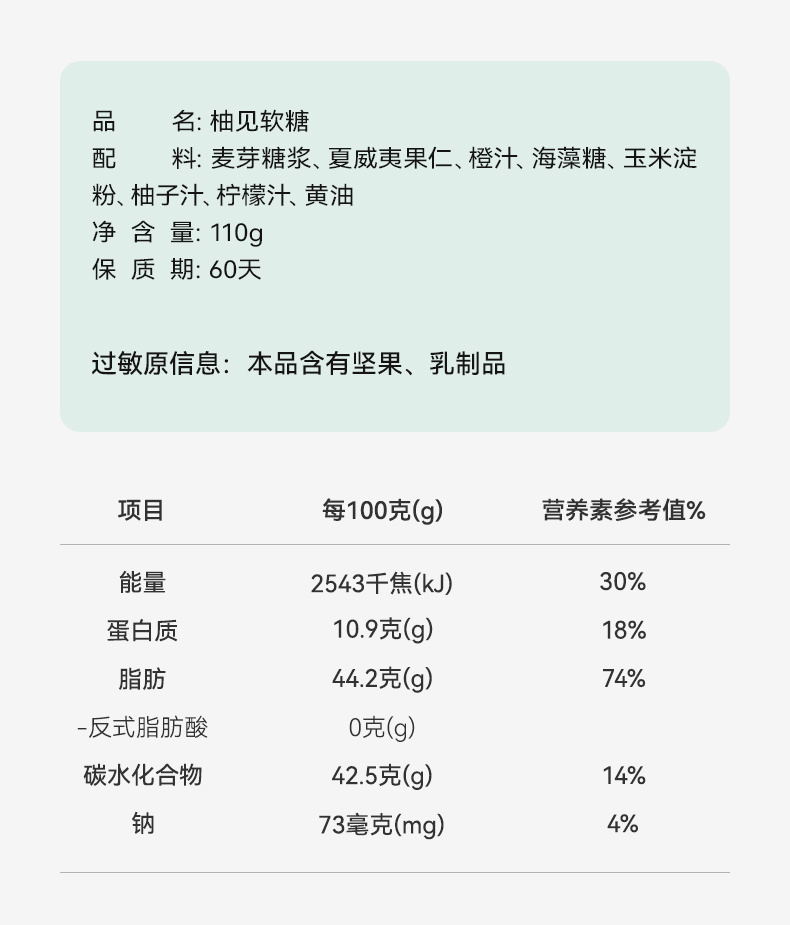 【品名】:米惦树莓软糖/柚见软糖 【产品规格】:110g/盒 【保质期】:60天 【树莓软糖配料表】:麦芽糖浆、夏威夷果仁、树莓果茸、蔓越莓果干、白砂糖、玉米淀粉、黄油 【柚见软糖配料表】麦芽糖浆、夏威夷果仁、橙汁、海藻糖、玉米淀粉、柚子汁、柠檬汁、黄油 【储存方式】:存放于干燥、凉爽处,开封后请立食用。 【发货地】:福建漳州 【发货时效】: 72小时内发出 【发货快递】:中通、申通随机发不指定 【补运费地区】:北京,上海+1元,甘肃、内蒙古、宁夏运费加14元,青海、新疆、西藏运费加16元。 【致敏物提醒】:本产品含有坚果、乳制品 【售后说明】: 1、食品无质量问题不支持 7 天无理由退换。 2、产品少发、漏发,质量问题,请提供产品连同快递单(需看见单号)一起拍照24 小时内发给客服核实处理。 3、如包裹破损、挤压严重请拍照签收,签单破损签收,请在签收48小时内拍照联系客服处理。 4、产品已经发出的情况下,不建议更改地址、不退货,下单前,请仔细核对信息!货物产生物流单号,无法拦截,如需拦截须支付快递费用。