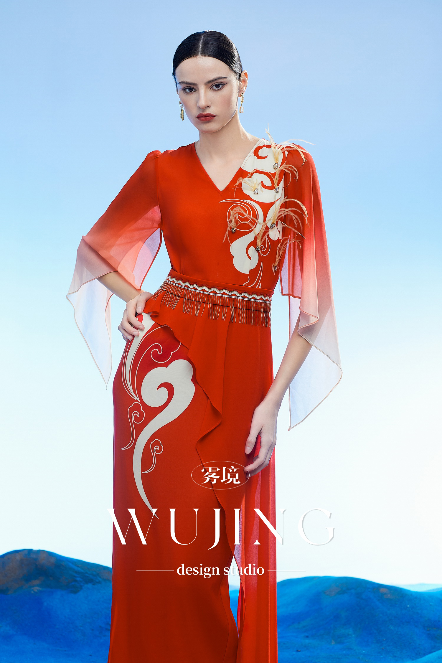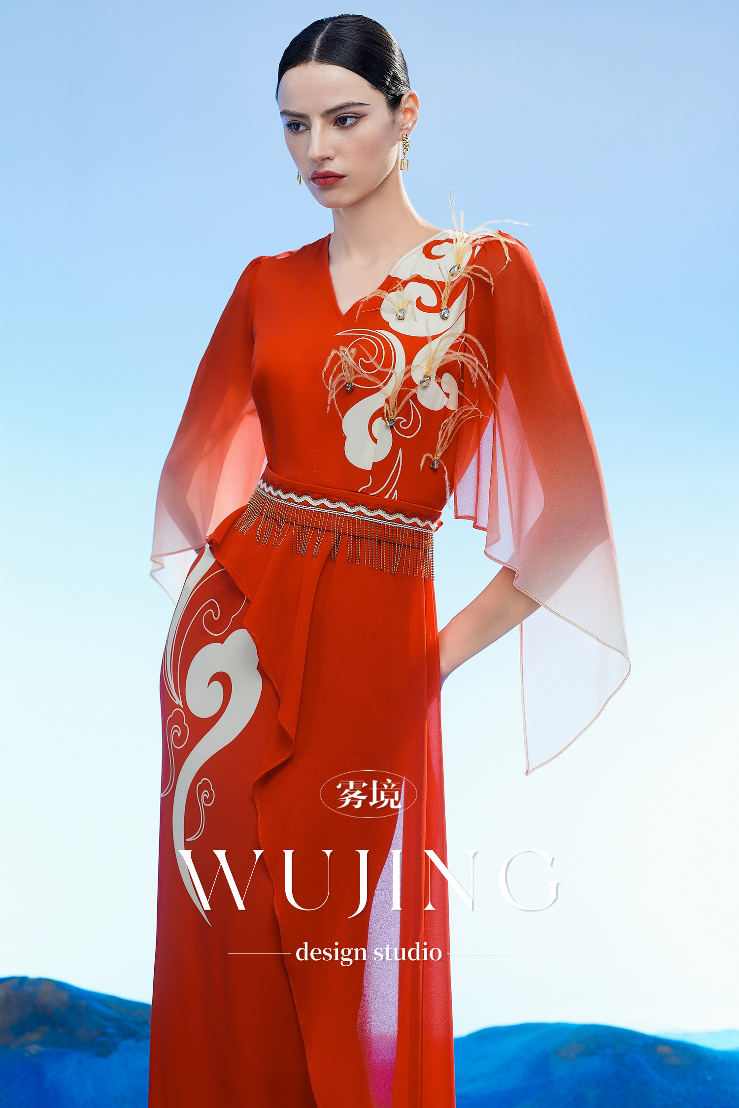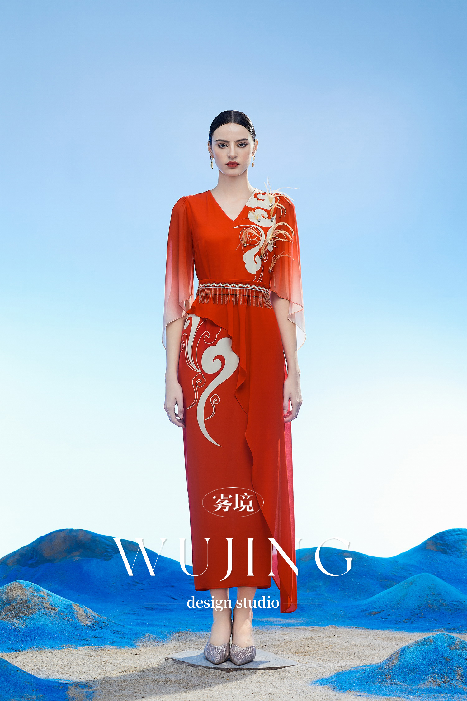 3204062 云漫琉璃 定制印花韩国进口水晶乔其纱进口纹理蜂窝缎连衣裙 雾境
