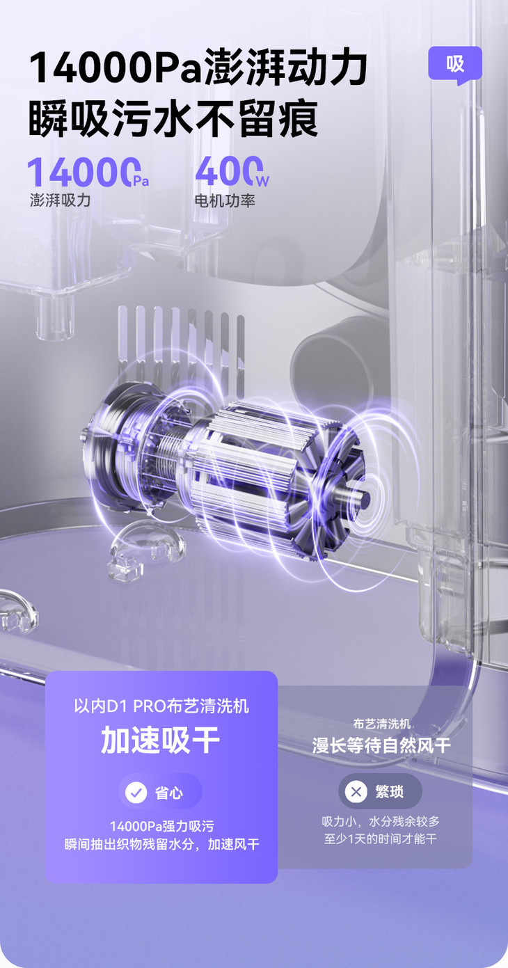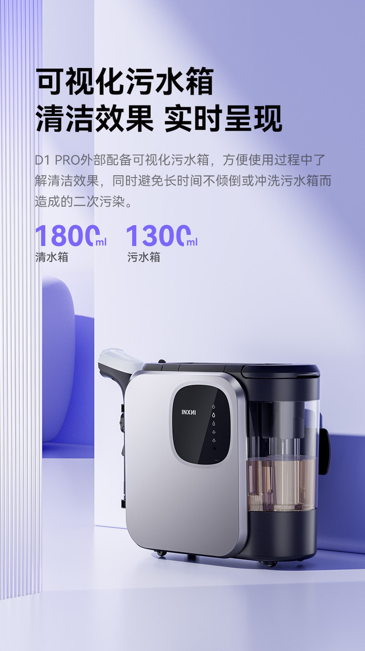 为什么看上去扫过污渍就能清理干净❓ INXNI以内七合一体多功能布艺清洁机D1 Pro布艺清洗机 通过增压喷水,高温热水快速溶解深层脏污, 过程配合细密圆束刷头,顽渍一刷就脱,再通过14000Pa大吸力, 大力抽吸织物深层的污水,把洗出来的脏污回收至污水箱~