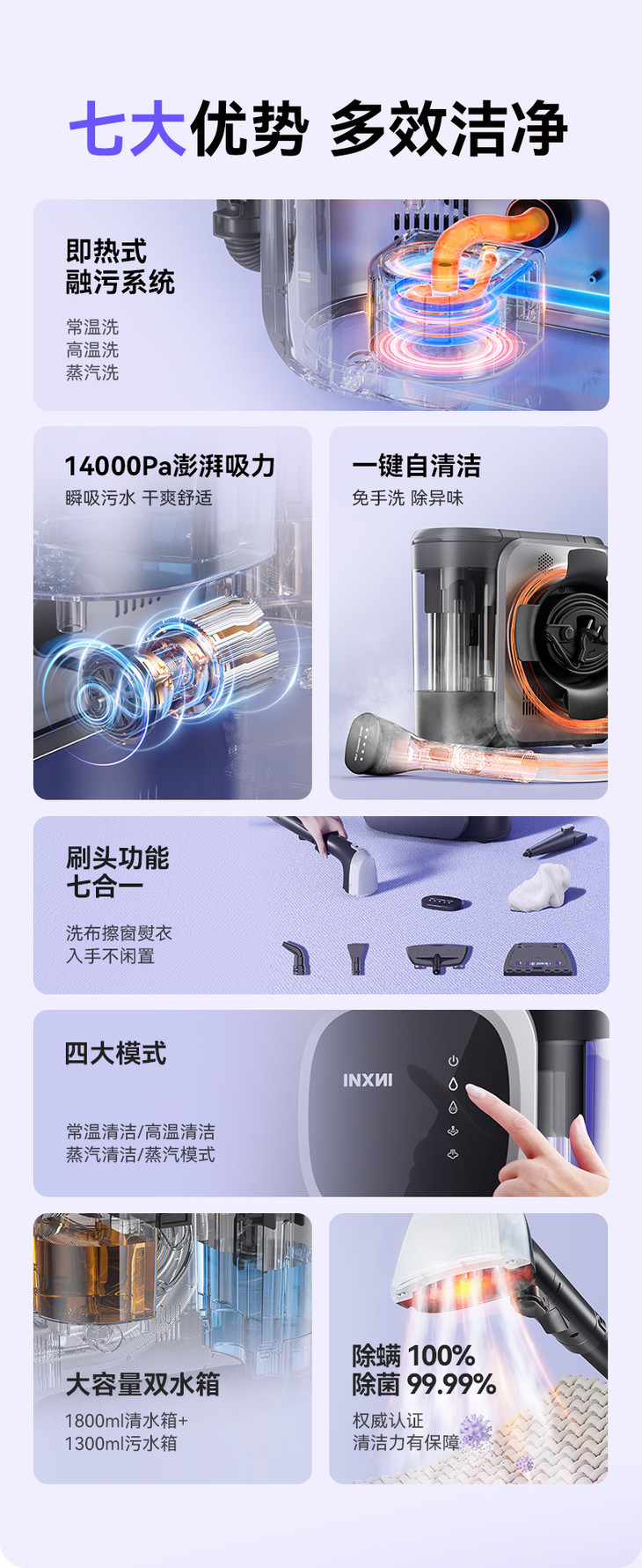 七大优势 多效洁净!! 即热式溶污系统、高温清洗、蒸汽清洗、 14000怕澎湃大吸力,瞬吸污水,干爽舒适 一键自清洁,免手洗、除异味, 七合一多功能刷头 洗布擦窗熨衣,入手不闲置 四大模式,自带智能语音系统 大容量双水箱,1800ml清水箱+1300ml污水箱 除螨100%+除菌99.99%,权威认证,清洁力有保障!