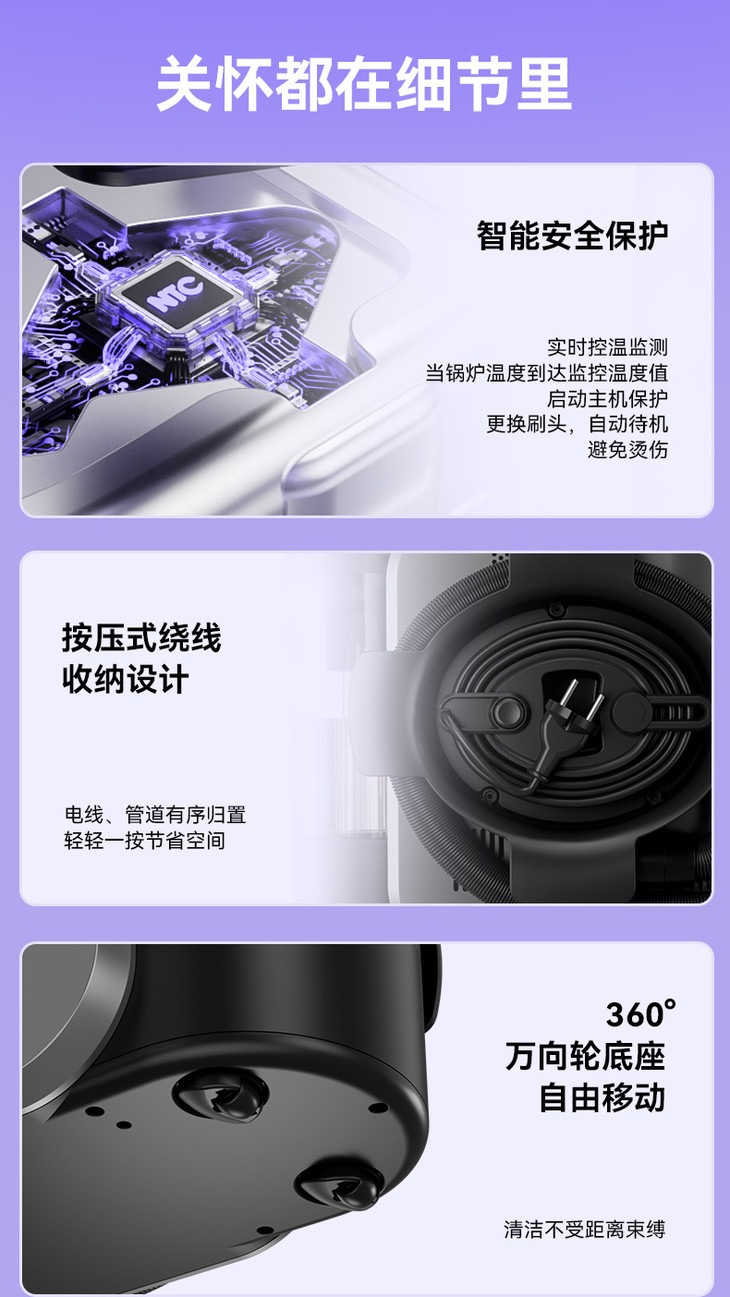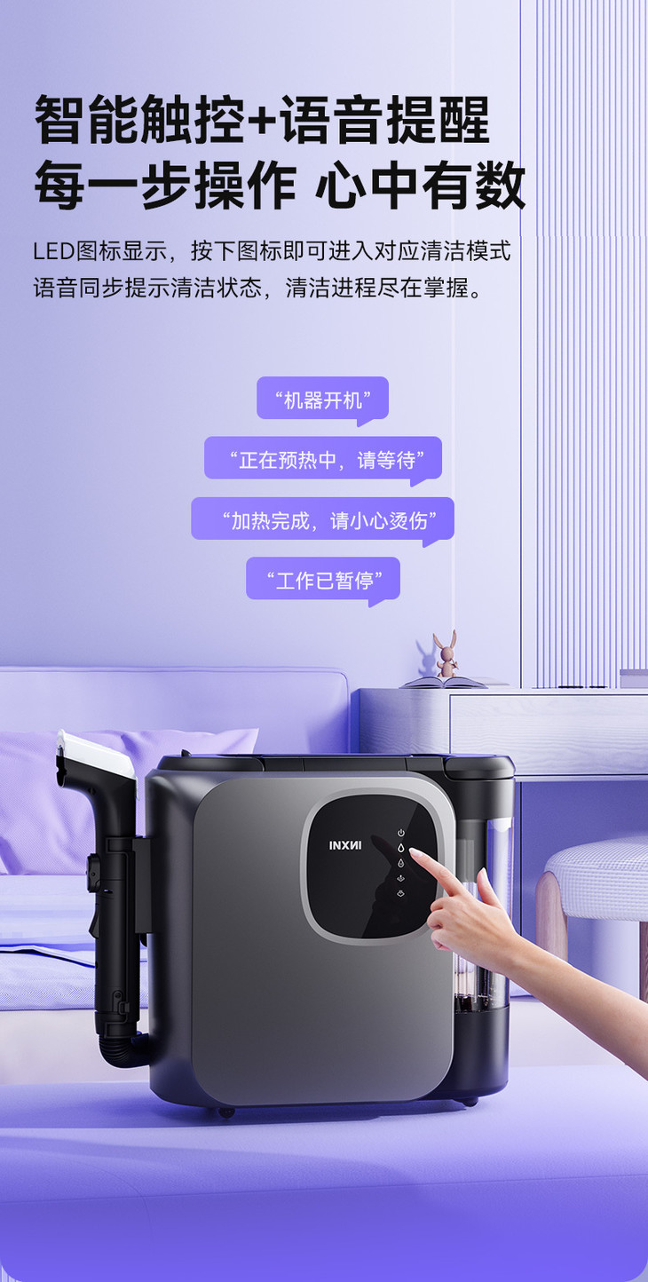 ✔️智能语音 专心清洁的时候总是很容易忽视满水缺水的问题 智能语音提示让你清洁到哪一步都心中有数 缺水、预热、防烫提醒、满水、都会贴心的提醒你! 使用蒸汽功能更是令人省心~预热状态实时提醒,安全系数蹭蹭涨。 需要除垢也会及时通知,不用再靠猜,简直不要太方便!
