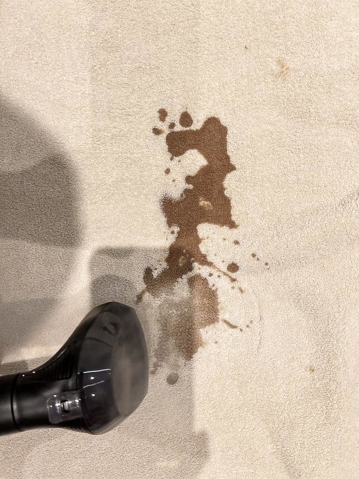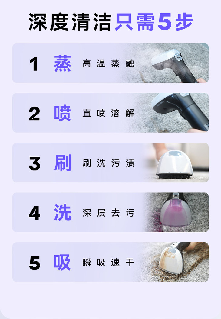 只需喷刷吸,清洗很容易 STEP1: 先对着脏污区域一键增压喷水; STEP2: 用软毛刷头刷洗污渍; STEP3:把刷头直立贴合布艺织物,吸走脏污。