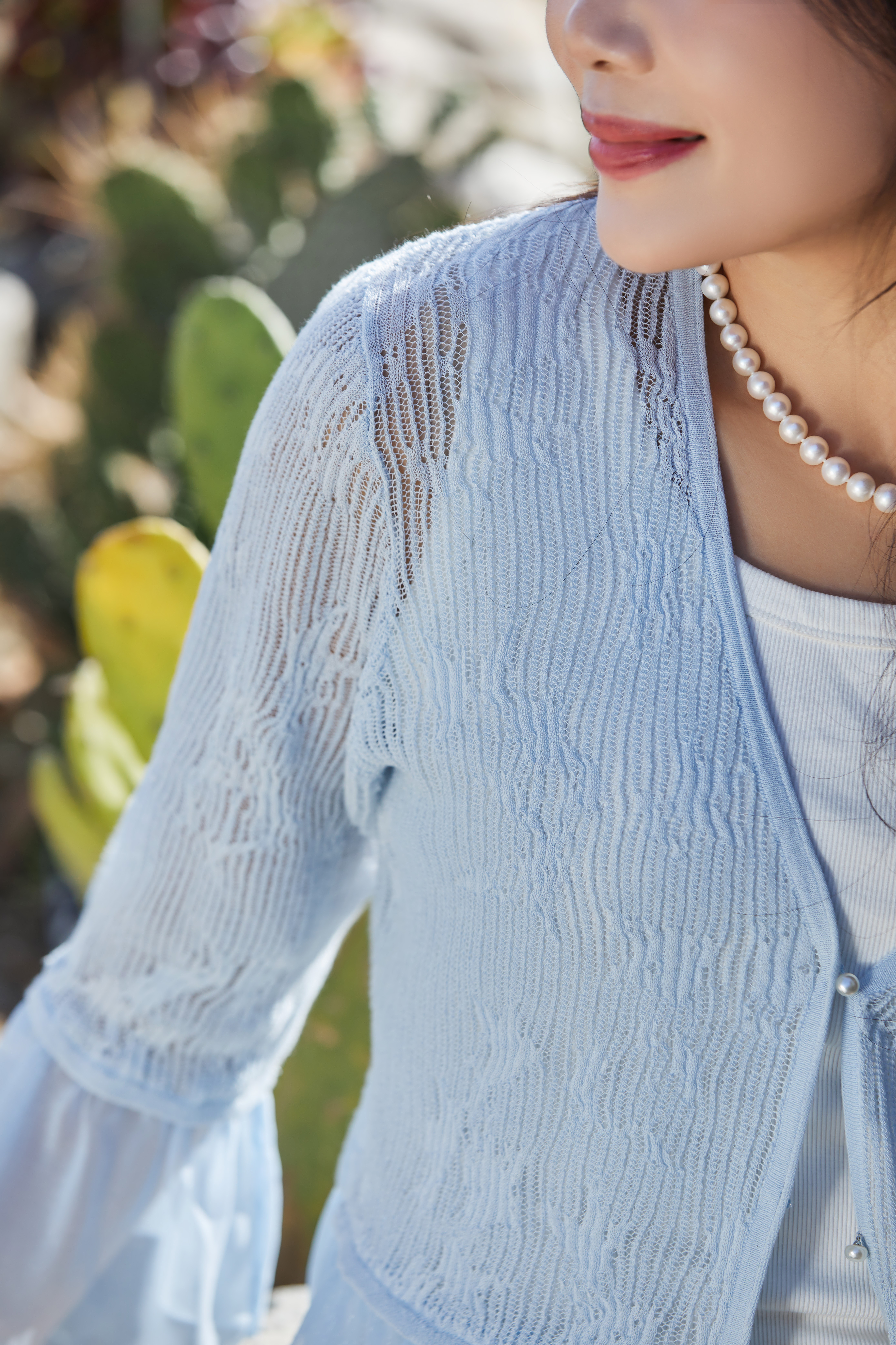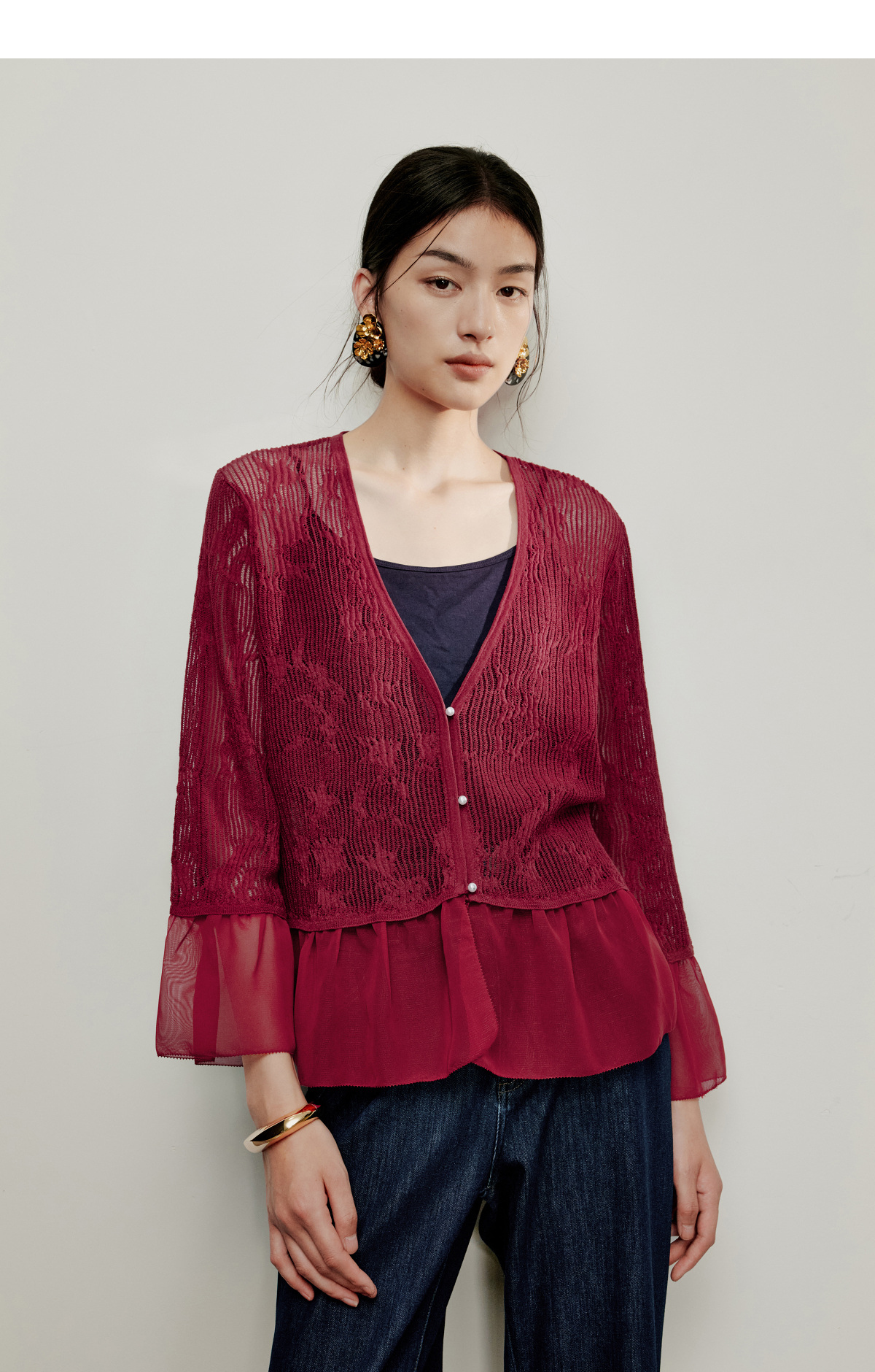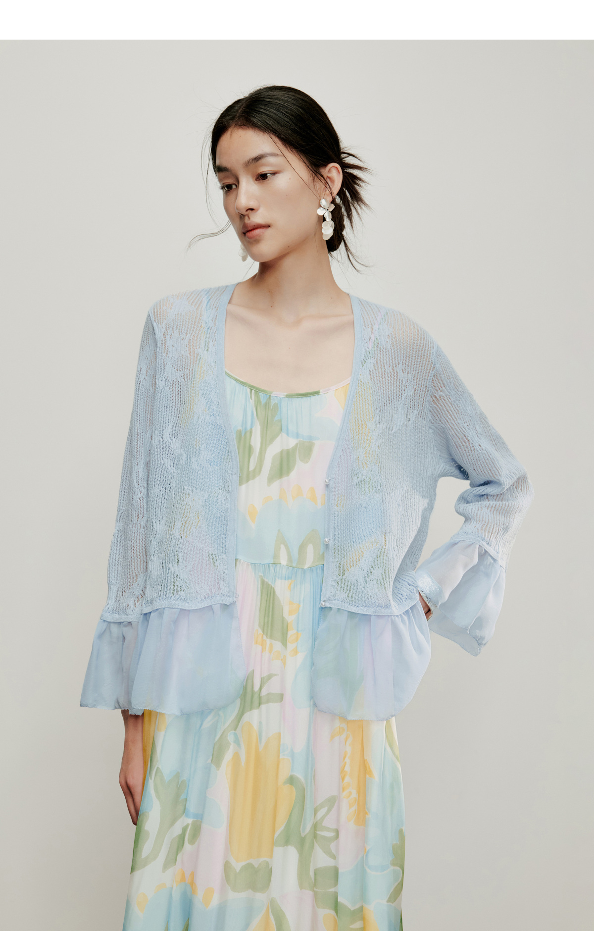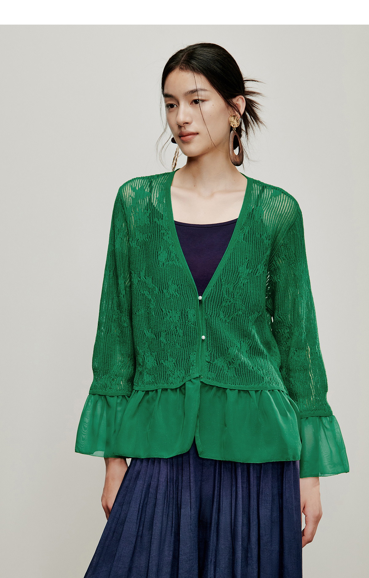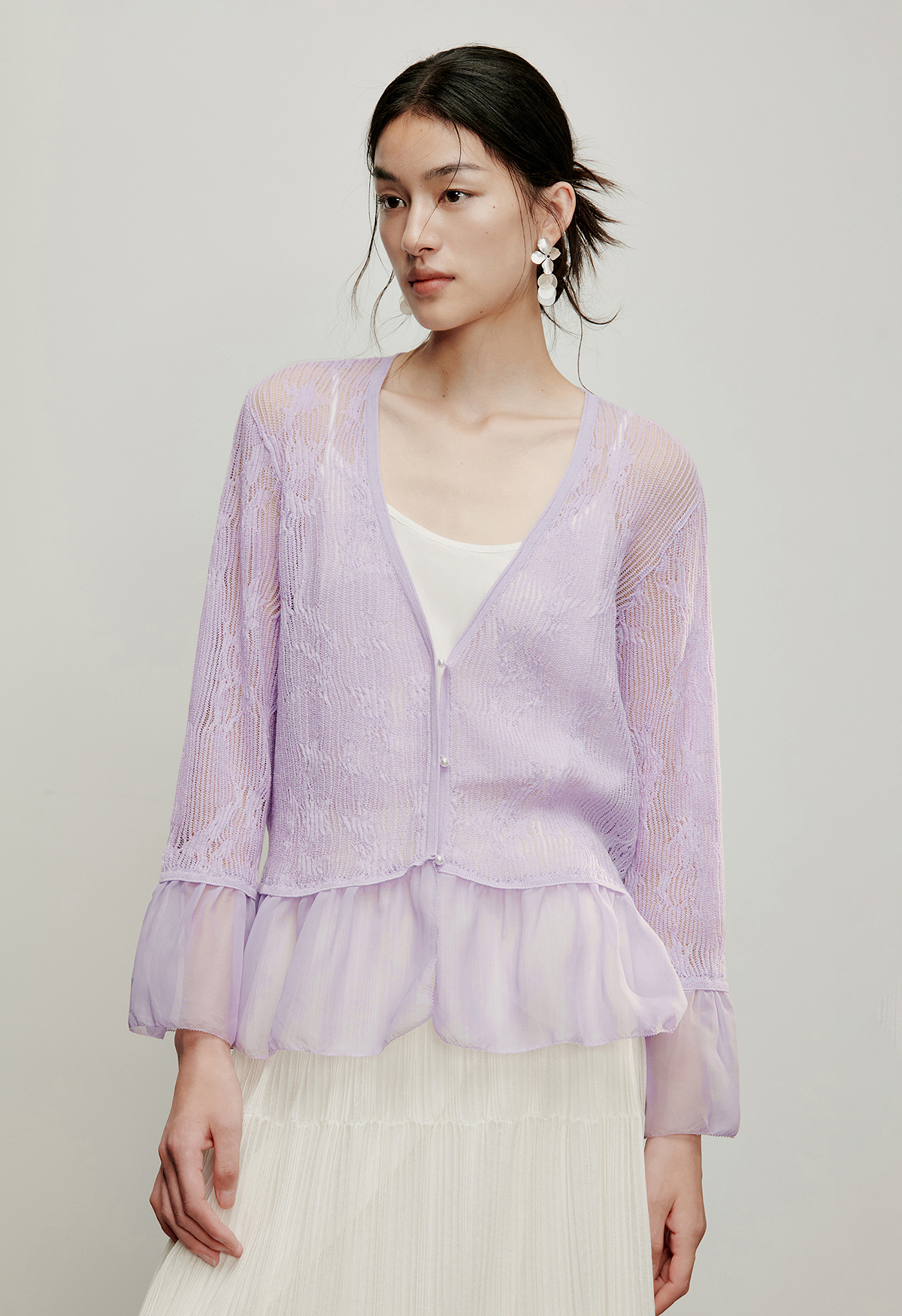 【林栖设计小店】流水潺潺|优雅多色镂空肌理拼荷叶边2026夏新款毛织外套1962172