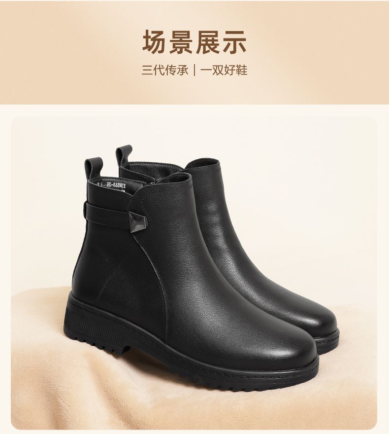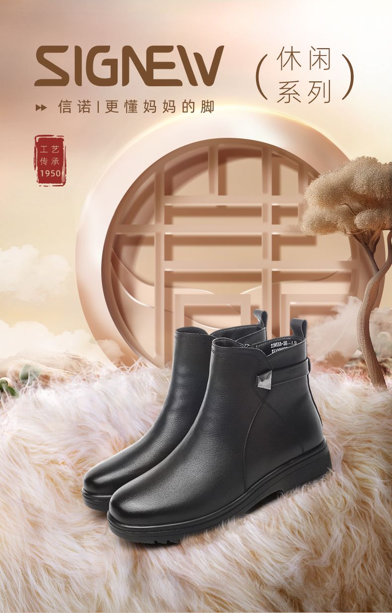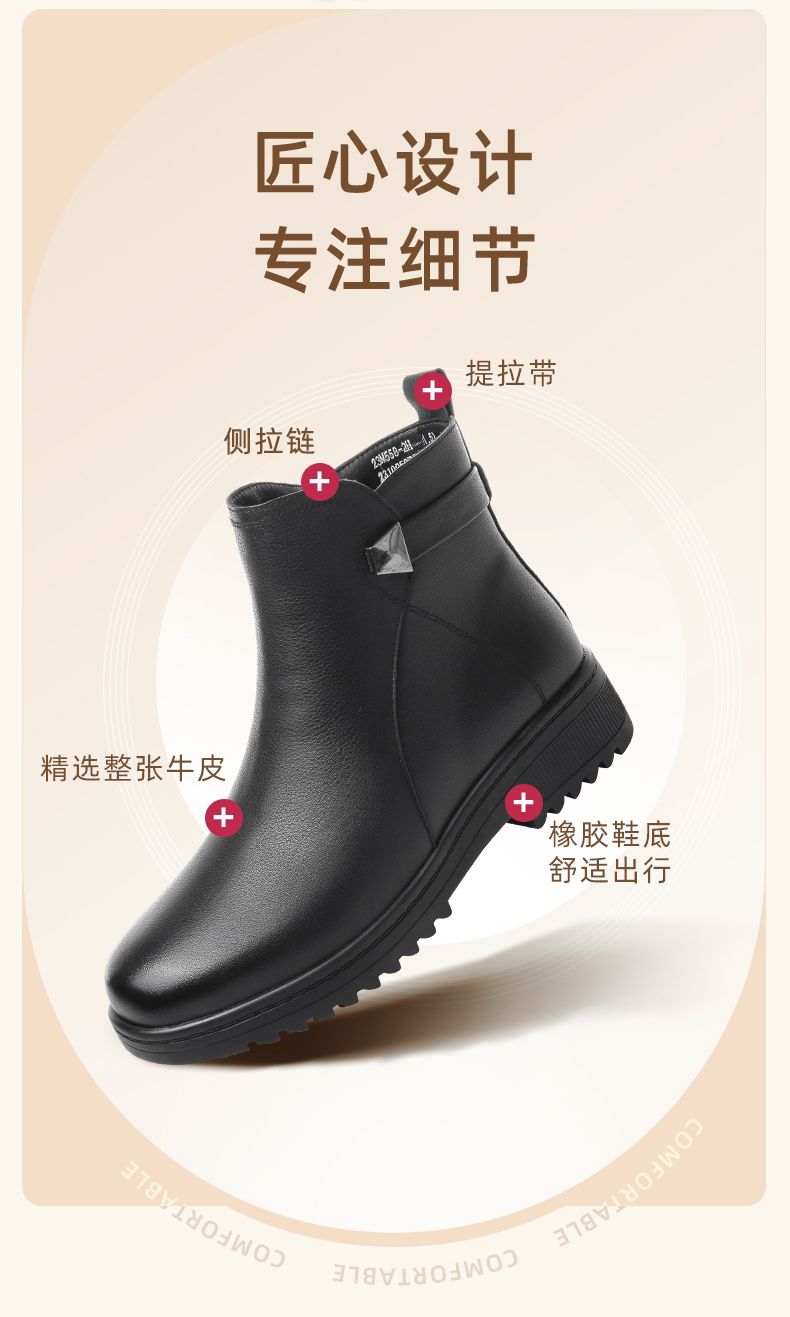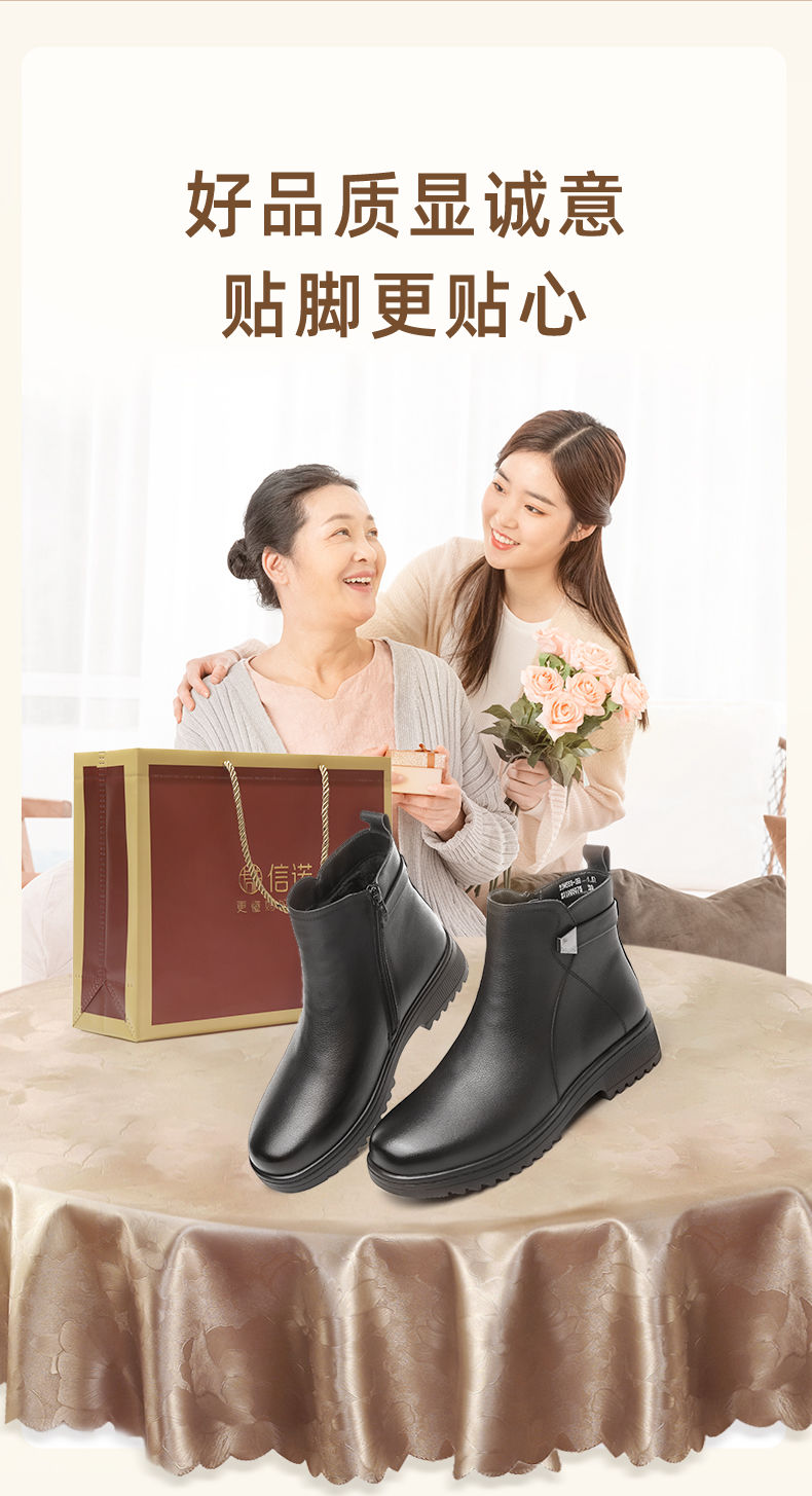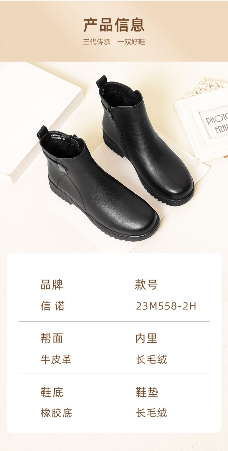 信诺妈妈棉鞋2023新款冬季真皮舒适加绒保暖靴子加厚中老年女短靴23M558-2H
