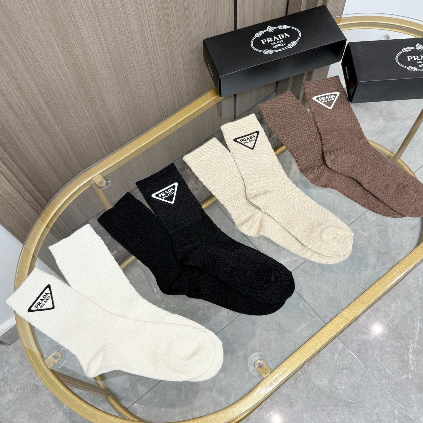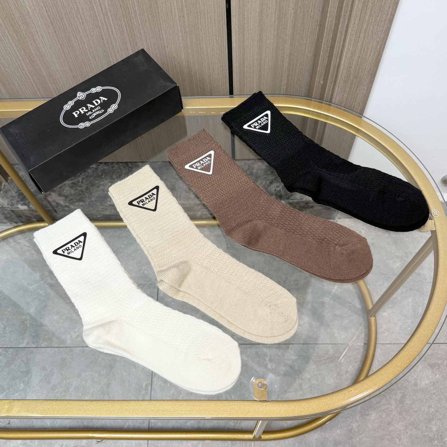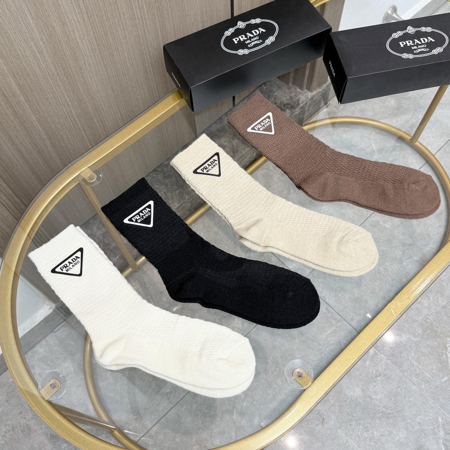 秋冬特惠💰150【一盒四双】普拉达高版本袜子 ~好看到爆炸 粗针羊绒烫印中筒袜