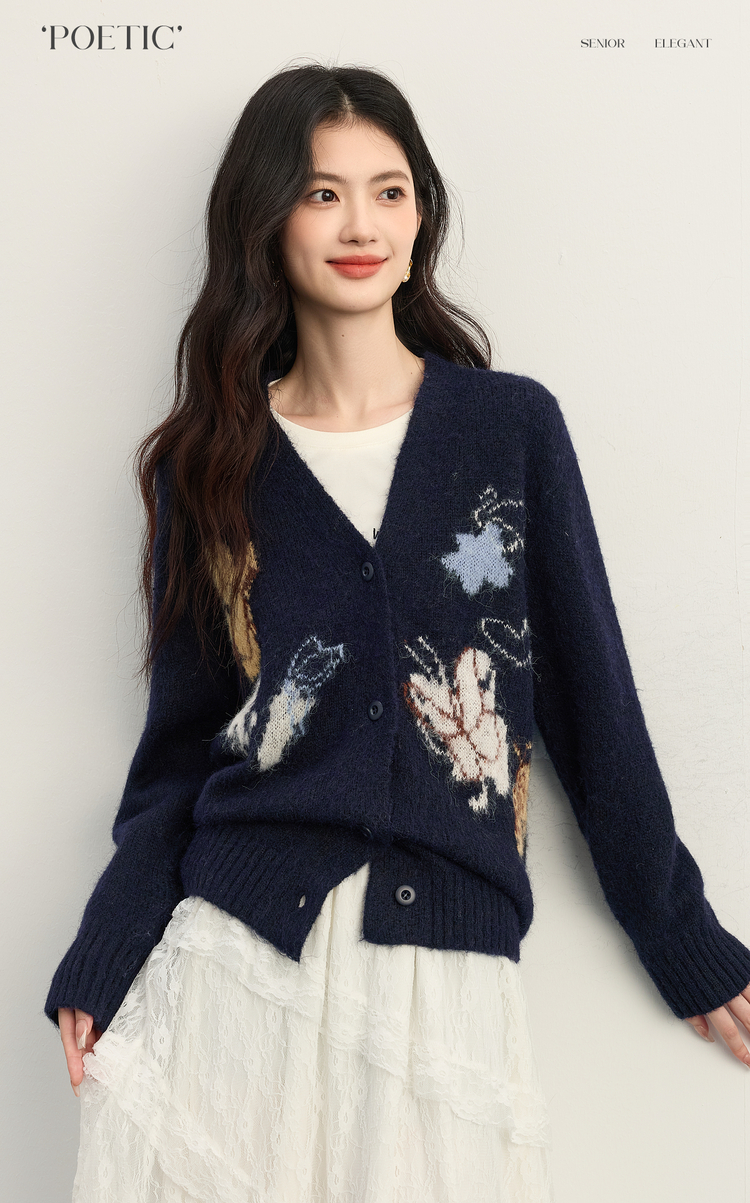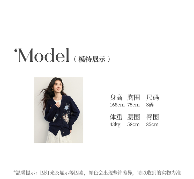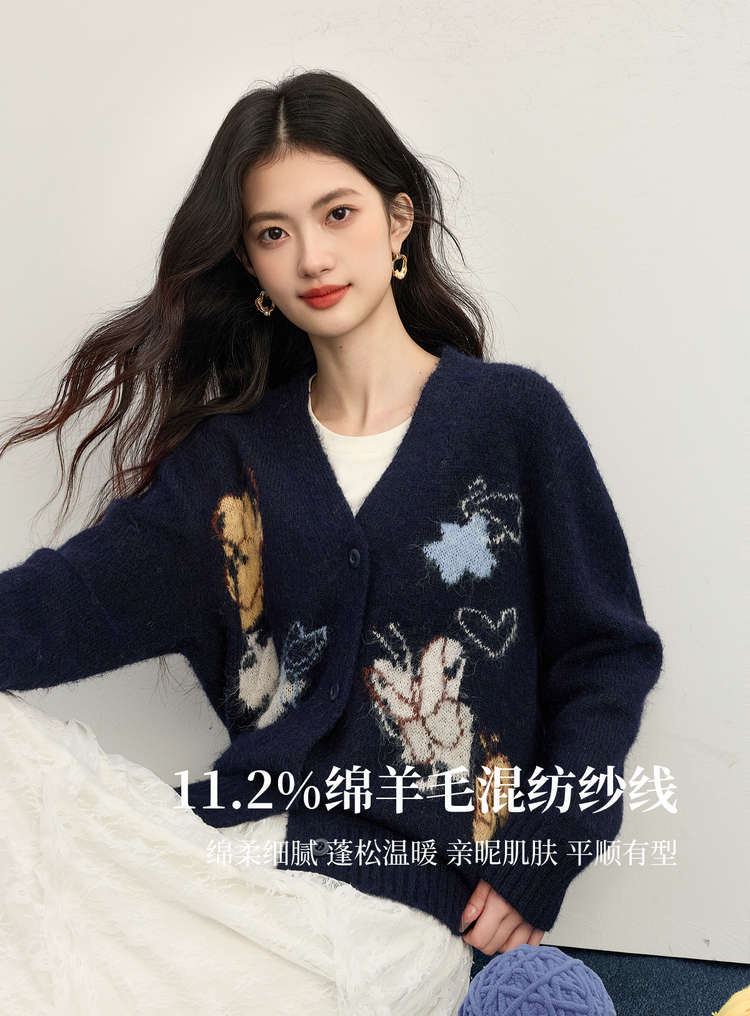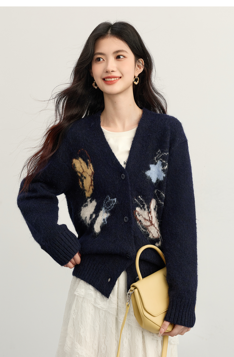 【周末秒杀】熙世界蝴蝶提花V领毛衣外套女秋冬设计感慵懒风软糯羊毛针织开衫